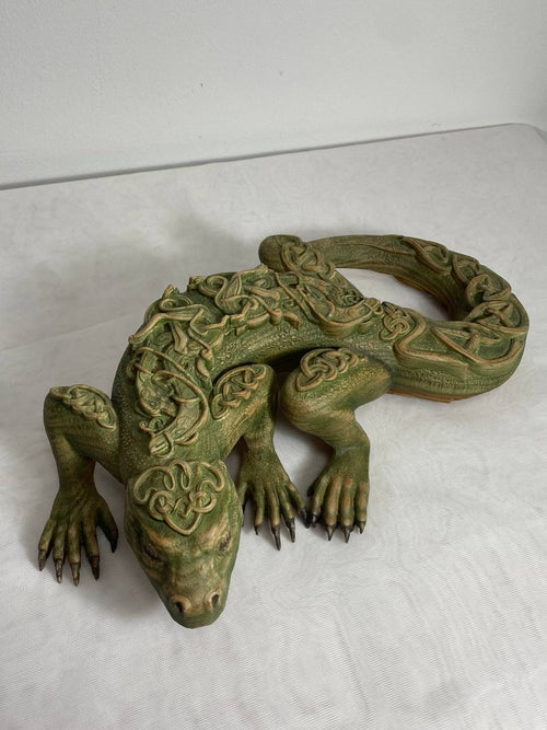 We want to present you a unique work of art - a wooden statue of a green lizard, the figurine has a natural pose corresponding to its natural environment . The textured surface of the statue skin is covered with embossed golden carved patterns, each carved pattern is made at a high professional level, which gives the lizard figure realism and sophistication .The figurine of a green lizard is made of natural sustainable wood.