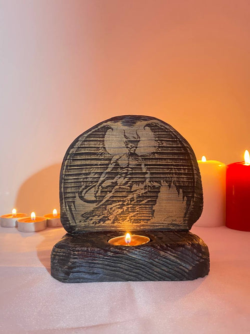 Crafted from natural wood, this candle holder offers durability and a warm, organic aesthetic. The advanced laser engraving technology ensures sharp, contrasting lines that meticulously capture every intricate detail of Lucifer’s form, highlighting his seated position as a representation of authority and power. The finely spread wings and prominent horns solidify his image as the ultimate ruler of darkness.