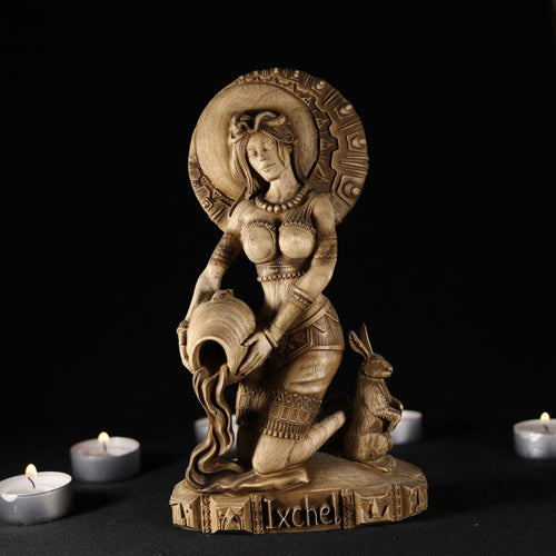 This wooden Ixchel statue is a mesmerizing work of art, intricately carved with the essence of ancient mayan and aztec craftsmanship. Inspired by the mighty Ixchel, the mayan goddess and revered moon goddess, this statue embodies the sacred feminine and the divine power that she represents.