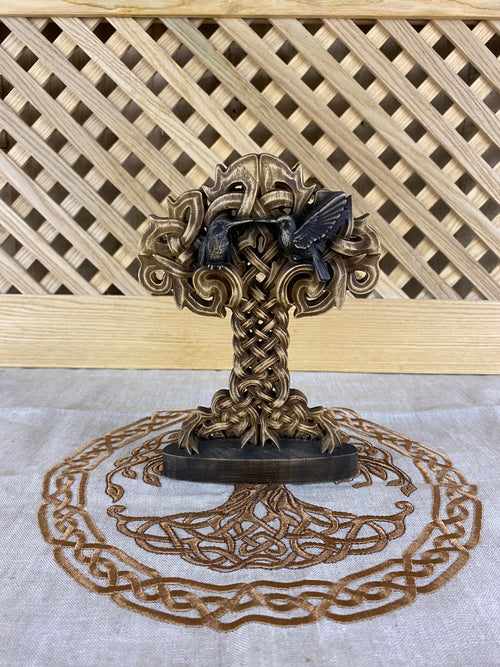 The wooden statue of a Celtic tree and birds with carvings of intertwined Celtic knots and birds has a wonderful symbolic look, reflecting the connection between life and nature in Celtic mythology. The statue depicts the tree of life in Celtic symbolism, which reflects the connection between heaven and earth, as well as between people and the spiritual world. The tree has branches that are interlocked and stretch to the sky, symbolizing various aspects of life and interconnections in nature. The statue uses intertwined Celtic knot, reflecting the complexity of mutual relationships and interconnectedness of all life processes. These knots look like intriguing, complex patterns that reflect the multilayered nature of life and nature.On the branches of the tree are statues of birds symbolizing freedom, rebirth and spirituality. They are used as messengers between worlds and bringing good news. The carving of the Celtic tree is detailed and complex, taking into account the texture of the tree, knots and birds. All the details are reproduced with attention to traditional Celtic art and symbolism. The Celtic statue is carved from natural wood.
