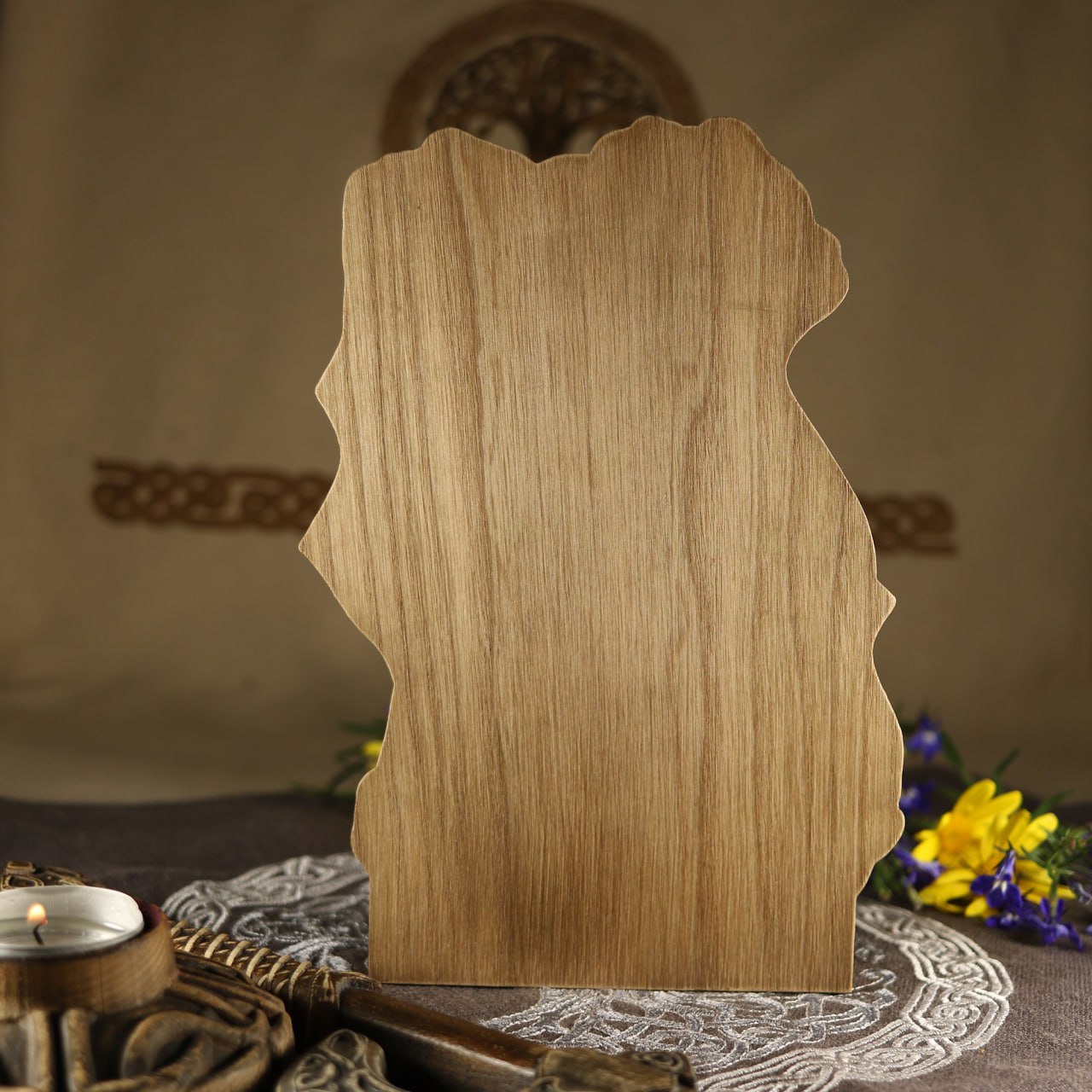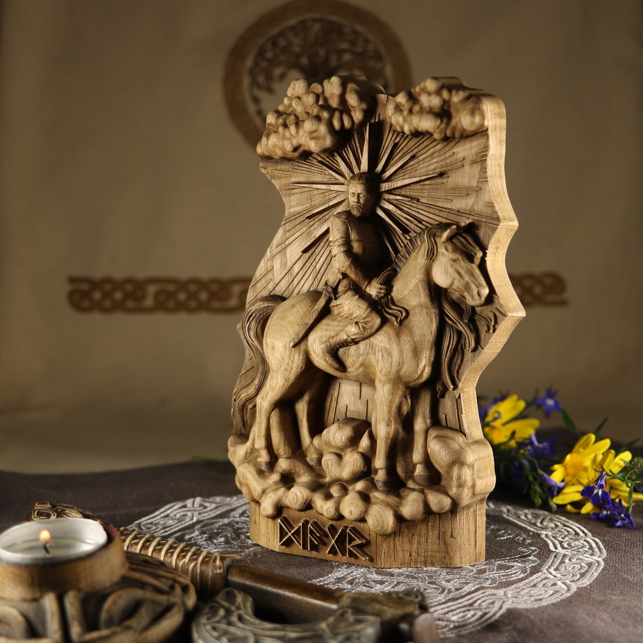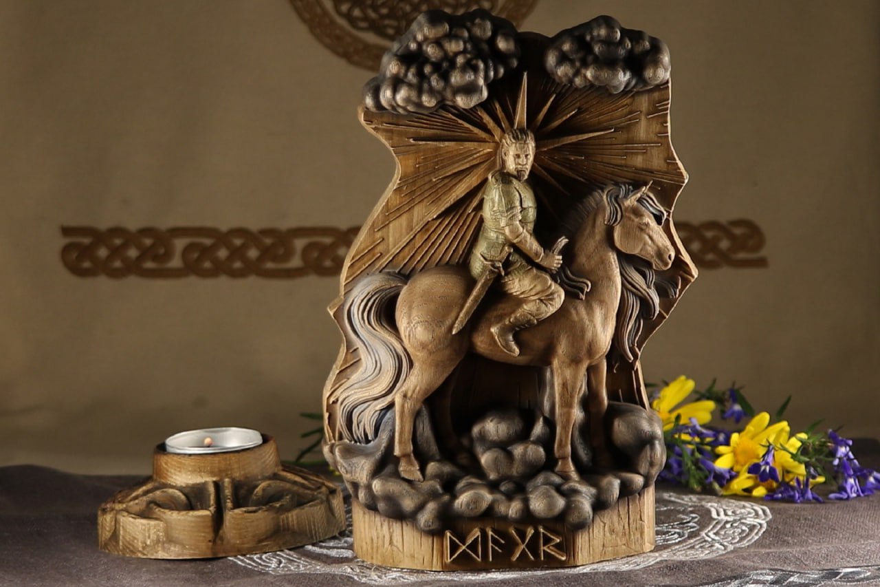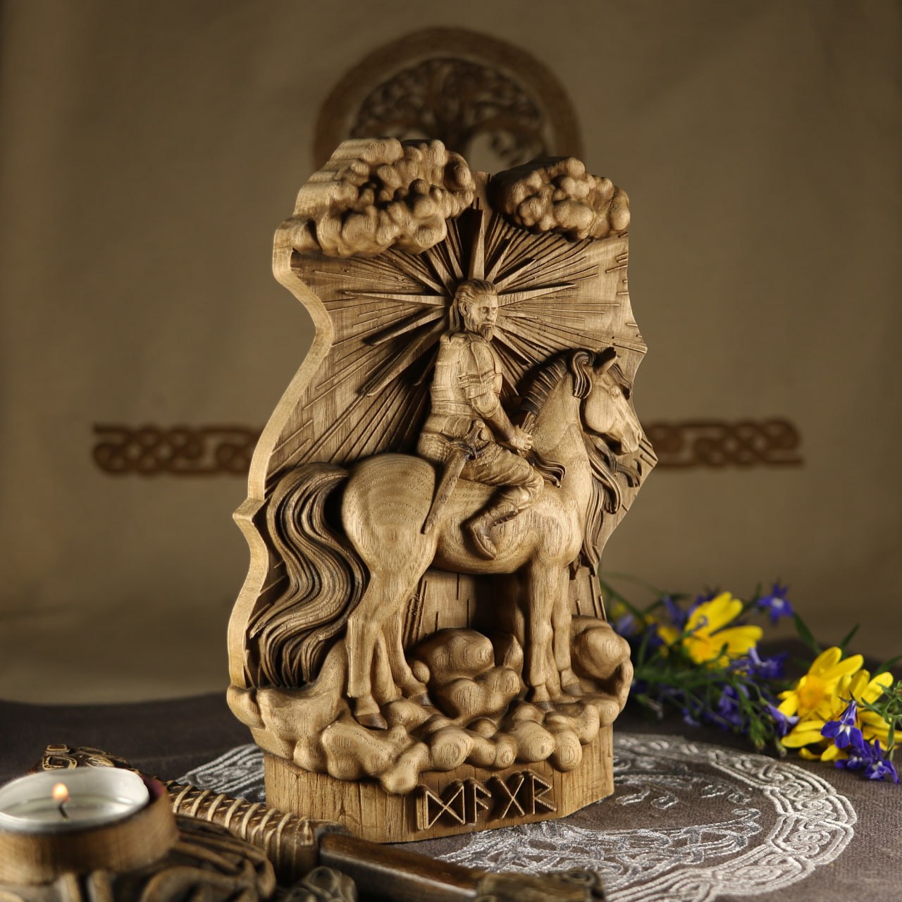 Dagr is the divine personification of the day in Scandinavian mythology wood carving norse statue from ecological material.