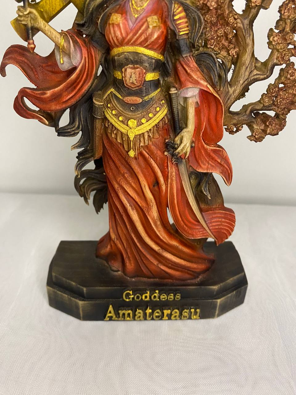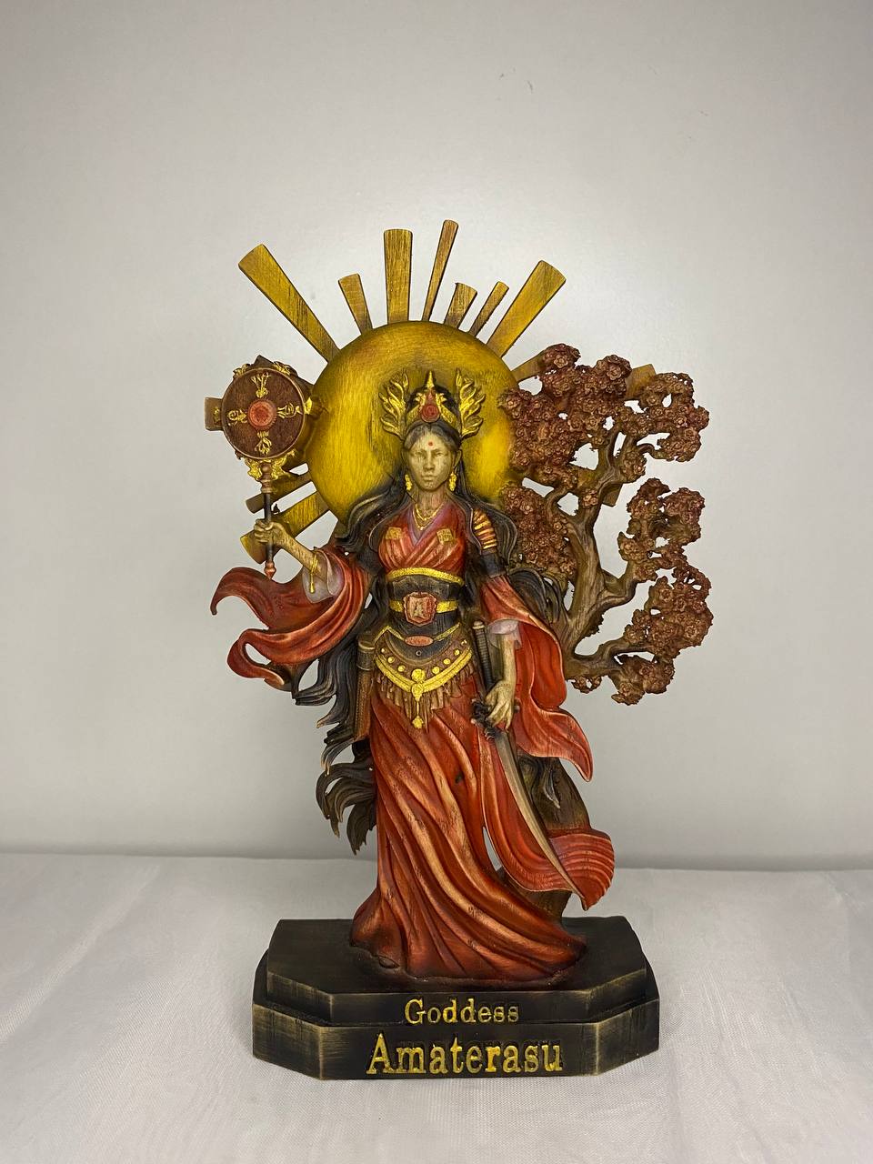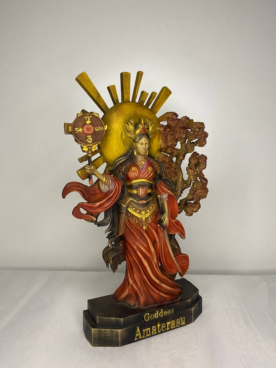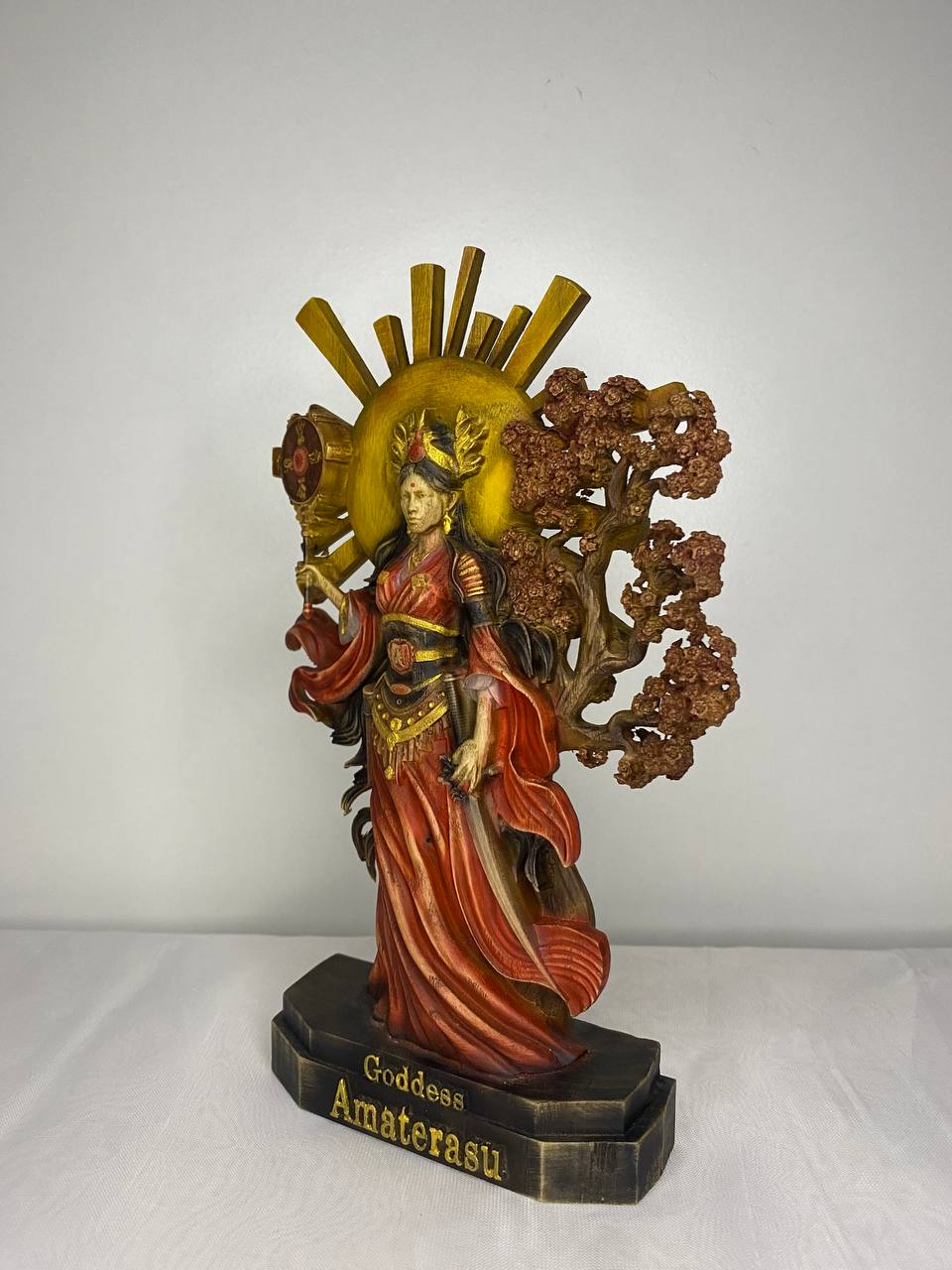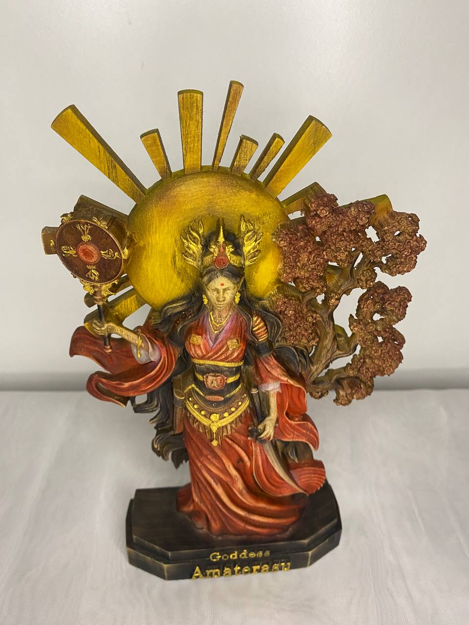 Bring the light and blessings of the sun goddess Amaterasu into your home with this elegant wooden statue — a unique work of art and a symbol of divine energy.