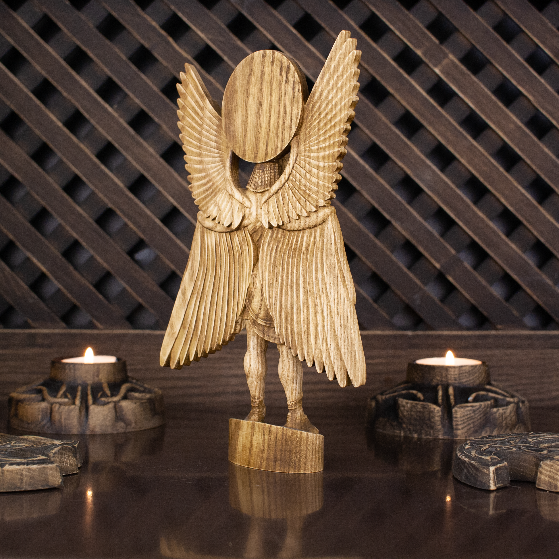 The god is represented in traditional Sumerian ceremonial clothing and jewelry, which adds to the authenticity of his image. He stands on a pedestal, which has a symbolic meaning, emphasizing his greatness and importance in the pantheon of Sumerian gods. The statue is made of natural wood.