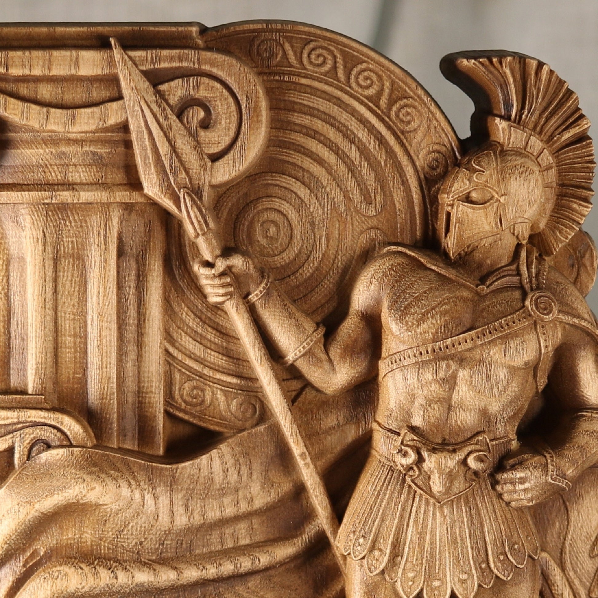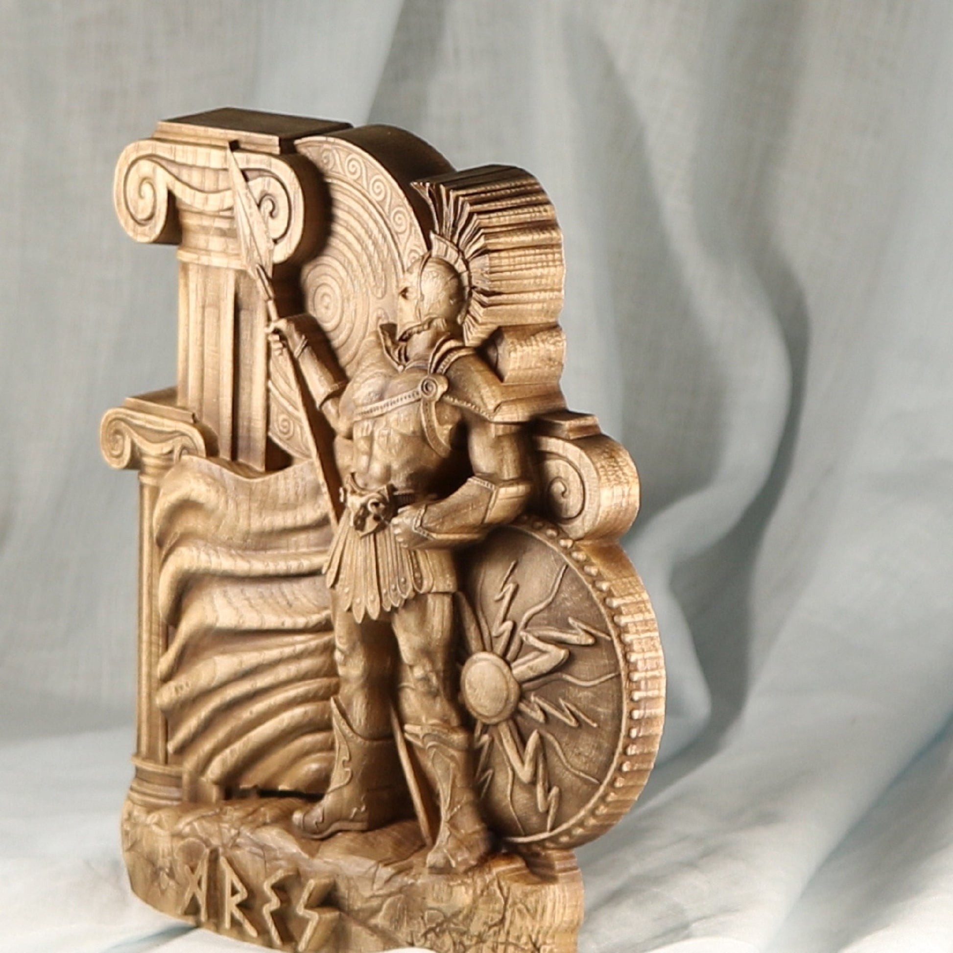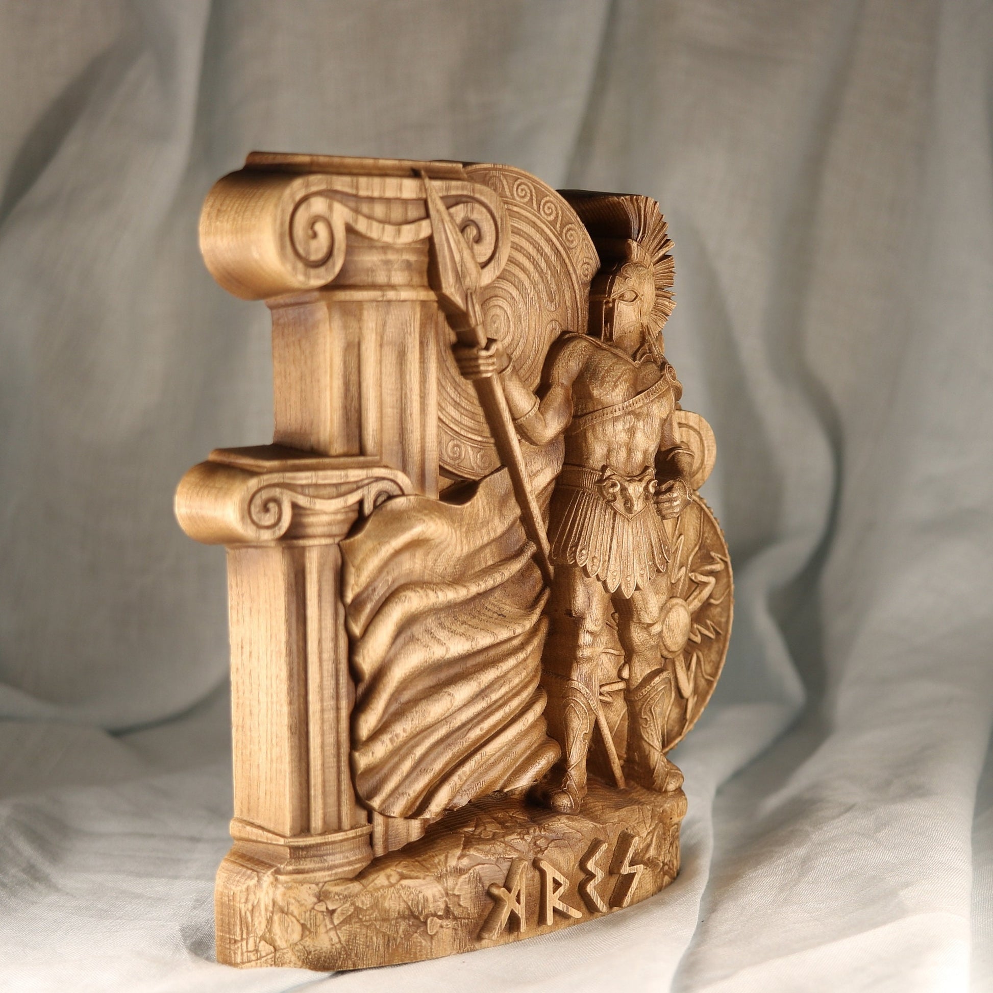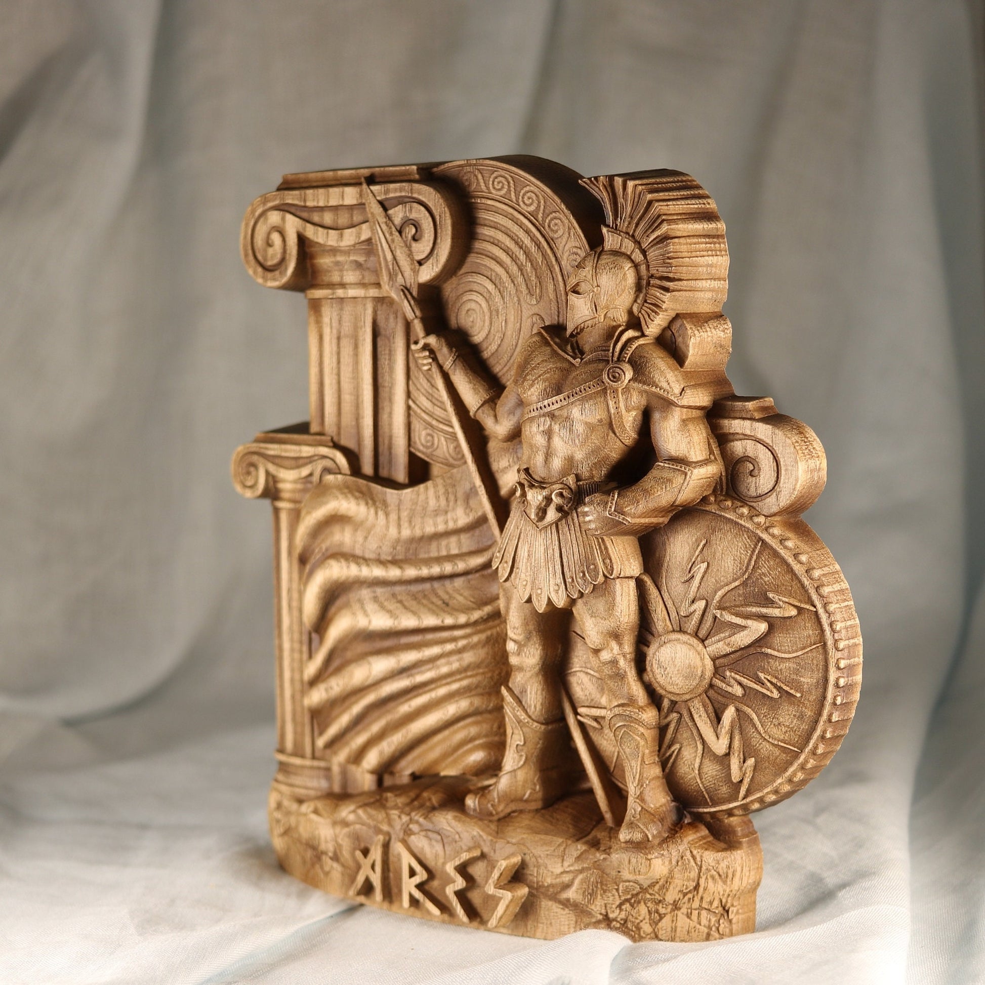 Ares, the Greek god of war, is a handmade wooden statue carved from ecological material. The statue is made from an ash tree and coated with varnish. Ares is a powerful and strong deity who represents courage and strength in battle. This piece is perfect for anyone who wants to display their strength and power.