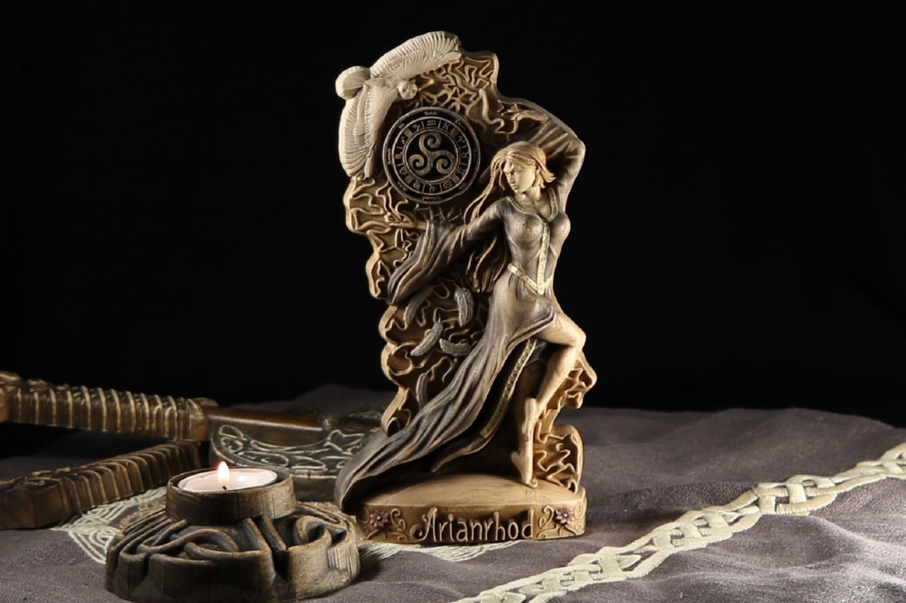Arianrhod, known throughout the Celtic lands, can transform into an owl and rule over the moon, stars, and sea. Being the goddess of predictions and dreams, she allows petitioners who turn to her with an open heart and mind to look into the past and into the future for a second. Arianrhod, who also has reincarnation, karma, and magical realms, meets the dead and leads them to the next level of existence. She is the main embodiment of power and female power, and her role as the keeper of time is represented by the wheel of the year. Arianrhod is one of the five goddesses of Avalon along with Blodwedd, Brenwen, Cerridwen, and Rhiannon.