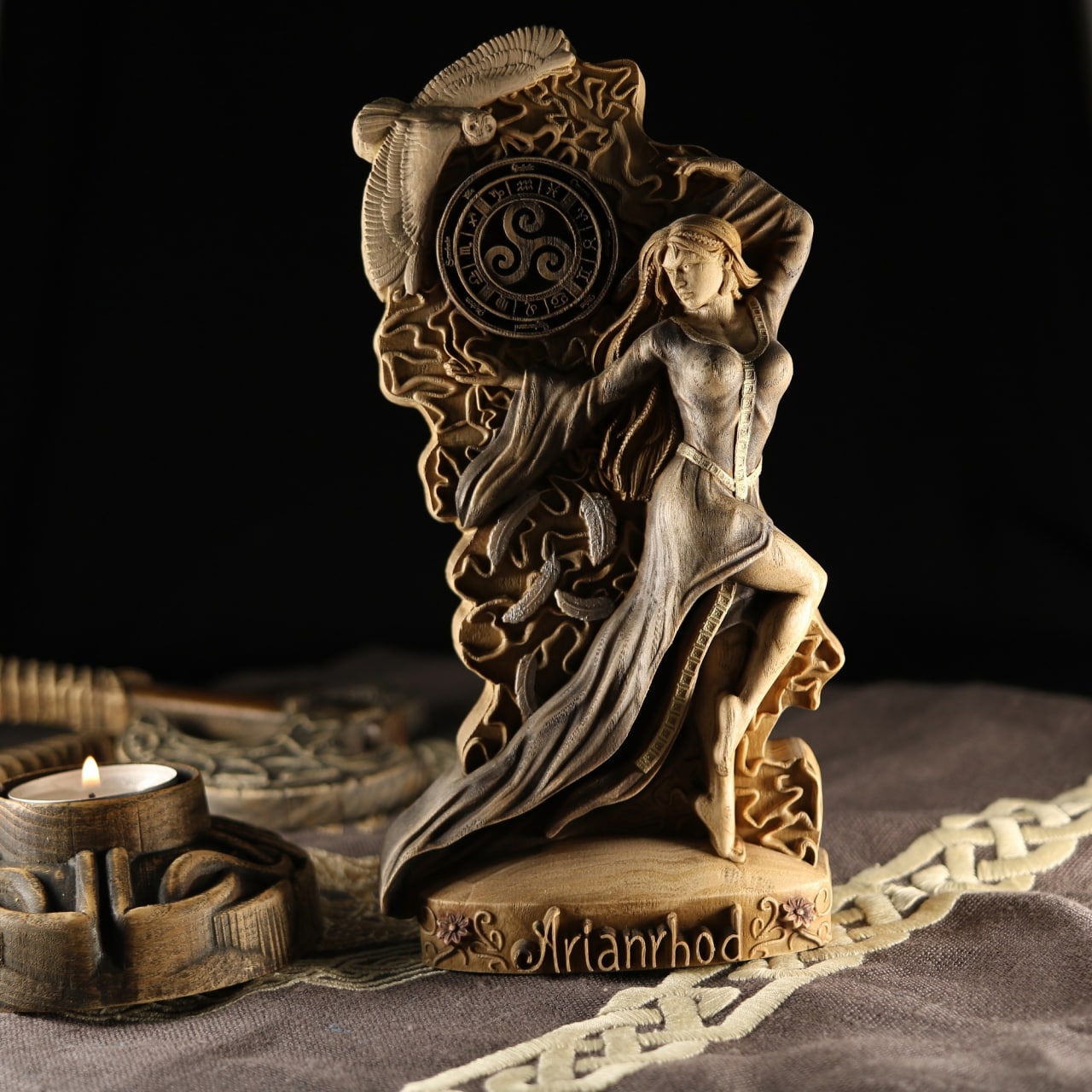 Arianrhod, the Welsh goddess of the moon, handmade wooden statue carving from ecological material. Arianrhod was the Celtic goddess of fertility goddess, rebirth and the weaving of cosmic time and fate, handmade wooden statue, statue carved from ecological material.