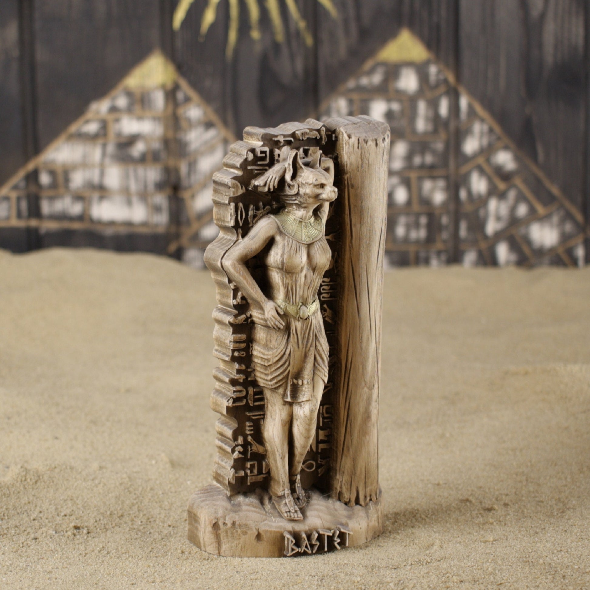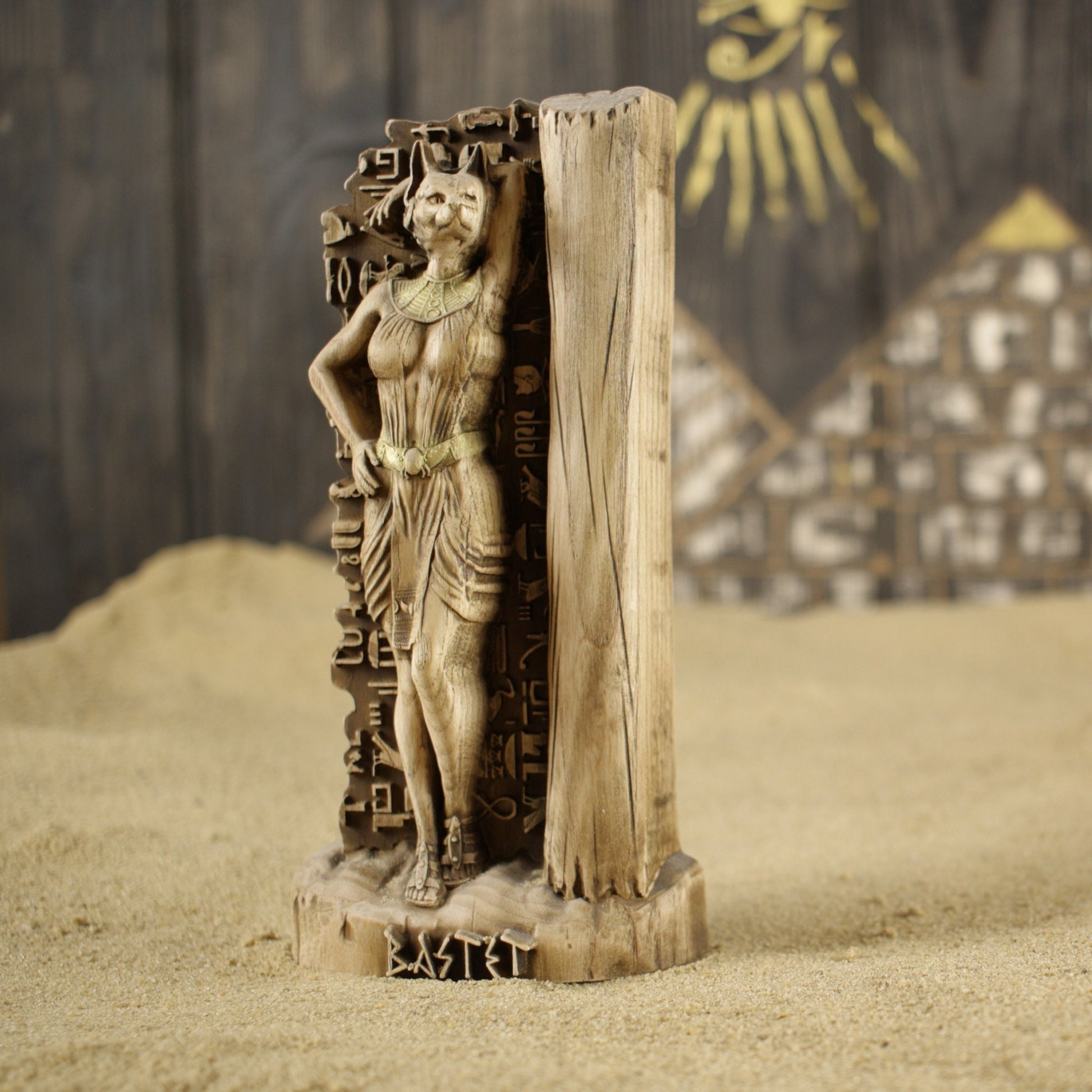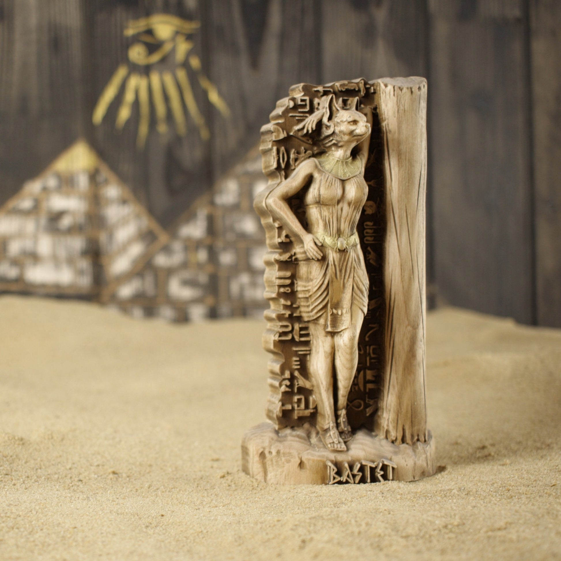 Bastet, the ancient Egyptian goddess of joy, fun, and love, female beauty, fertility, hearth, and cats, handmade wooden statue carved from ecological material.