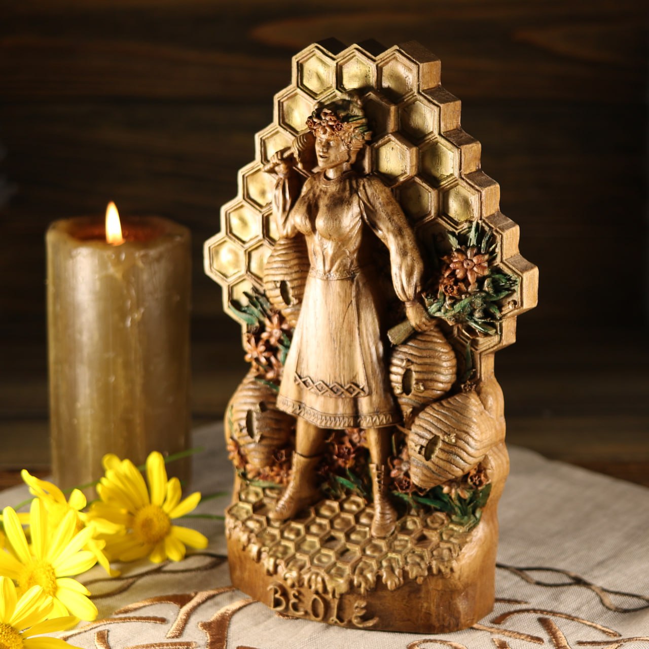 Béole is the Norse goddess of bees, and this beautiful wooden statue is a perfect way to honor her. Carved from ecological materials, this statue is coated with varnish to protect it from the elements. Standing 8 inches tall, this statue makes a great addition to any home or office.