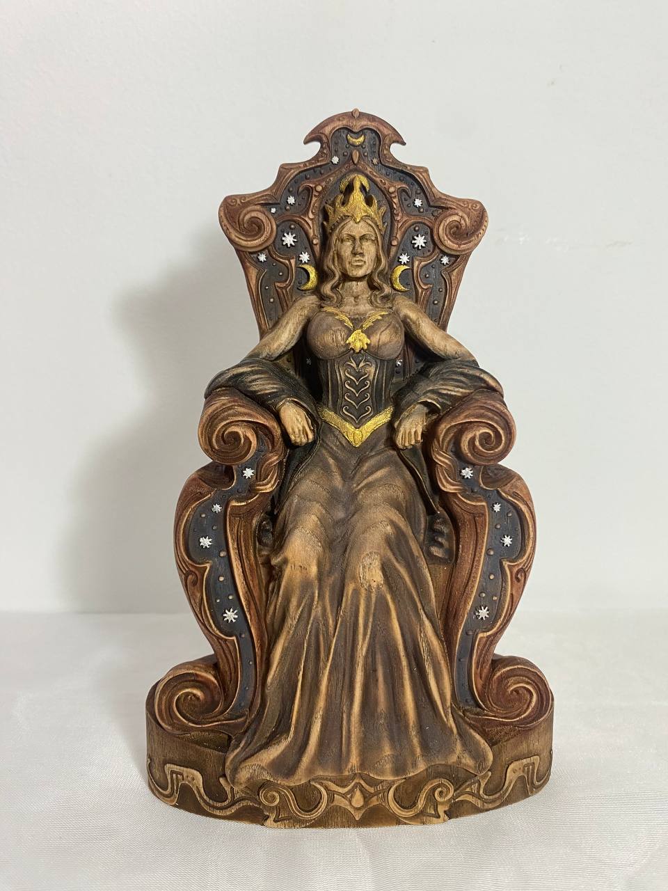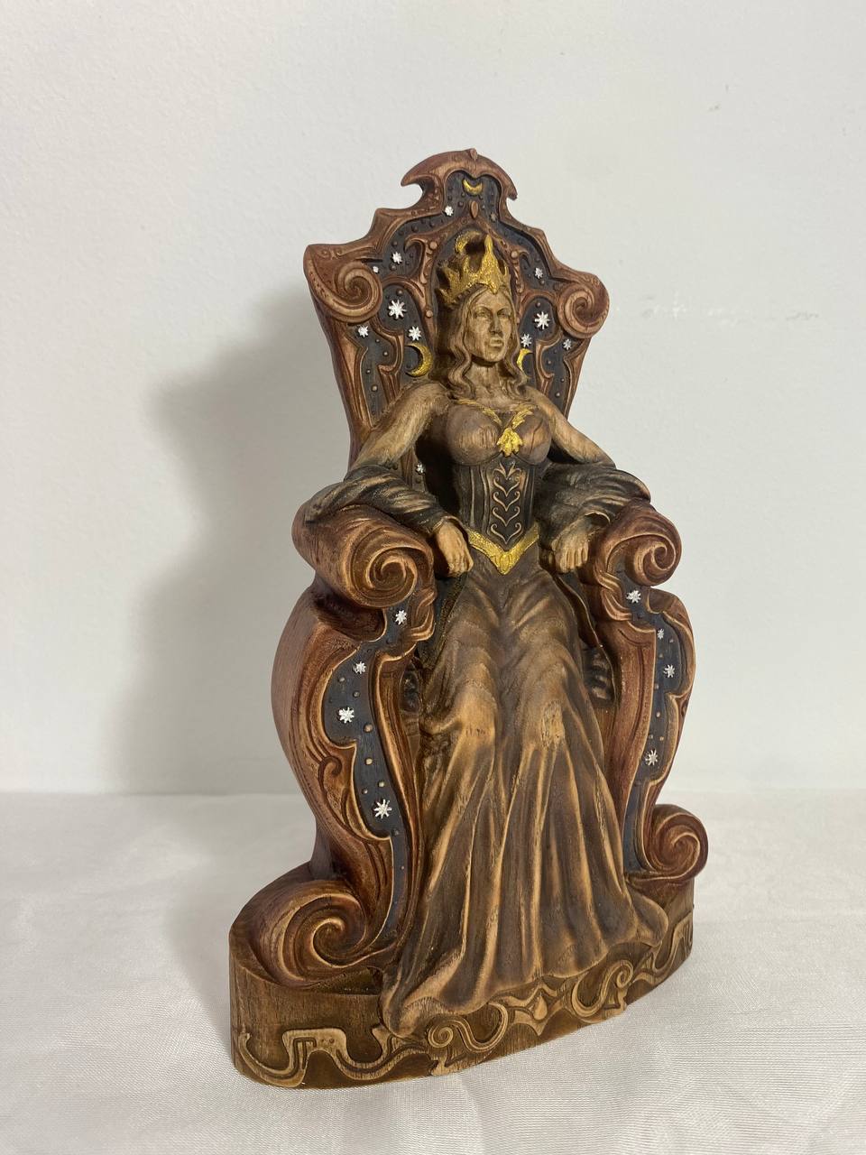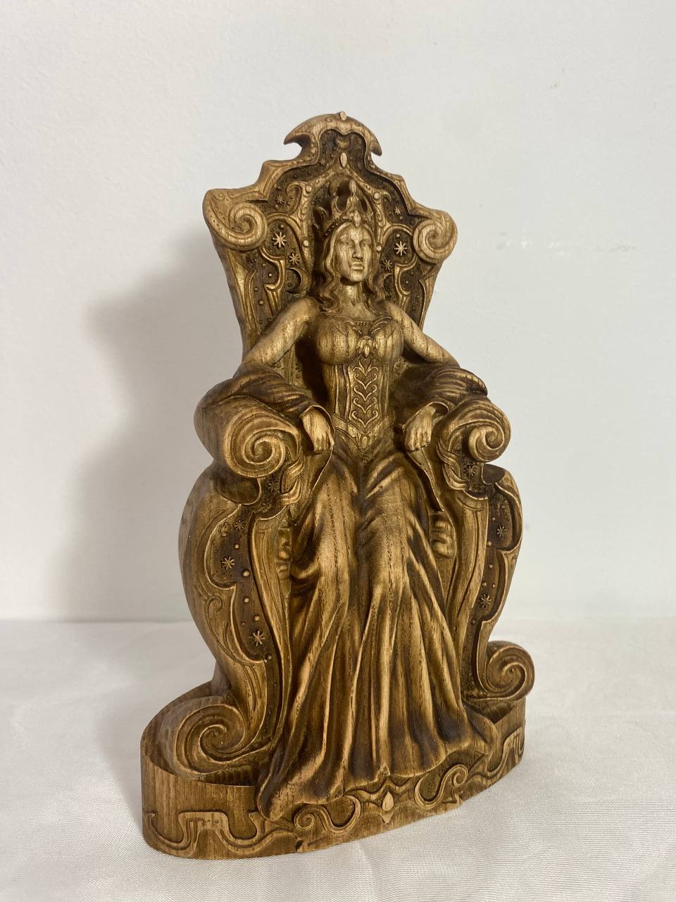 This elegantly crafted wooden goddess statue embodies sovereignty, wisdom, and divine authority. Seated on a regal throne with a crown upon her head, she represents the sacred connection between ruler and land. Each statue is meticulously hand-carved, ensuring precise details and a unique artistic expression.
