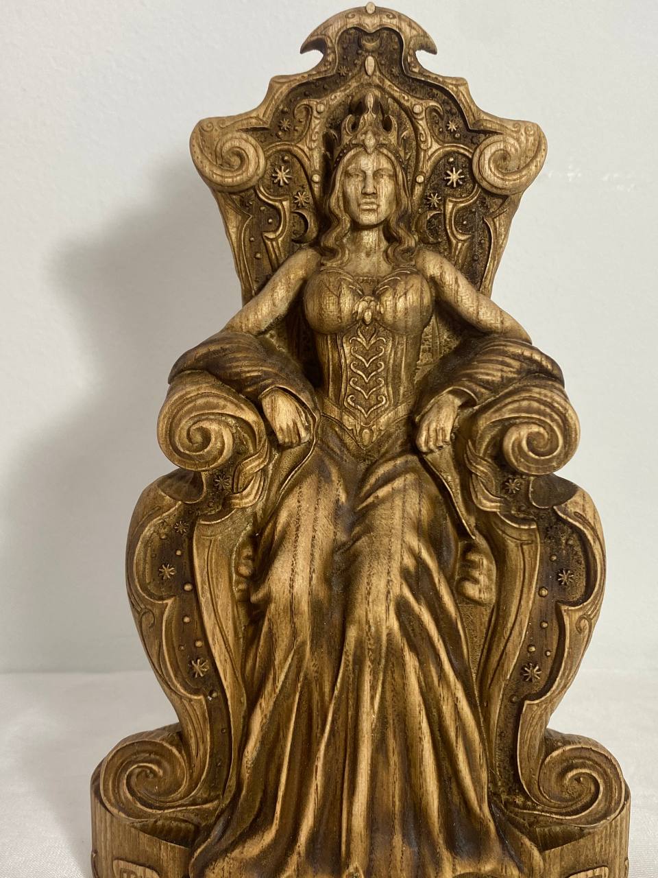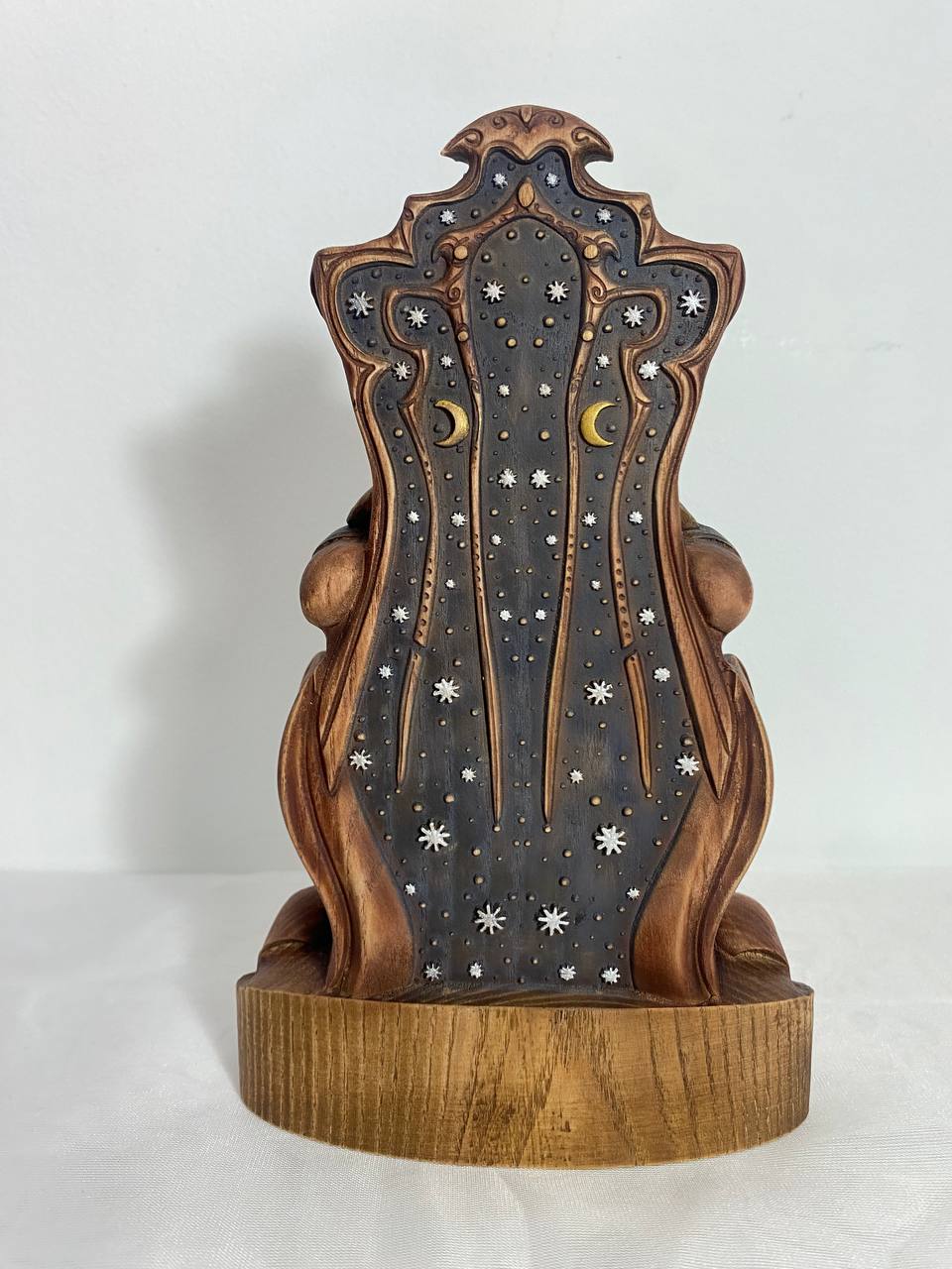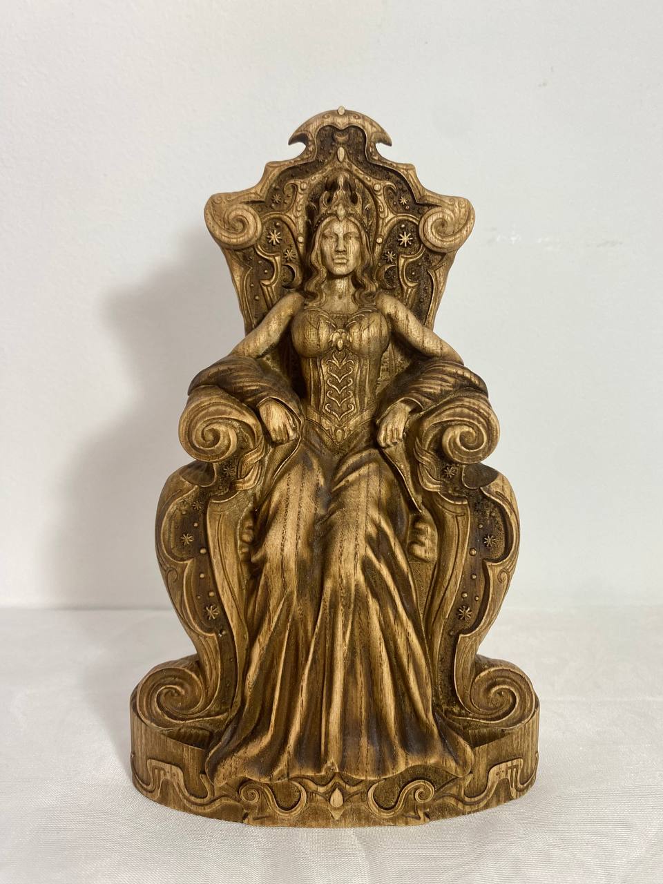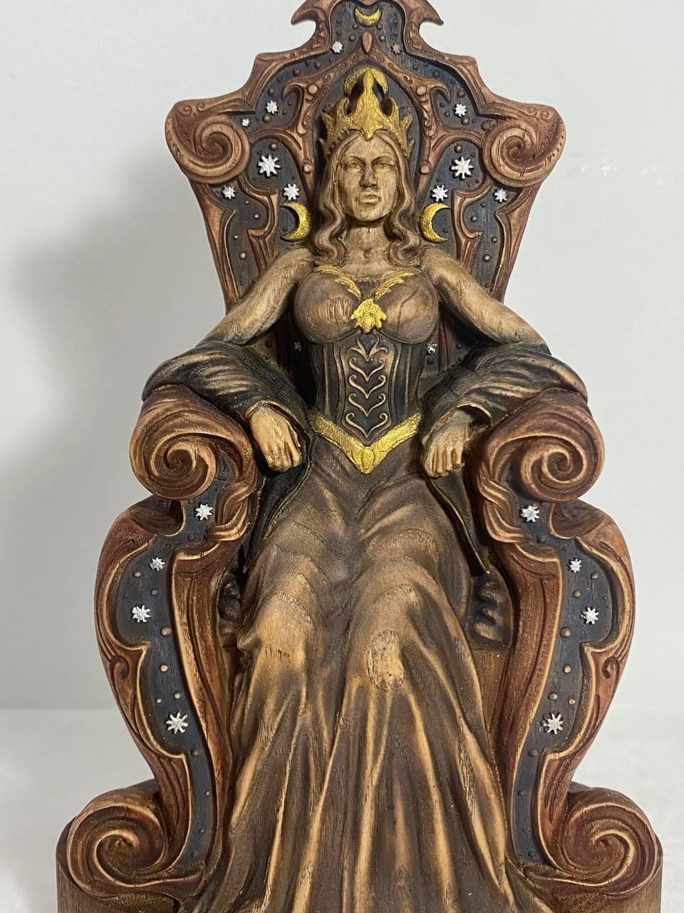 This elegantly crafted wooden goddess statue embodies sovereignty, wisdom, and divine authority. Seated on a regal throne with a crown upon her head, she represents the sacred connection between ruler and land. Each statue is meticulously hand-carved, ensuring precise details and a unique artistic expression.