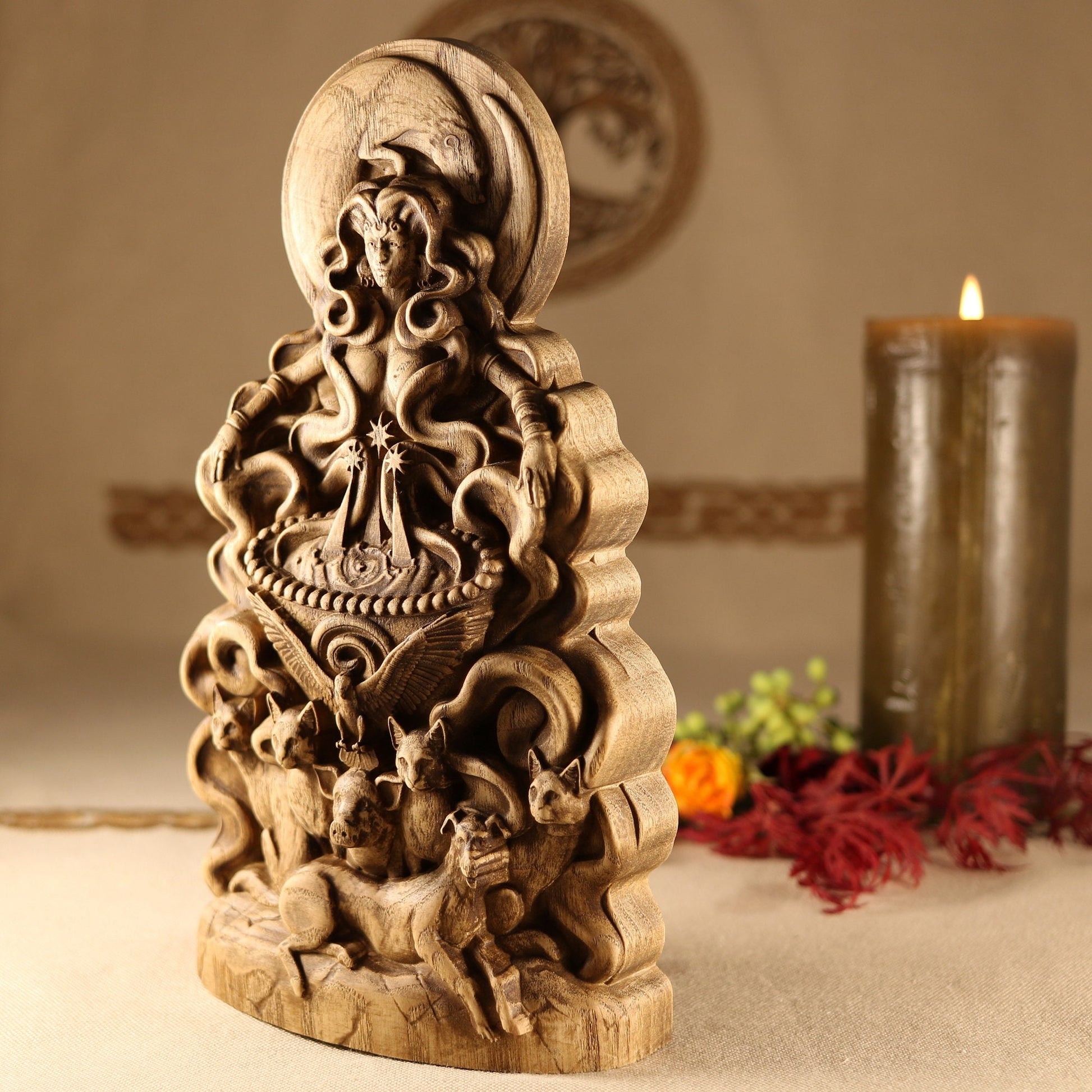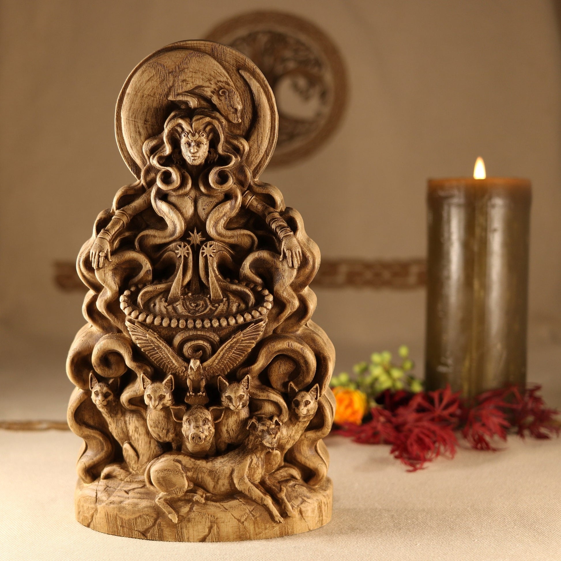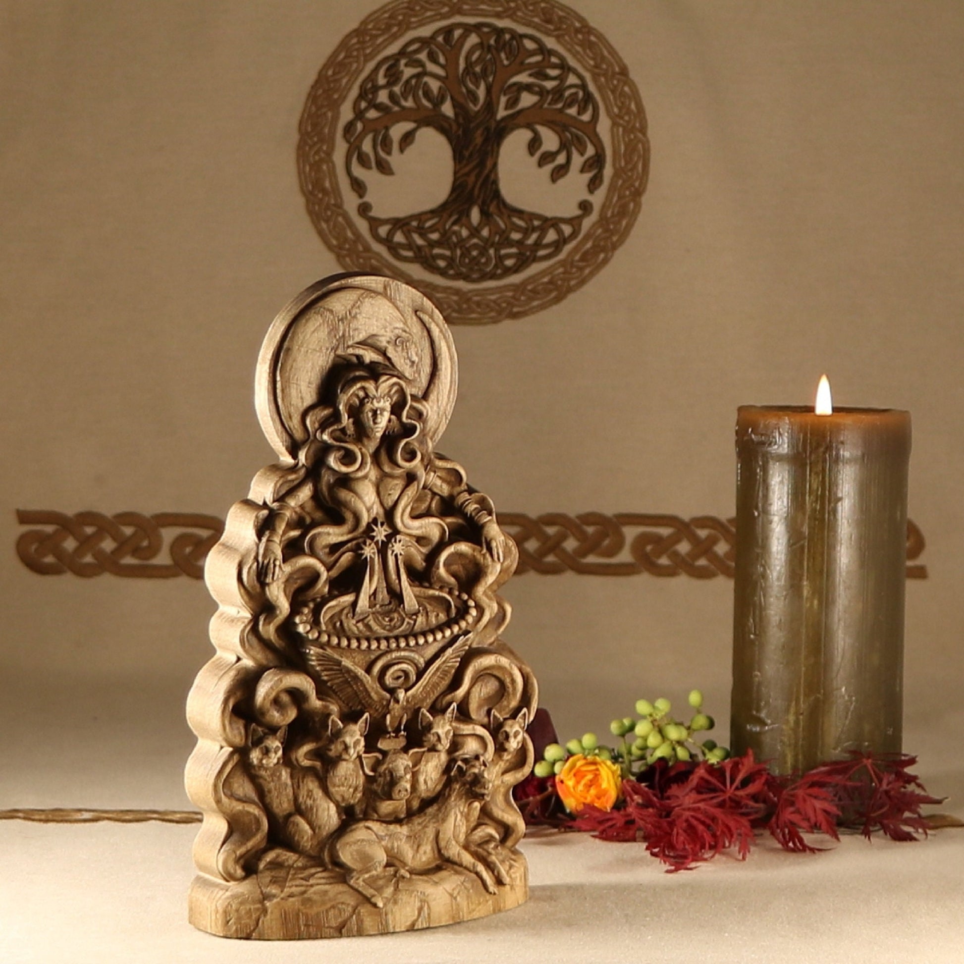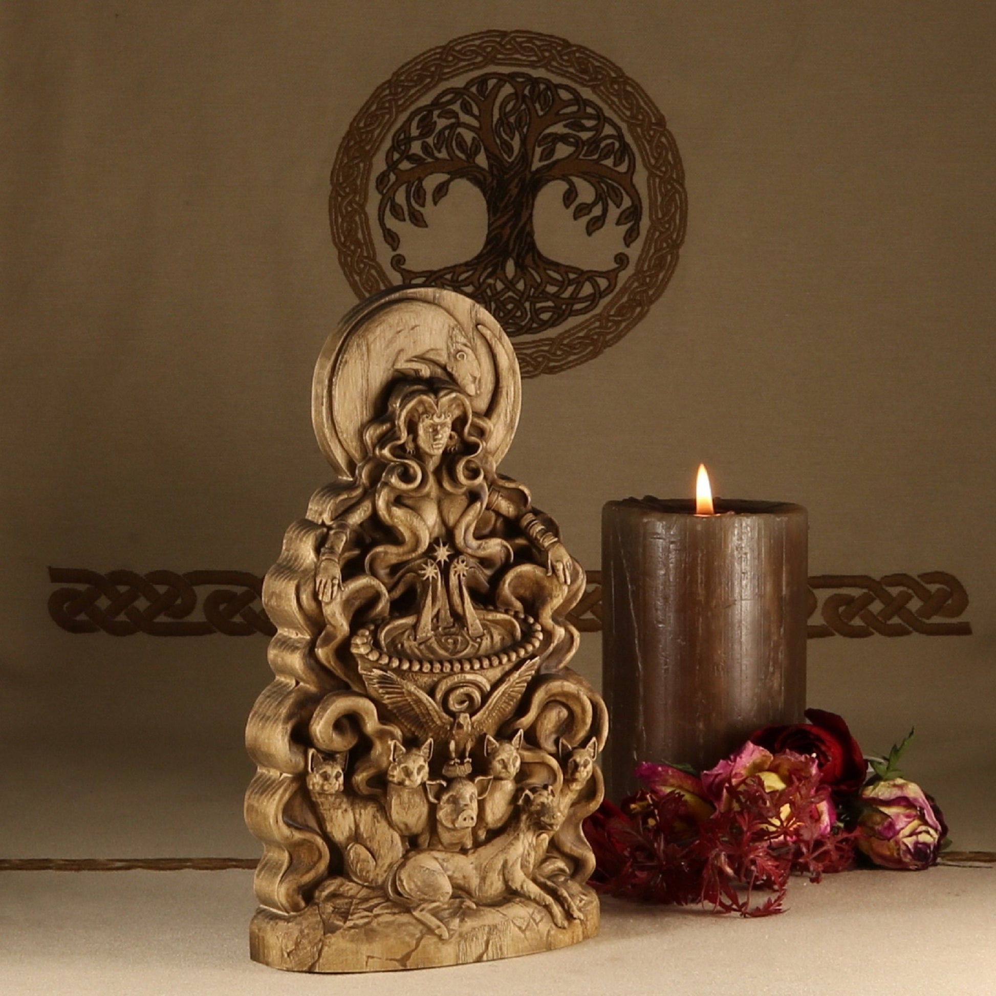 The statue is made according to the sketch Eilonwy le Fay Evernight is a traditional faerie folkloric witch, ordained High Priestess, death walker, occultist, illustrator, sculptor, and herbalist. She has a deep knowledge of world folklore, world mythologies, world religions, and many styles of witchcraft. She has been practicing witchcraft for over twenty seven years and has studied it very seriously as an occultist for twelve years. She studied illustration, character design, and sculpture at the Academy of Art University. Eilonwy le Fay Evernight uses their folkloric and mythological knowledge, as well as their spiritual experiences to design esoteric sculptures and illustrations that are heirloom worthy for any devotees altars. You can follow her on Twitter @EilonwyEvernig1, on Instagram at eilonwyevernight, and at her personal witchcraft shop soon to reopen BeyondShadows on Etsy.