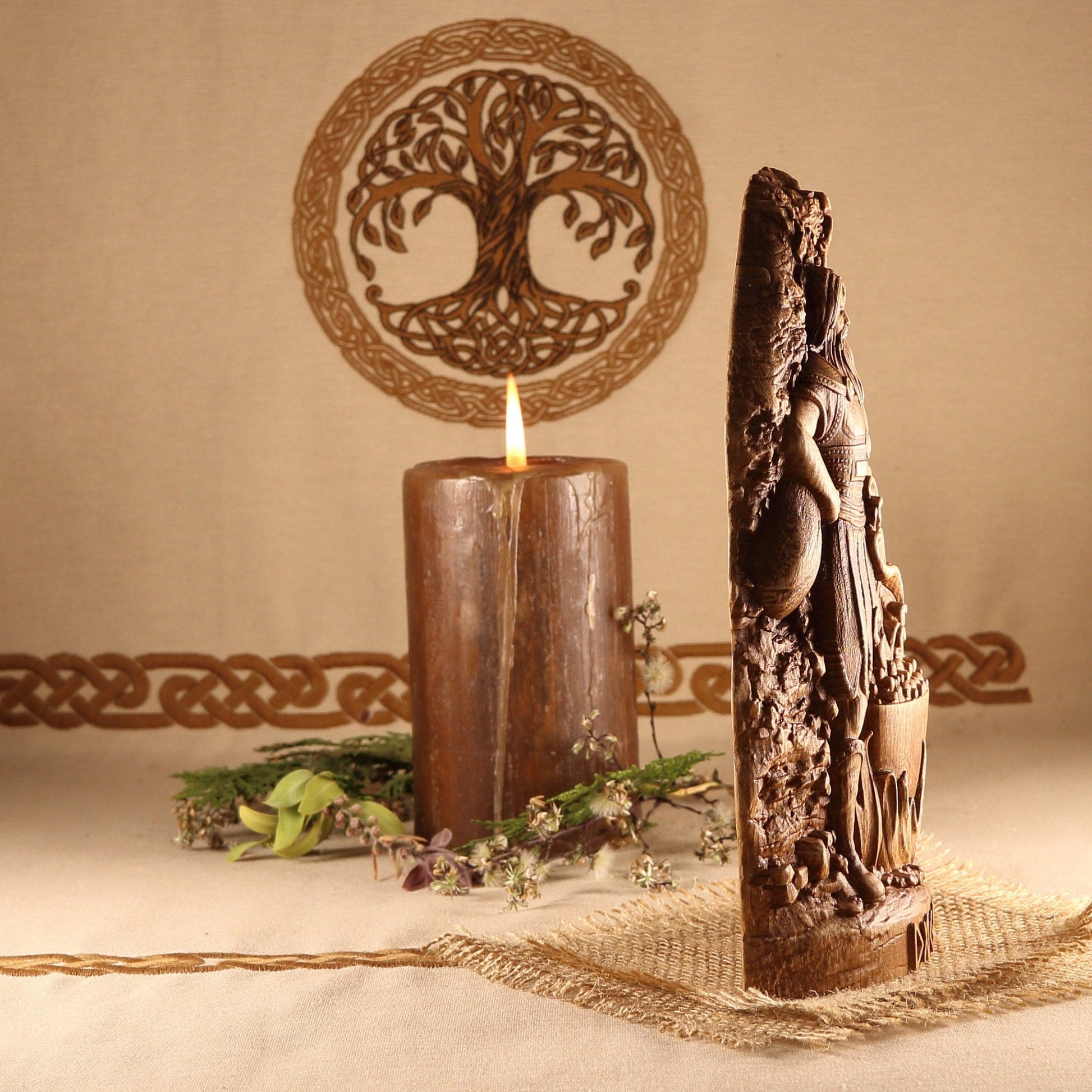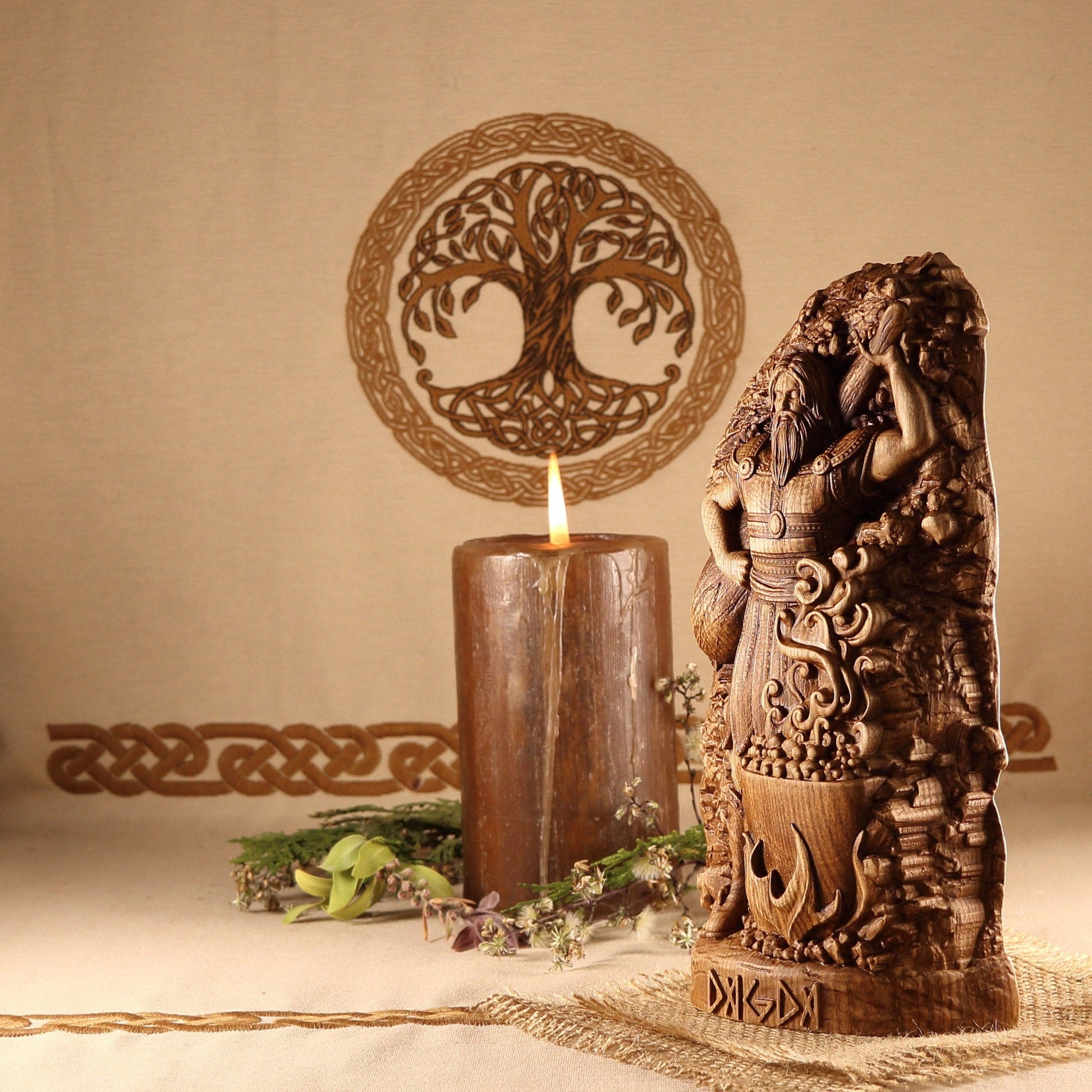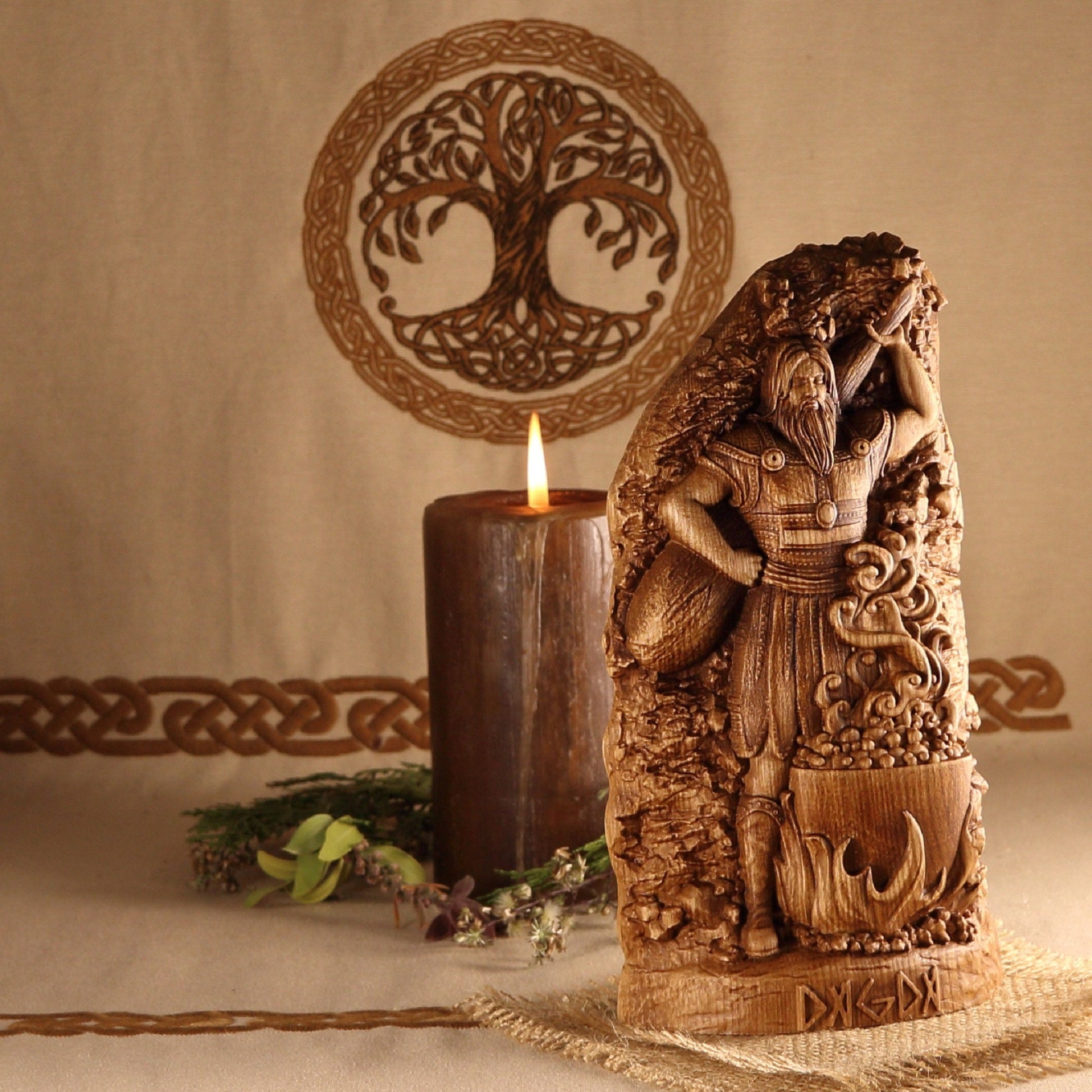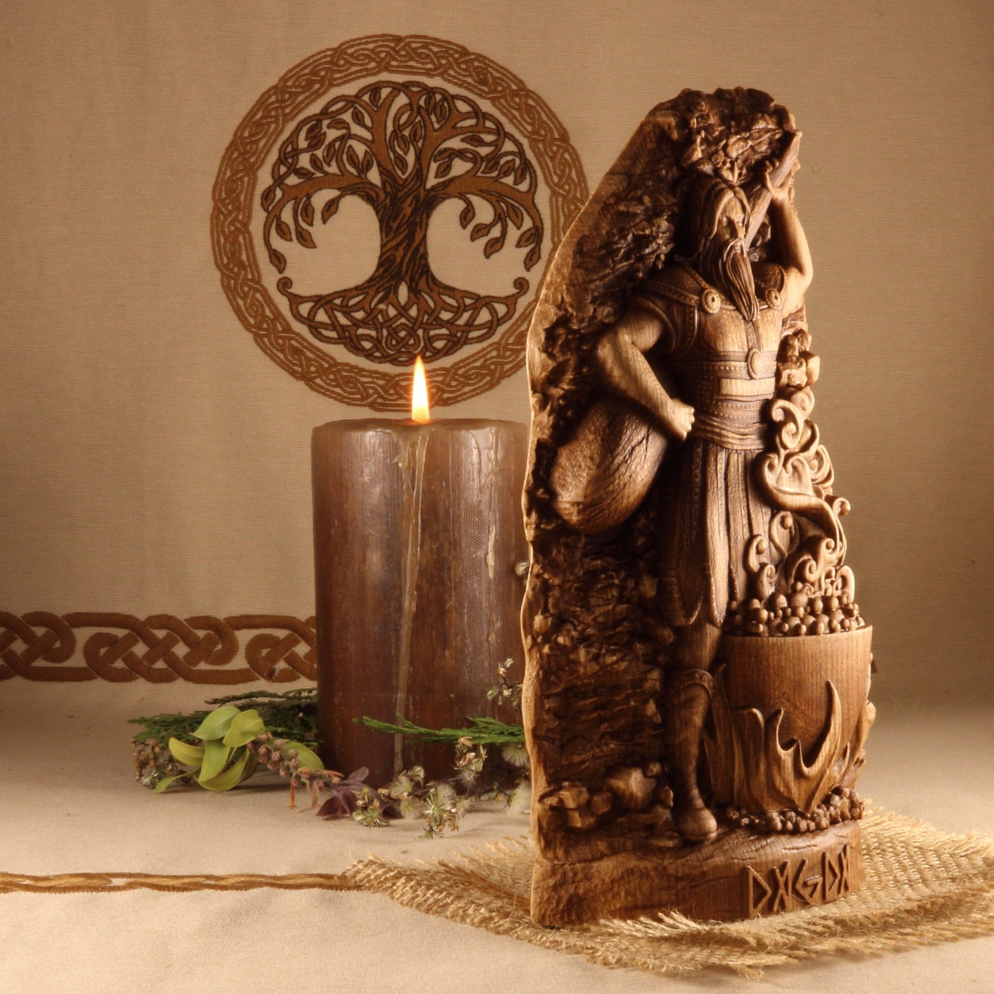 This unique sculpture is based on the ancient Irish god of prosperity and wealth, Dagda. It is handmade from ecological materials and finished with a varnish coating. The intricate carving is truly remarkable and makes this piece a work of art. It would make a wonderful addition to any home or office and would be a great conversation starter. Order yours today and bring some of Dagda's good luck into your life!