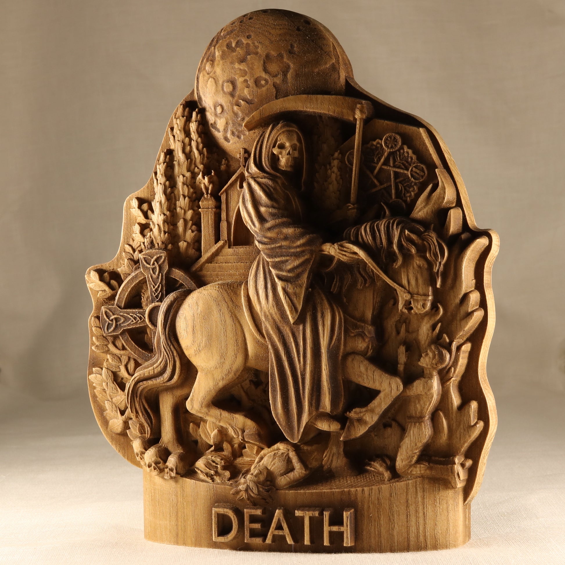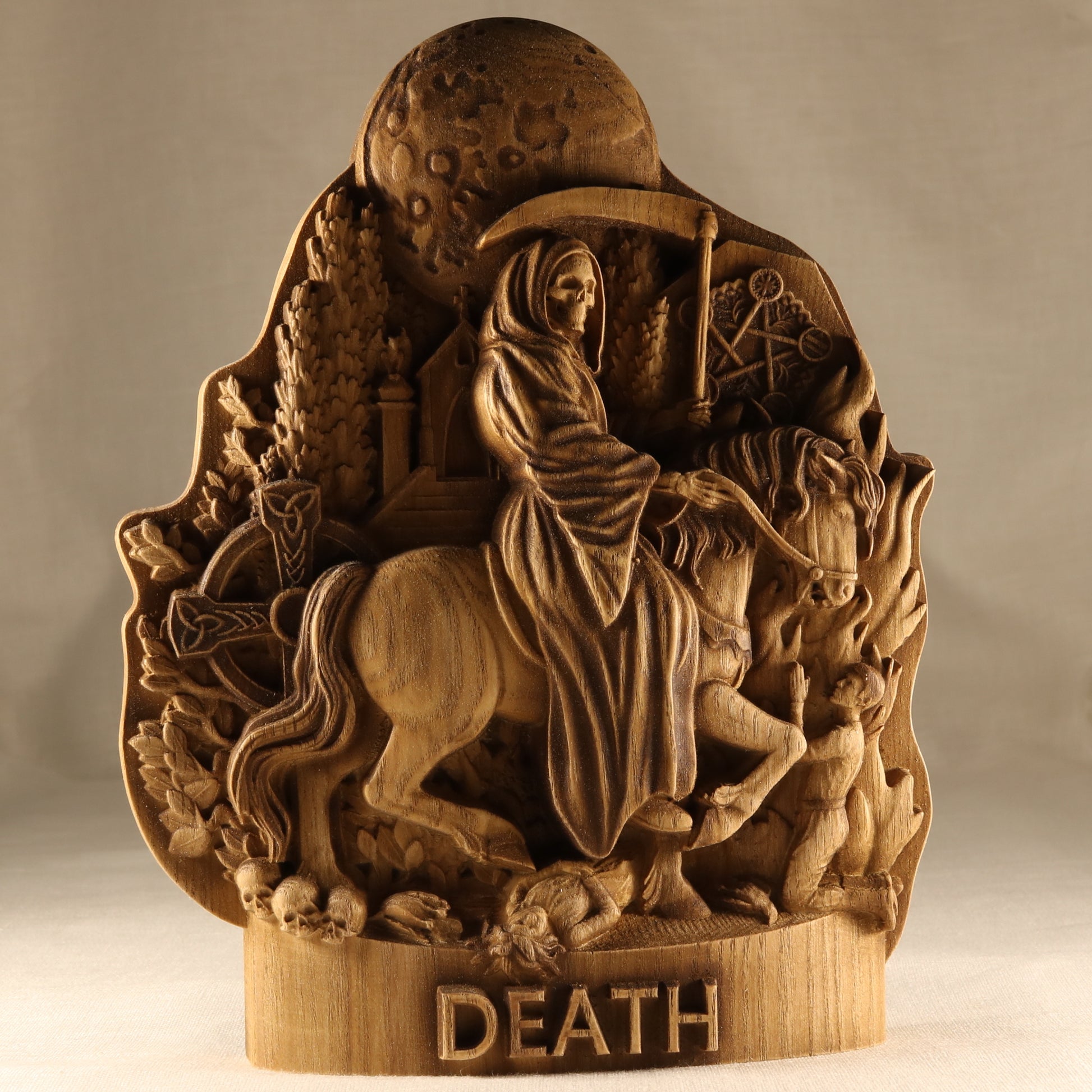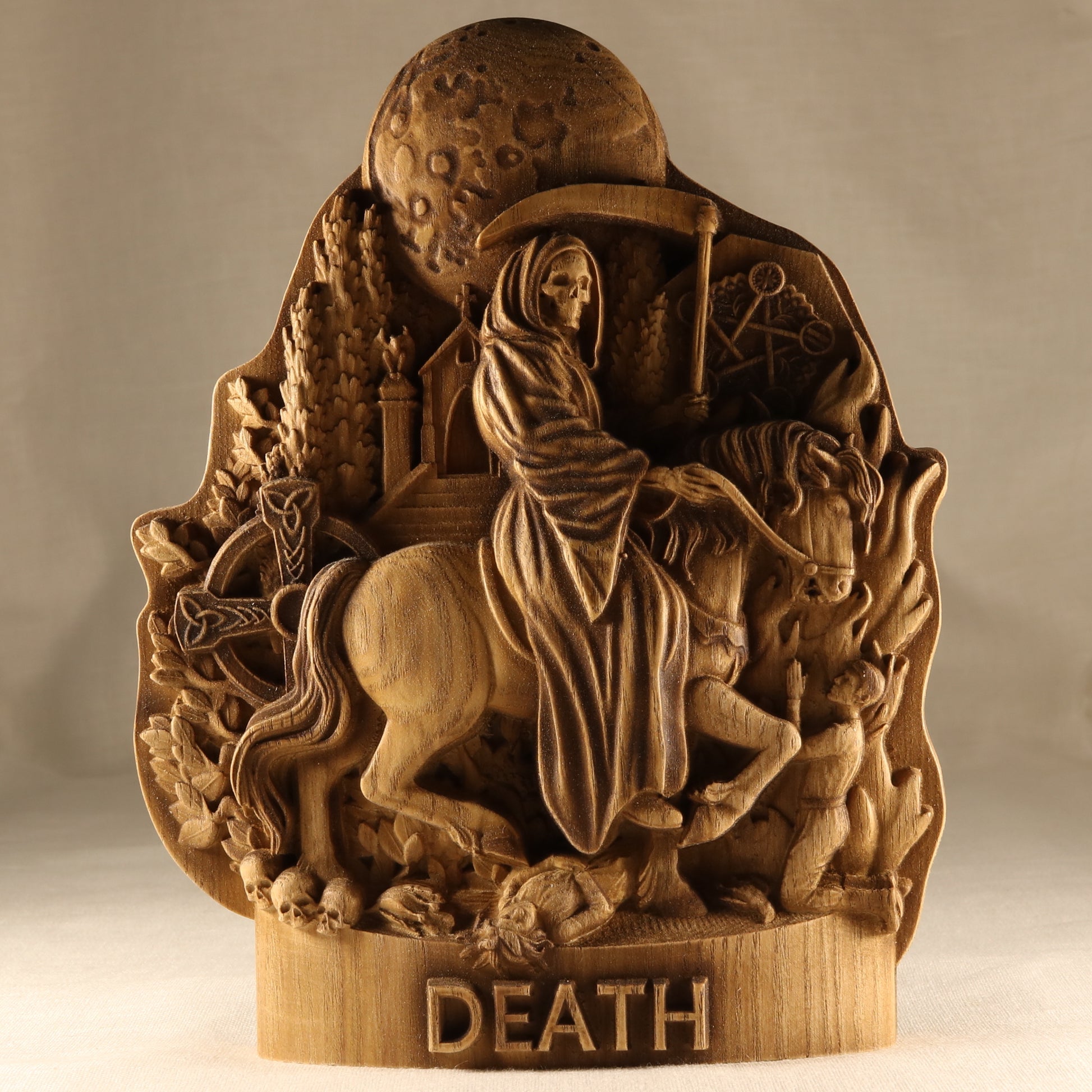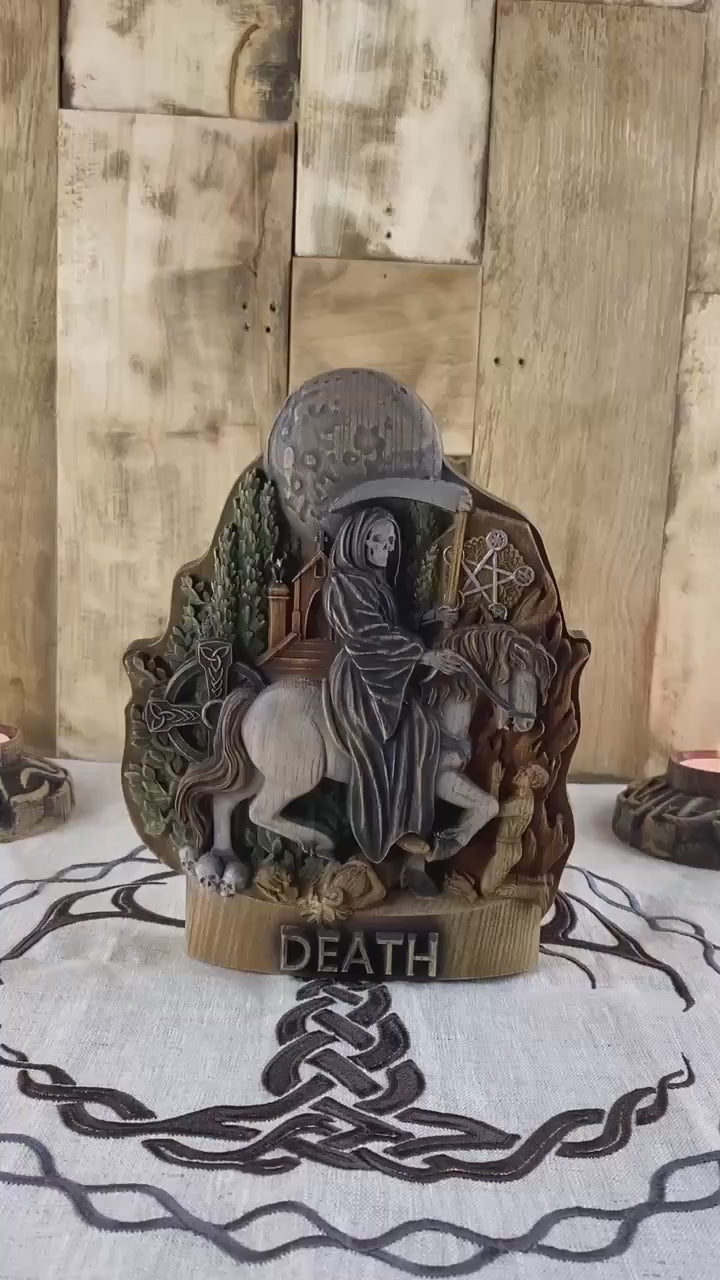 Wooden carved Death statue .We are pleased to present an exclusive carved wooden statue death on a horse - an elegant work of art that embodies deep symbolism and will be a wonderful occult decor for your home or office. This handcrafted piece combines traditional carving techniques with modern design elements death figurine. The symbolic image of grim reaper statue represents the eternal cycle of life and death, reminding us of its inevitability and universality. This motif is often associated with the wanderings of souls leaving the earthly world.The horse is a symbol of strength, freedom and nobility. In combination with witchcraft, it emphasizes its inevitability and speed.The traditional attribute of the scythe symbolizes the harvest of souls, emphasizing the natural process of completing the life cycle.This santa murte altar will become a bright accent in your living room, office or bedroom, adding uniqueness and artistic sophistication to the room.A great choice for collectors looking for rare and unusual works of santa muerte art.Ideal as a gift for connoisseurs of art, history and symbolism.