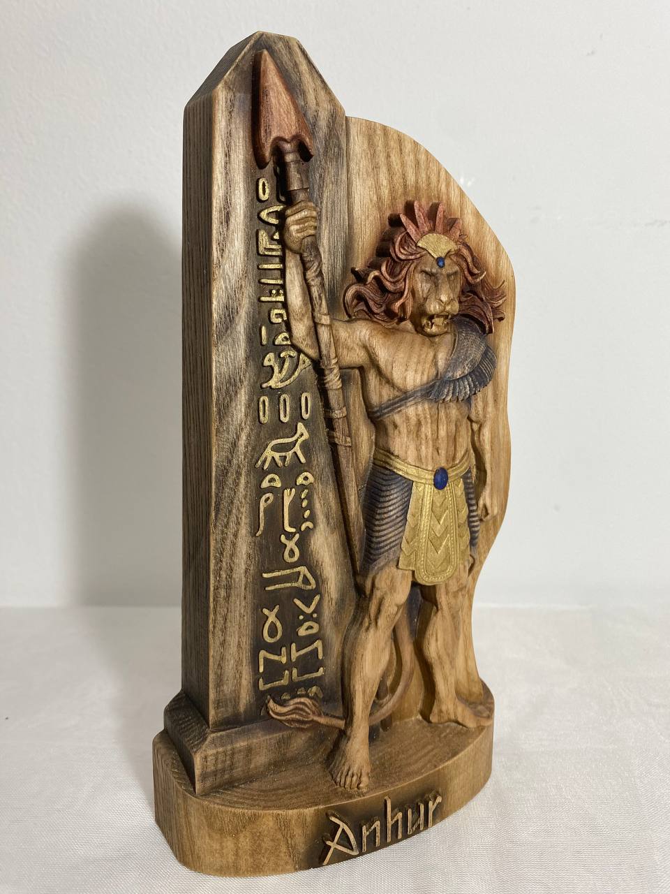 The wooden statue of the god Anhur stands out for its majestic and powerful posture. Carved from solid wood with grace and skill, this statuette embodies the strength and militancy of the ancient Egyptian god. Anhur the lion is depicted as a warrior with a human torso and a lion's head, which emphasizes his strength and power. His statue is decorated with details depicting military equipment, such as shields, armor or weapons, which emphasizes his role as a protector and patron. Ankhura's face expresses determination and courage, and his eyes radiate strength and power. He stands on a pedestal, symbolizing his connection with the earth and fertility, as well as his power over the world.