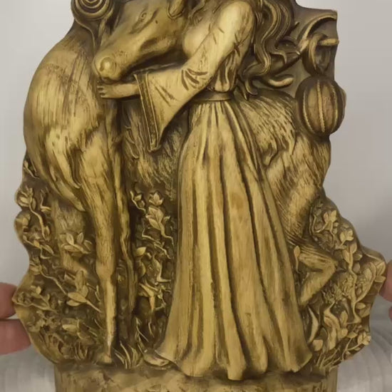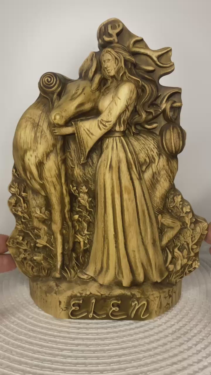 Elen, the Celtic Goddess of the ways, is one of the most venerated deities in Celtic mythology. Elen's story is one of strength, beauty, and courage. This hand-carved wooden statue depicts her in all her glory, with antlers adorning her head and a wild look in her eyes. Made from natural materials, this statue is eco-friendly and would make a stunning addition to any nature-themed home or garden. The varnish coating protects the wood and gives the statue a beautiful shine. Invite Elen into your home and let her story inspire you!