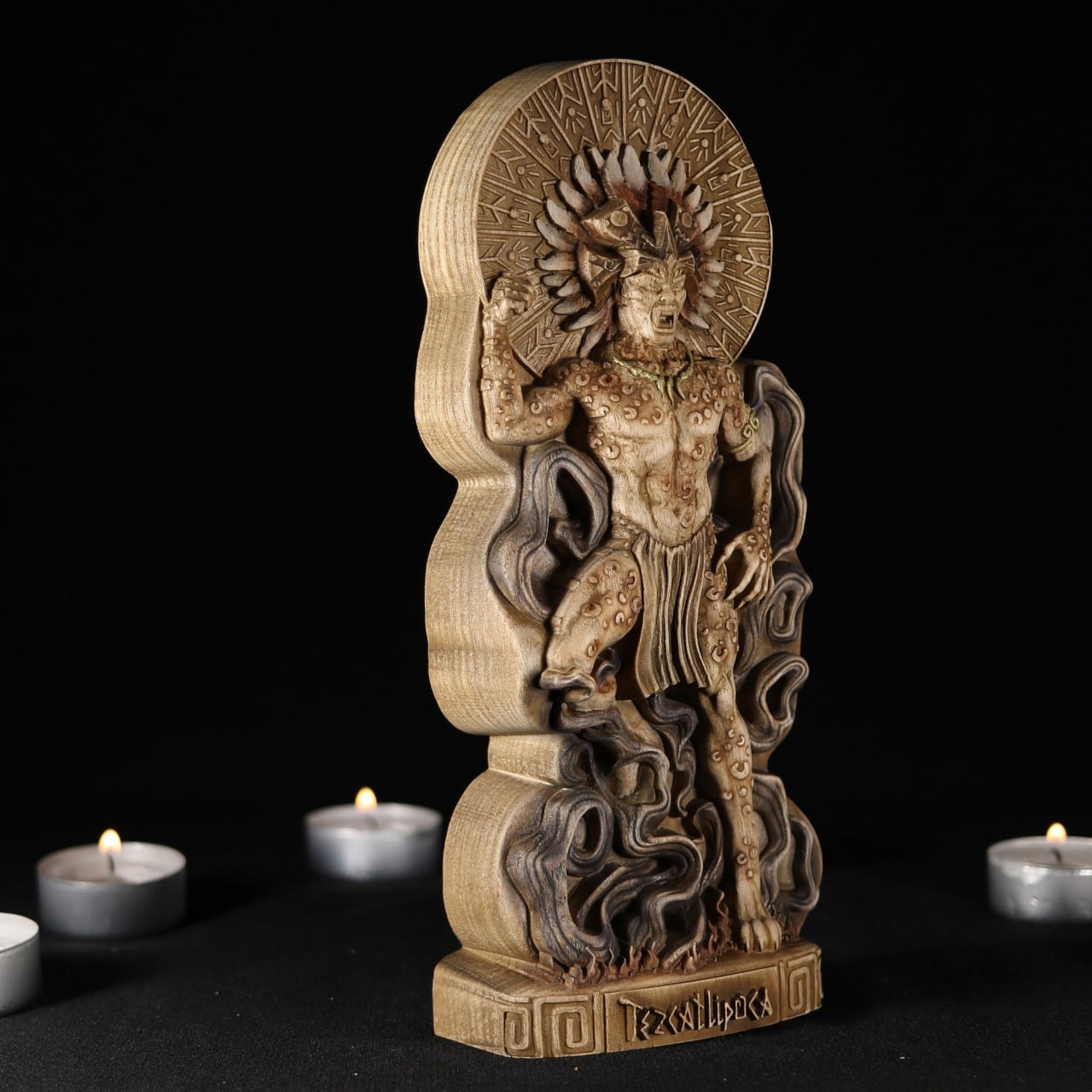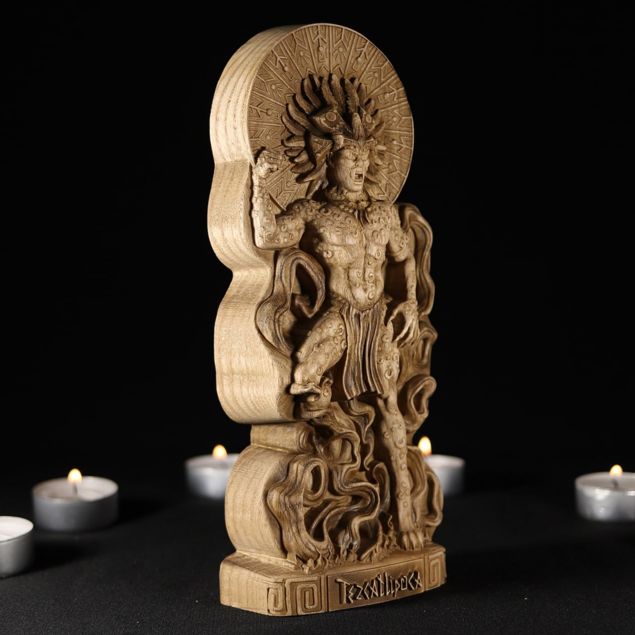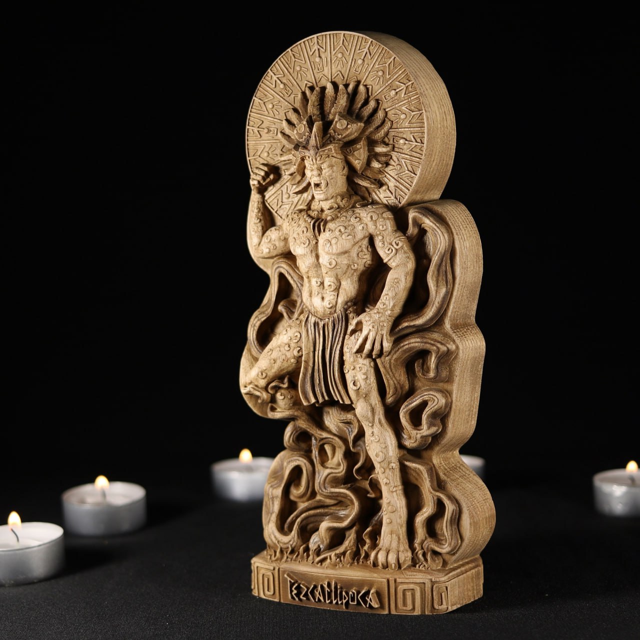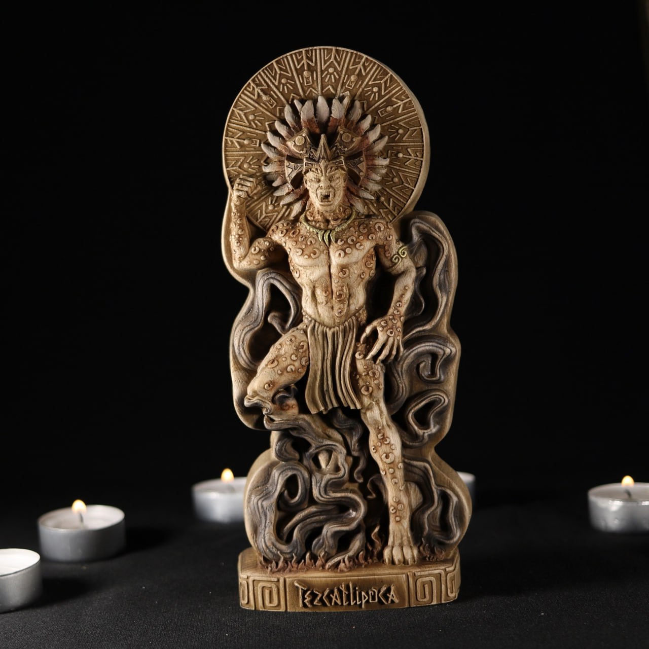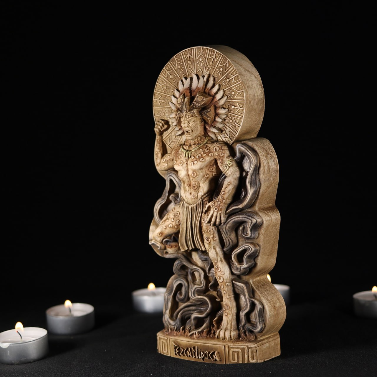 This wooden Tezcatlipoca statue serves as more than just a beautiful decorative piece, it also creates an aura of enigma and sparks curiosity about aztec mythology and culture.