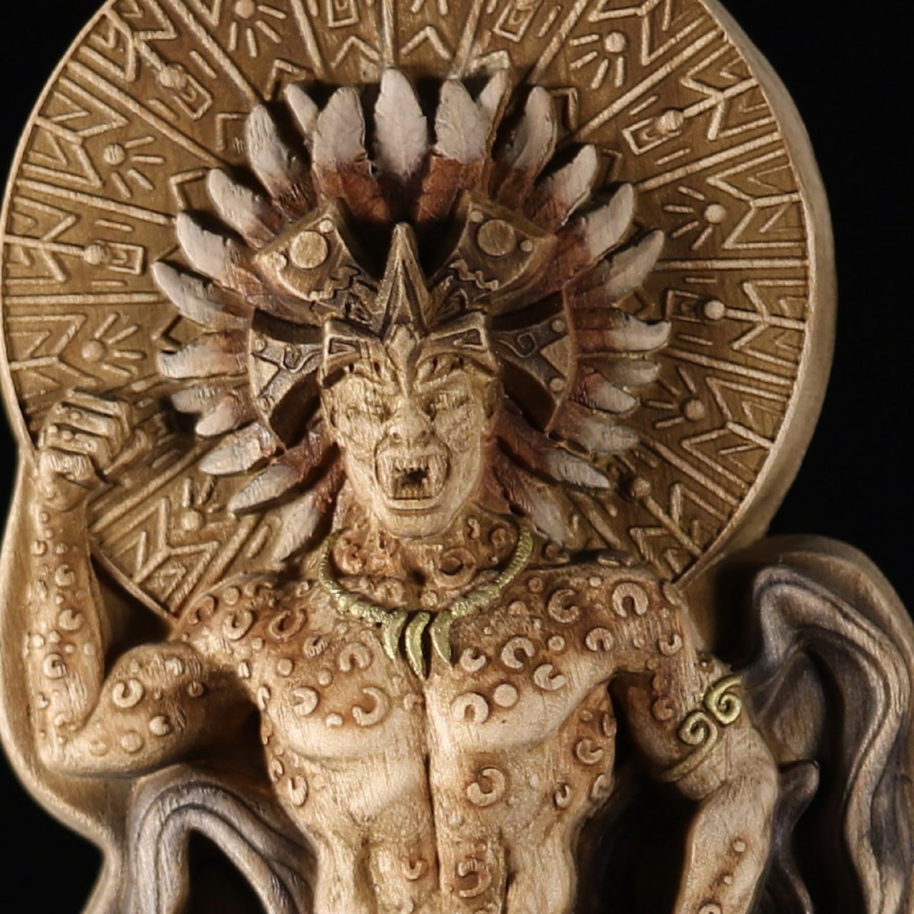 Known as "Tezcatlipoca" in aztec culture, this wood-carved statue captures the essence of the aztec god with its detailed craftsmanship and powerful presence. Each intricately carved feature, from the strong stance to the elaborate headdress and embellishments, showcases the artistry and skill of the Aztec artisans.