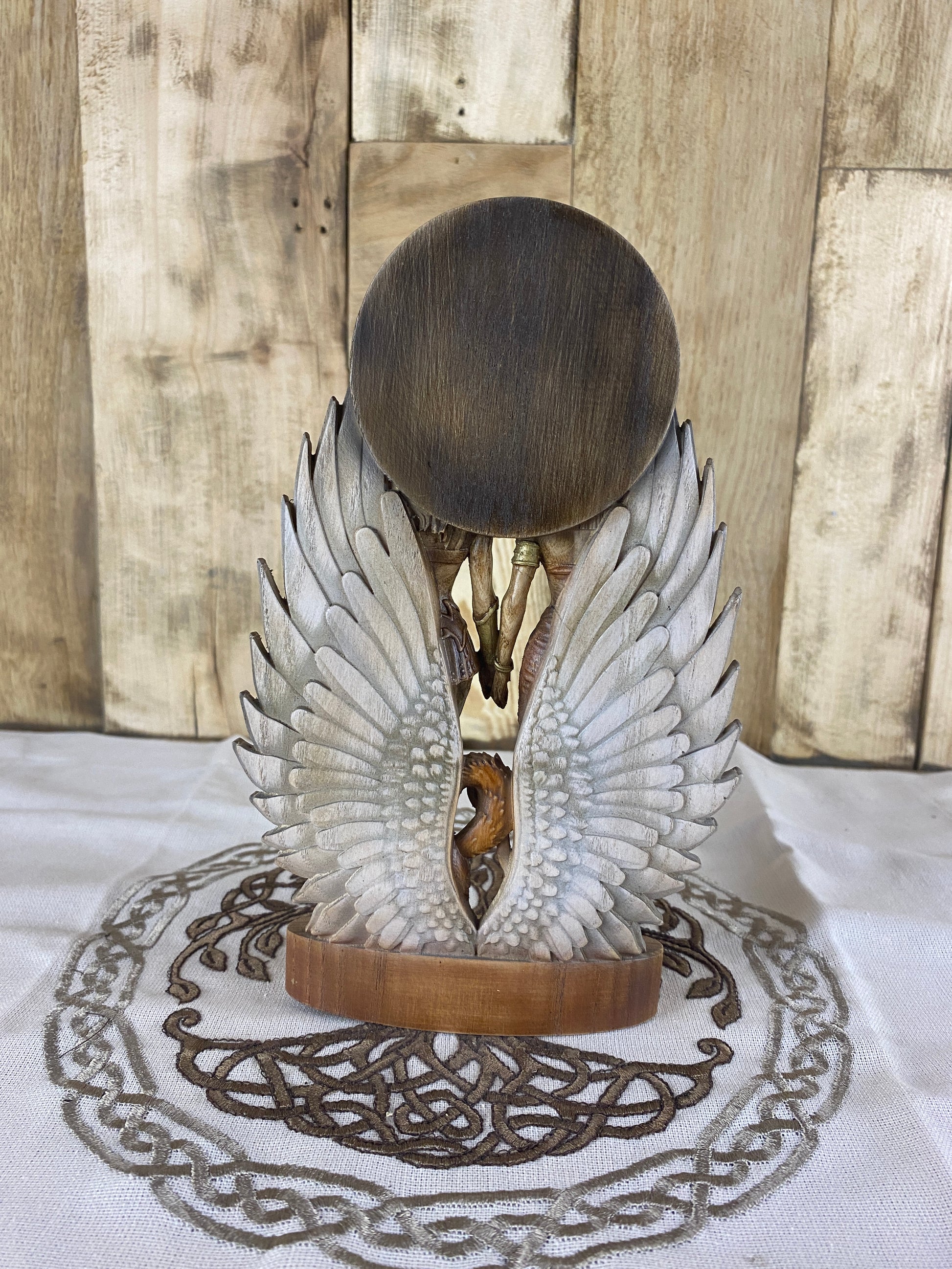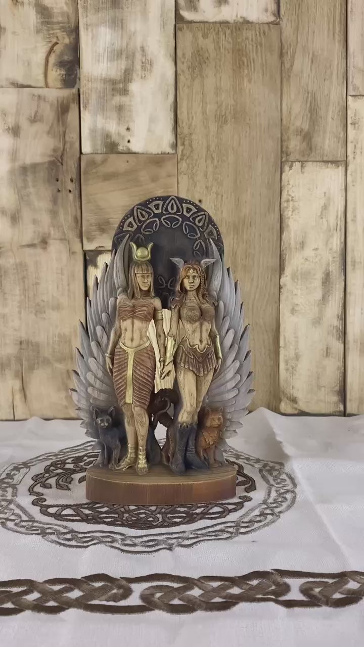 This handcrafted wooden statue depicts two iconic mythological figures—Isis and Freya—standing together as a representation of feminine power, wisdom, and protection. A refined decorative element, this piece brings together elements of both Egyptian and Norse mythology in a single, symbolic work of art.