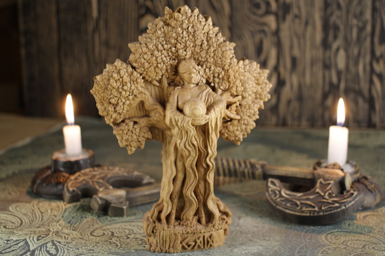 Gaia, the Greek goddess of the earth, was revered for her ability to bring new life from the soil. This beautiful wooden statue captures her in all her natural glory, surrounded by the flora and fauna that she so lovingly cares for.
