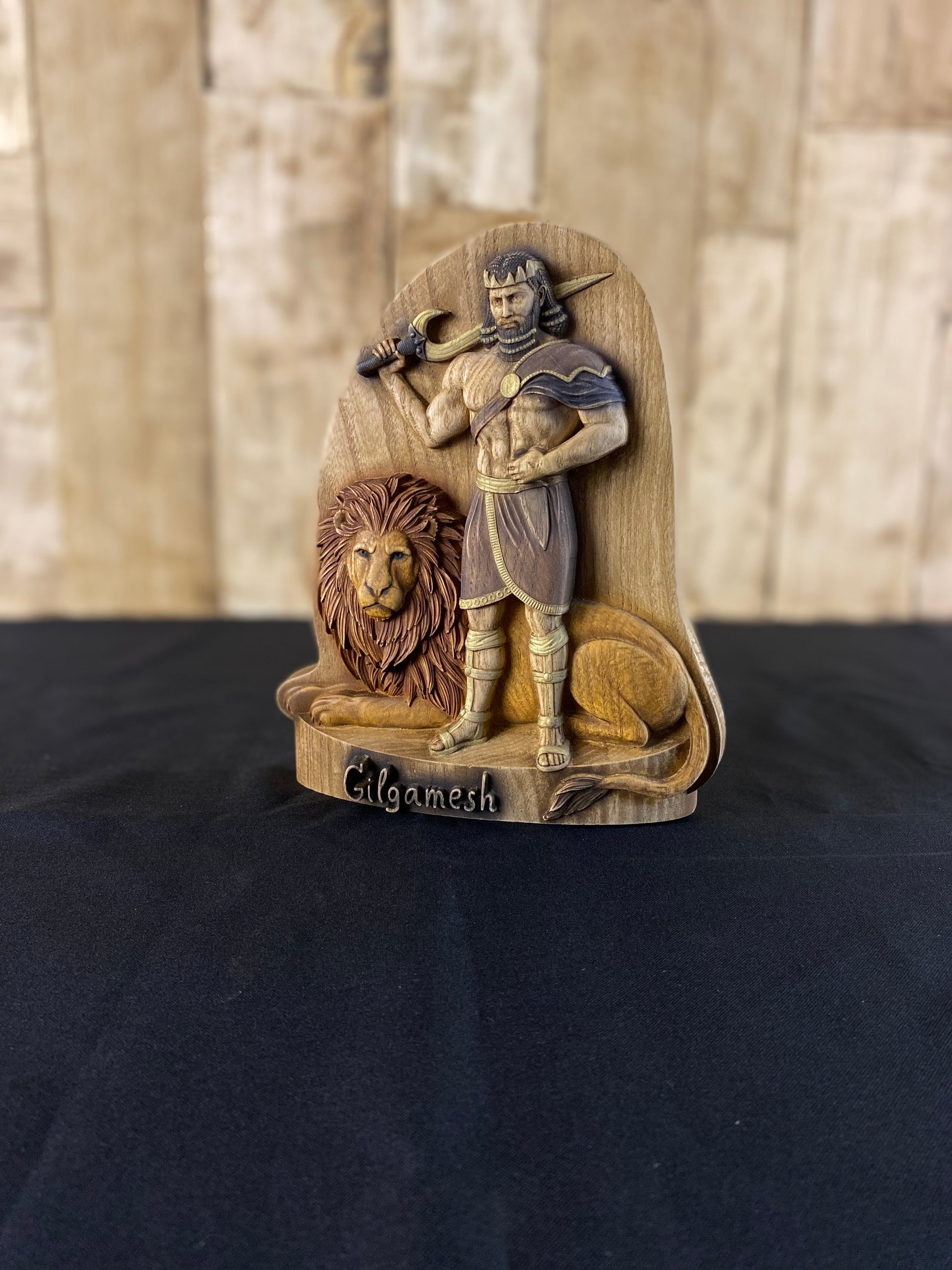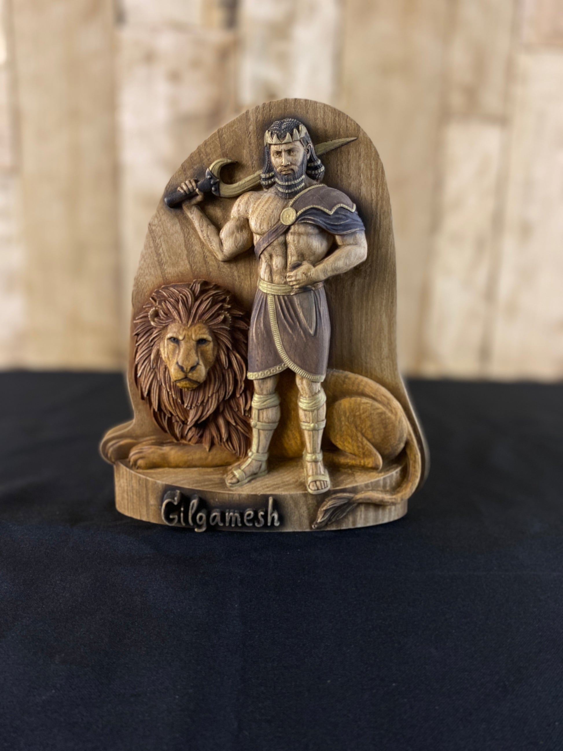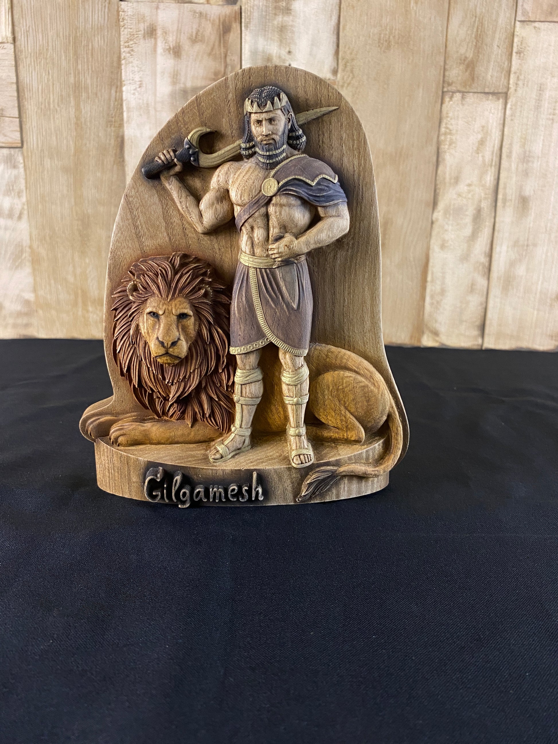 he carved wooden of Gilgamesh statue the mesopotamian warrior is a unique decoration for collectors.This sumerian statue of Gilgamesh is a magnificent piece of art that will decorate any interior with its graceful beauty. Made of natural wood by hand, this sumerian gods statue embodies the spirit of history and culture and mesopotamian mythology .Every detail of the Gilgamesh statue is made with skill and fine craftsmanship.This masterpiece design combines classic mesopotamian motifs with modern trends.