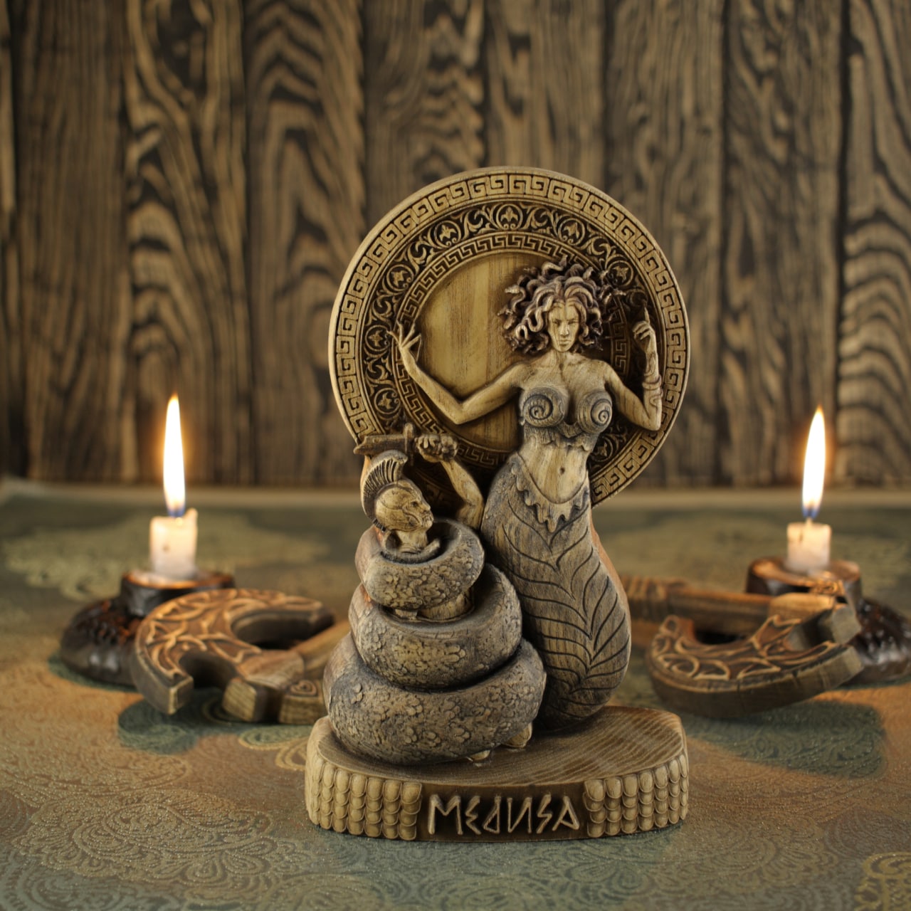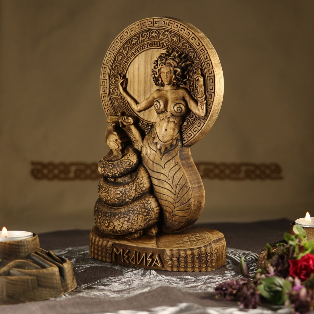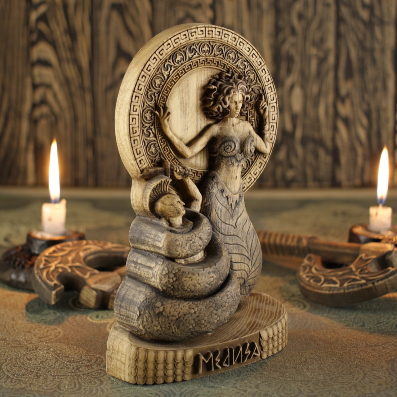 Gorgon Medusa the most famous of the Gorgon sisters, is a monster with a woman's face and snakes instead of hair. Medusa statue handmade wooden statue, medusa statue carved from ecological material.