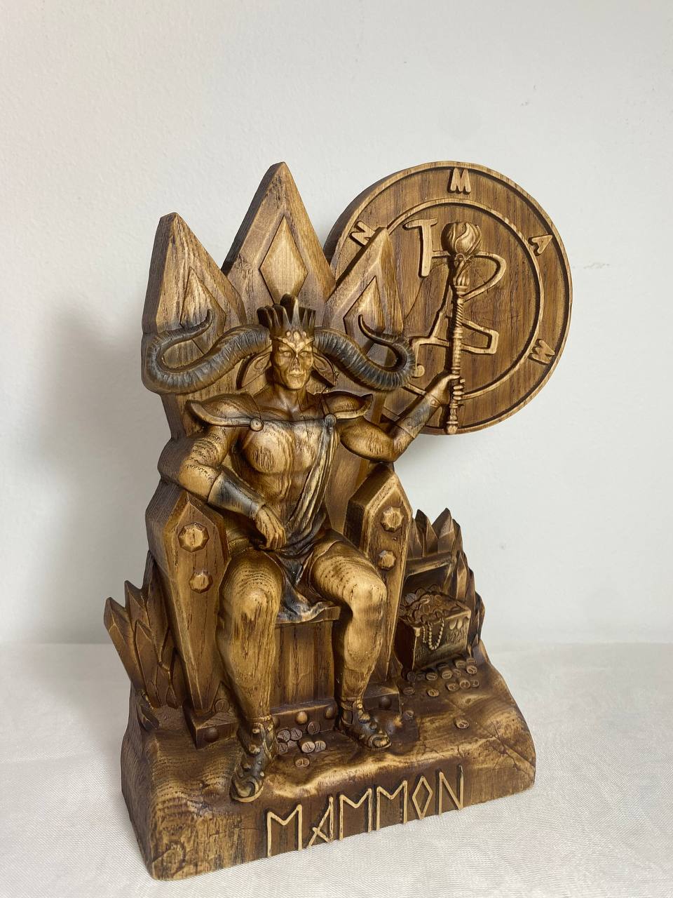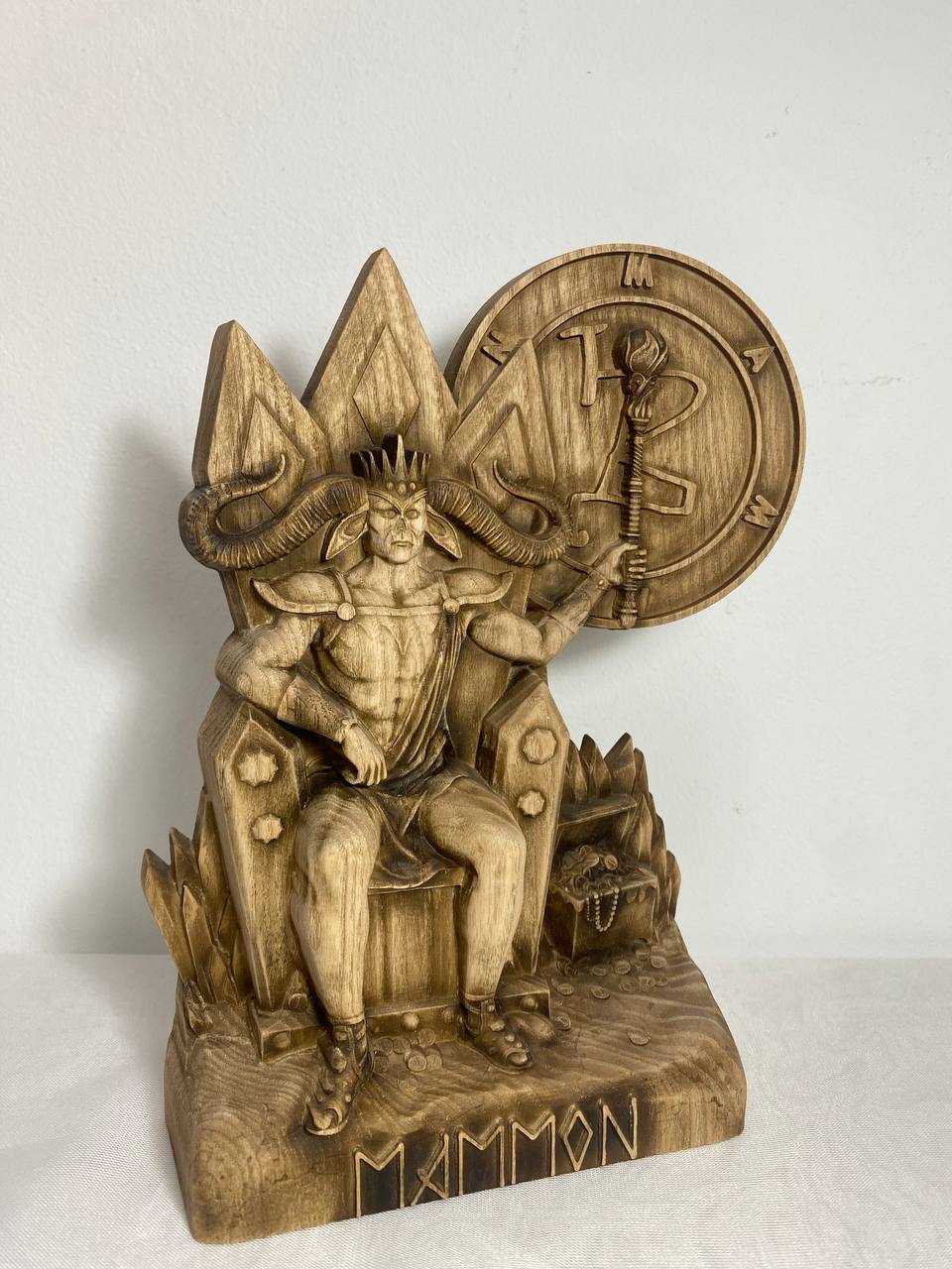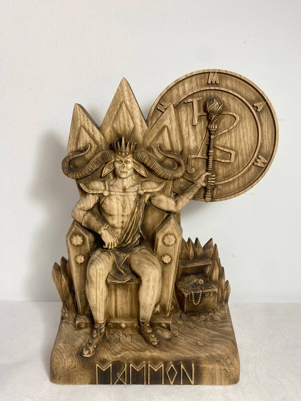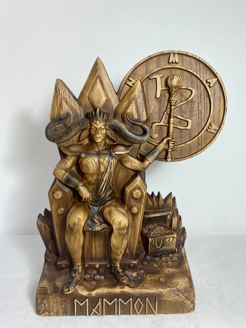 Mammon, the demon of greed and envy, is handmade from ecological materials with love and care. He is the perfect addition to any room or office as a stylish paperweight or conversation starter. His unique features are sure to make him stand out amongst your other decoration. Made from an ash tree and varnished for a smooth finish, Mammon is the personification of power and money. He makes a great gift for anyone who loves money or has a healthy respect for it.