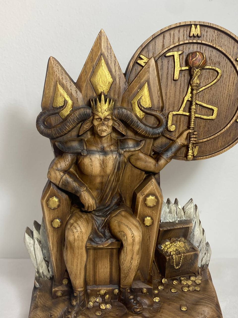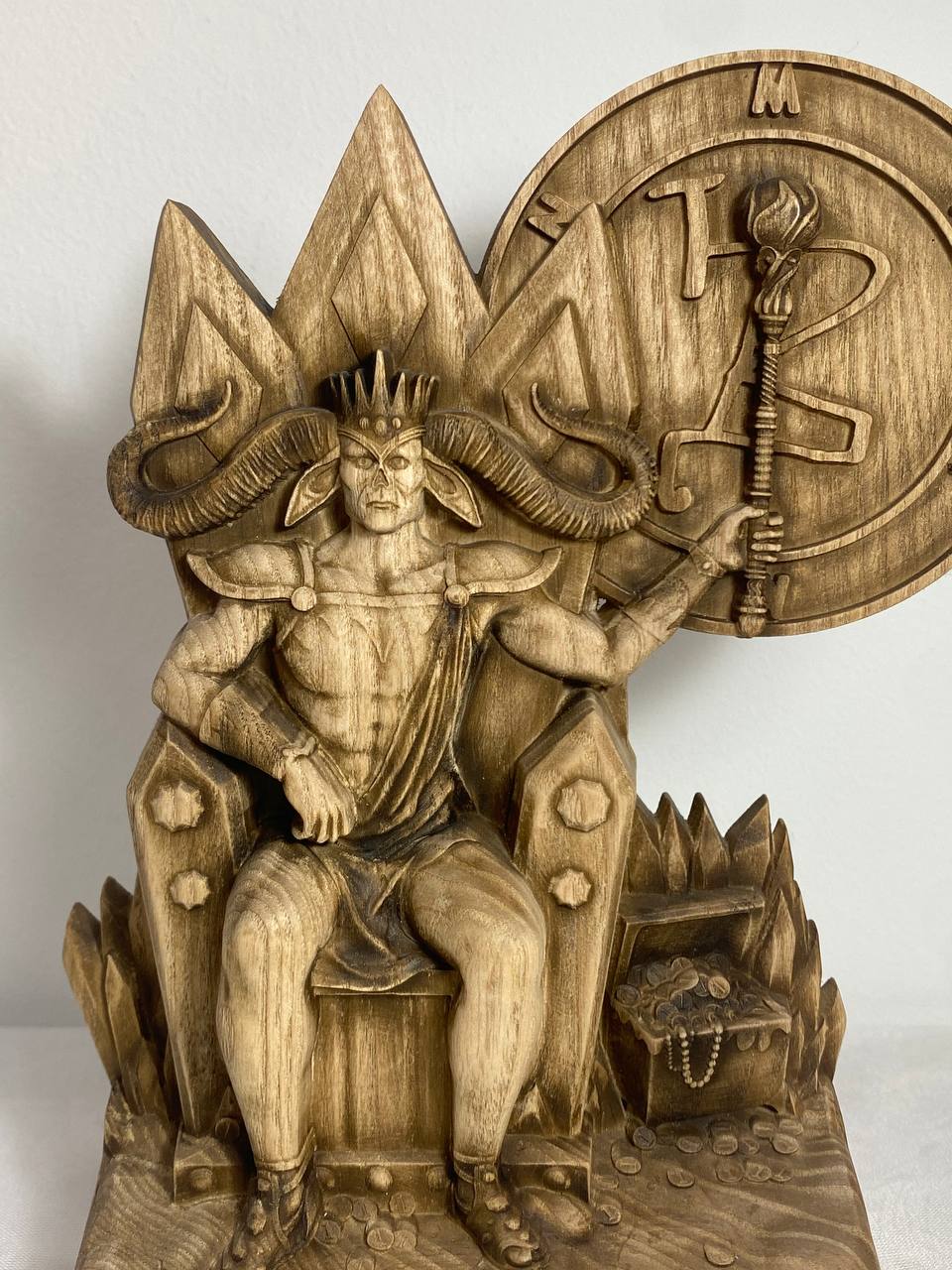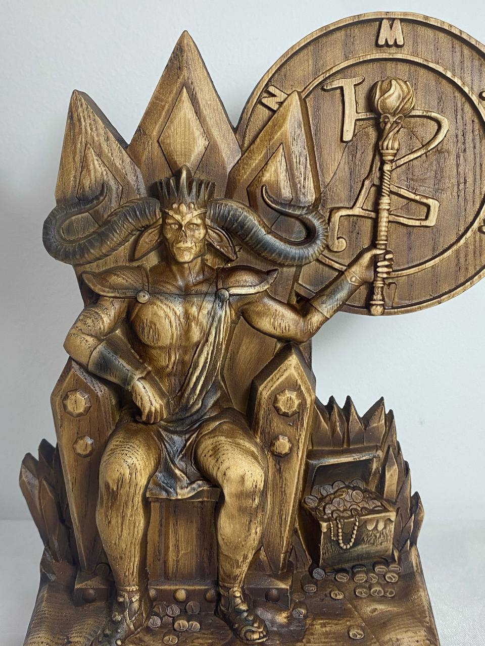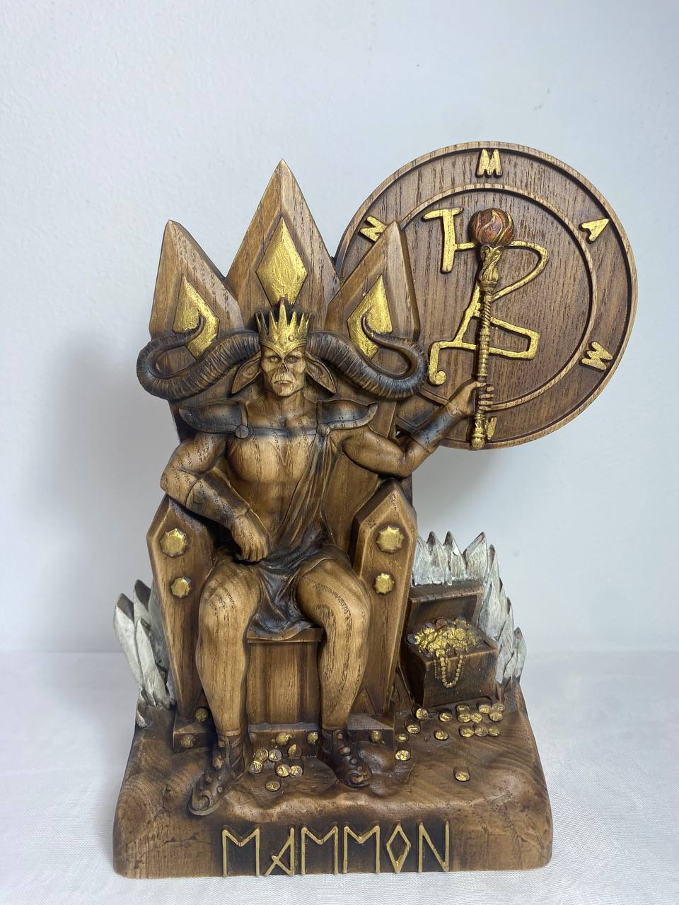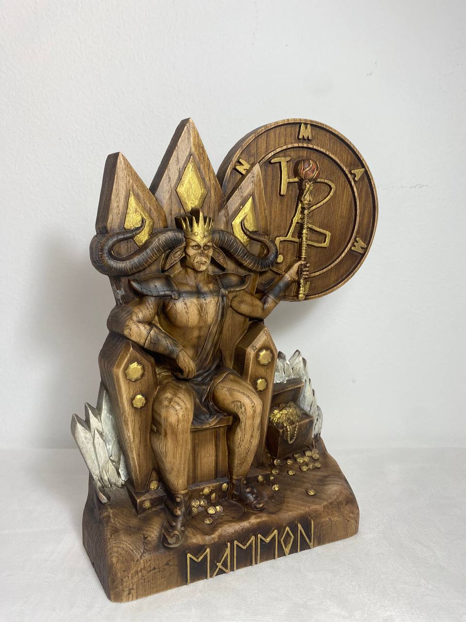 Mammon, the demon of greed and envy, is handmade from ecological materials with love and care. He is the perfect addition to any room or office as a stylish paperweight or conversation starter. His unique features are sure to make him stand out amongst your other decoration. Made from an ash tree and varnished for a smooth finish, Mammon is the personification of power and money. He makes a great gift for anyone who loves money or has a healthy respect for it.