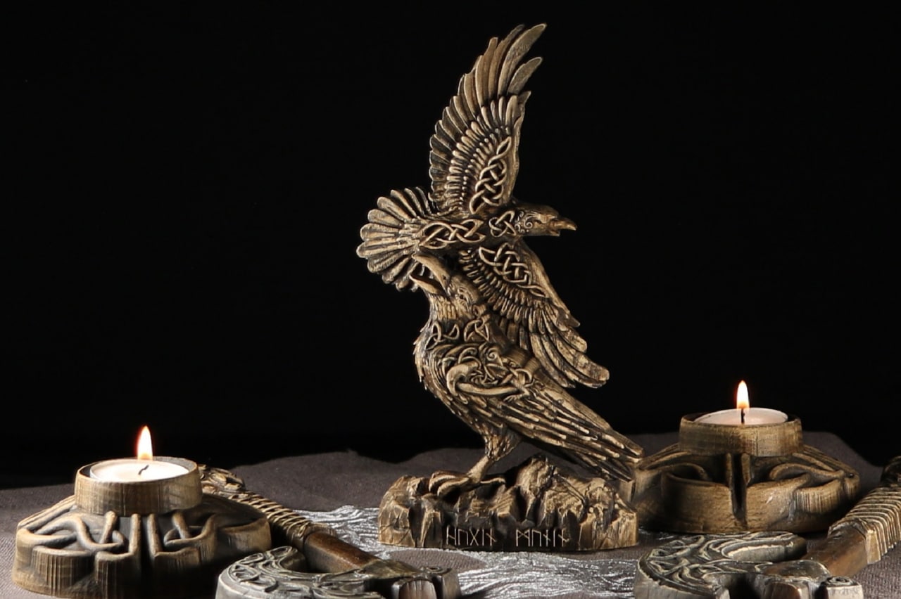 We tried to do it for you with great pleasure and put effort into this Huginn and Muninn wood sculpture from ash tree for your complete delight.