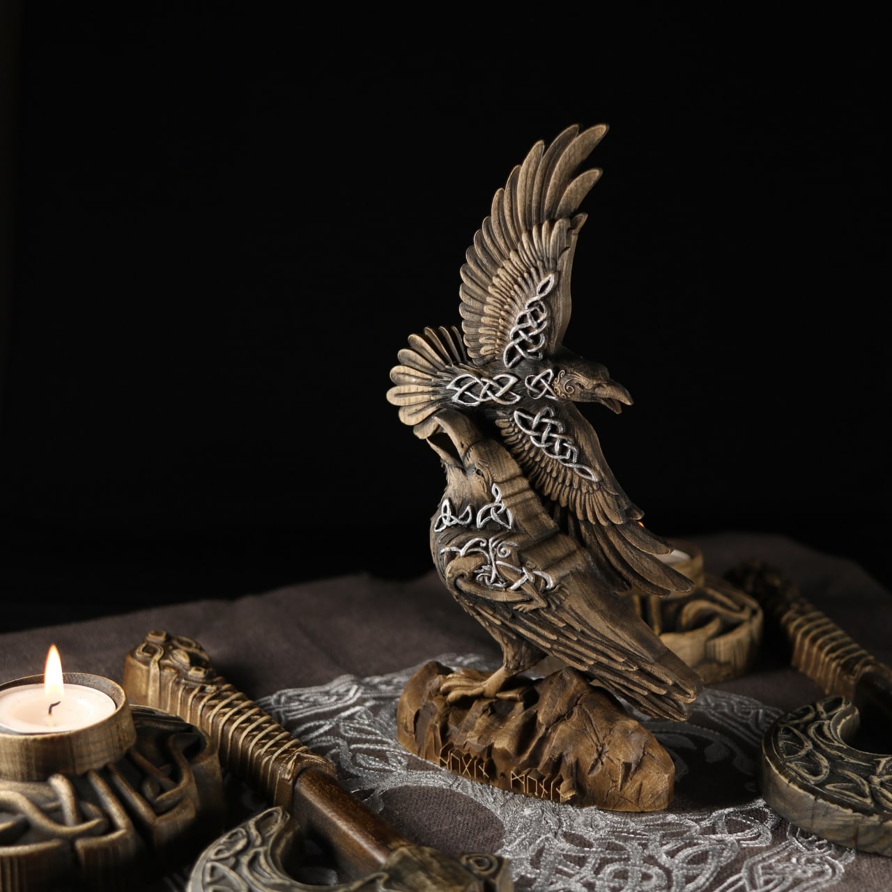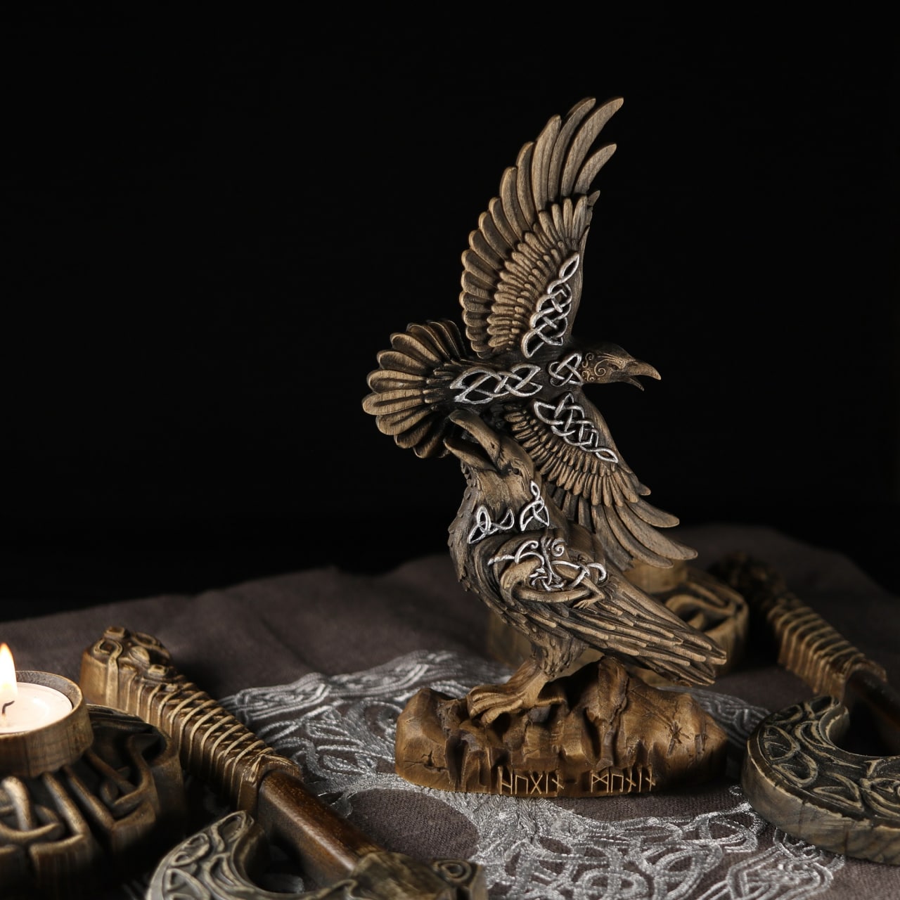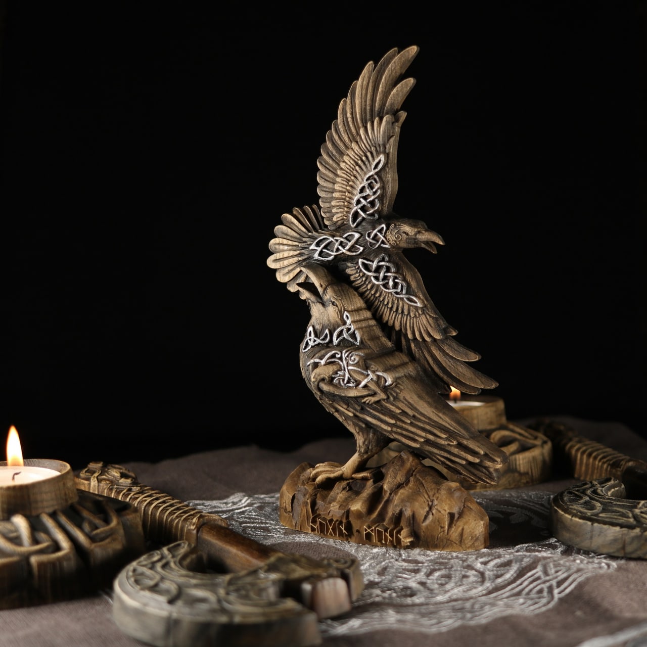 Huginn and Muninn, handmade norse pagan, wooden statue carving
