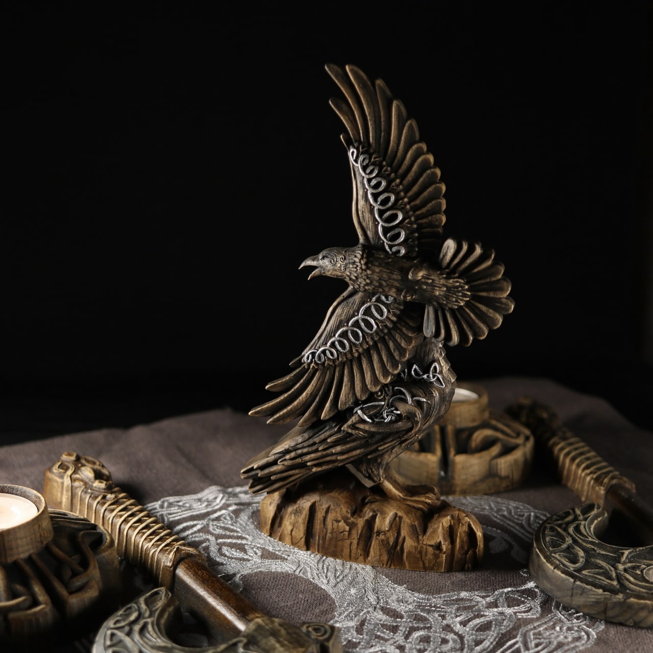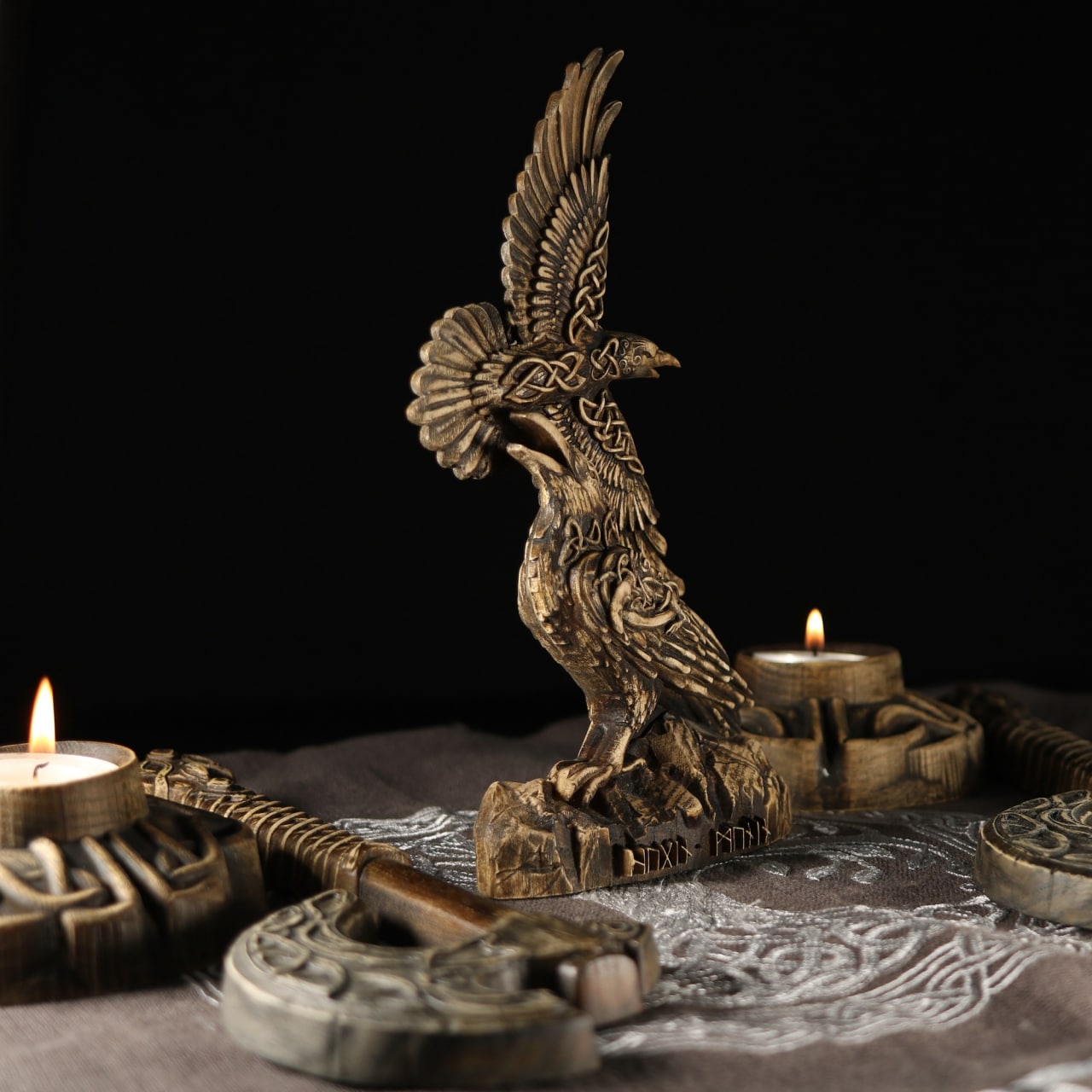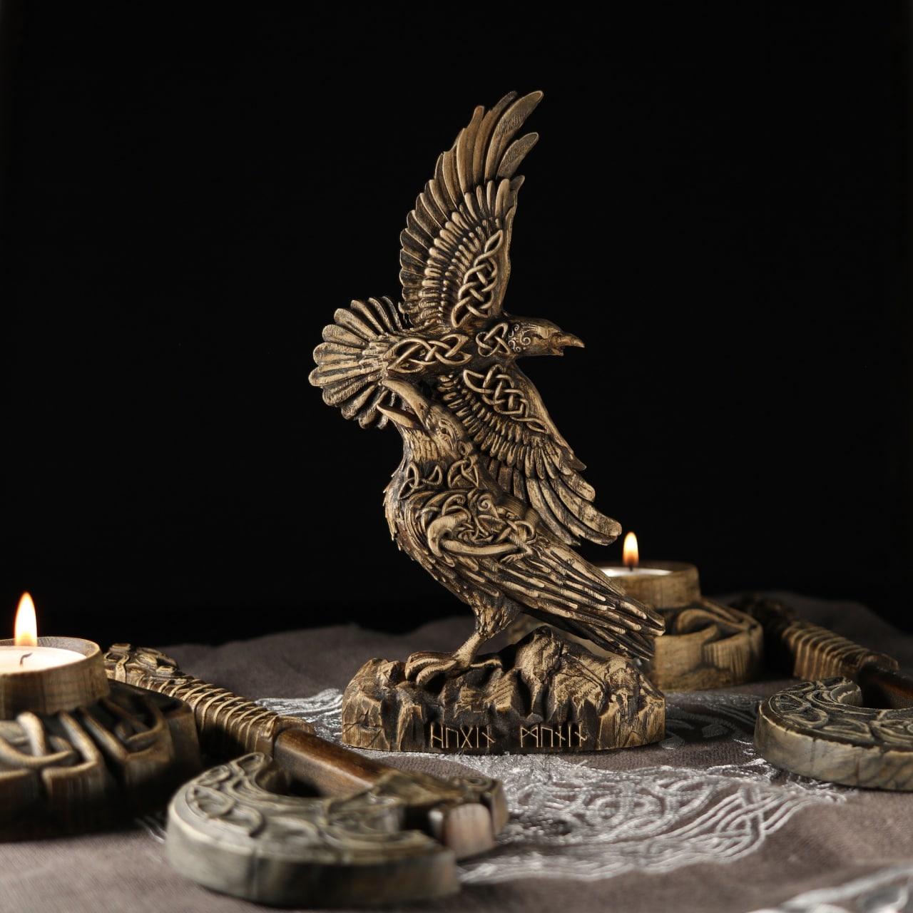 Huginn and Muninn, handmade norse pagan, wooden statue carving