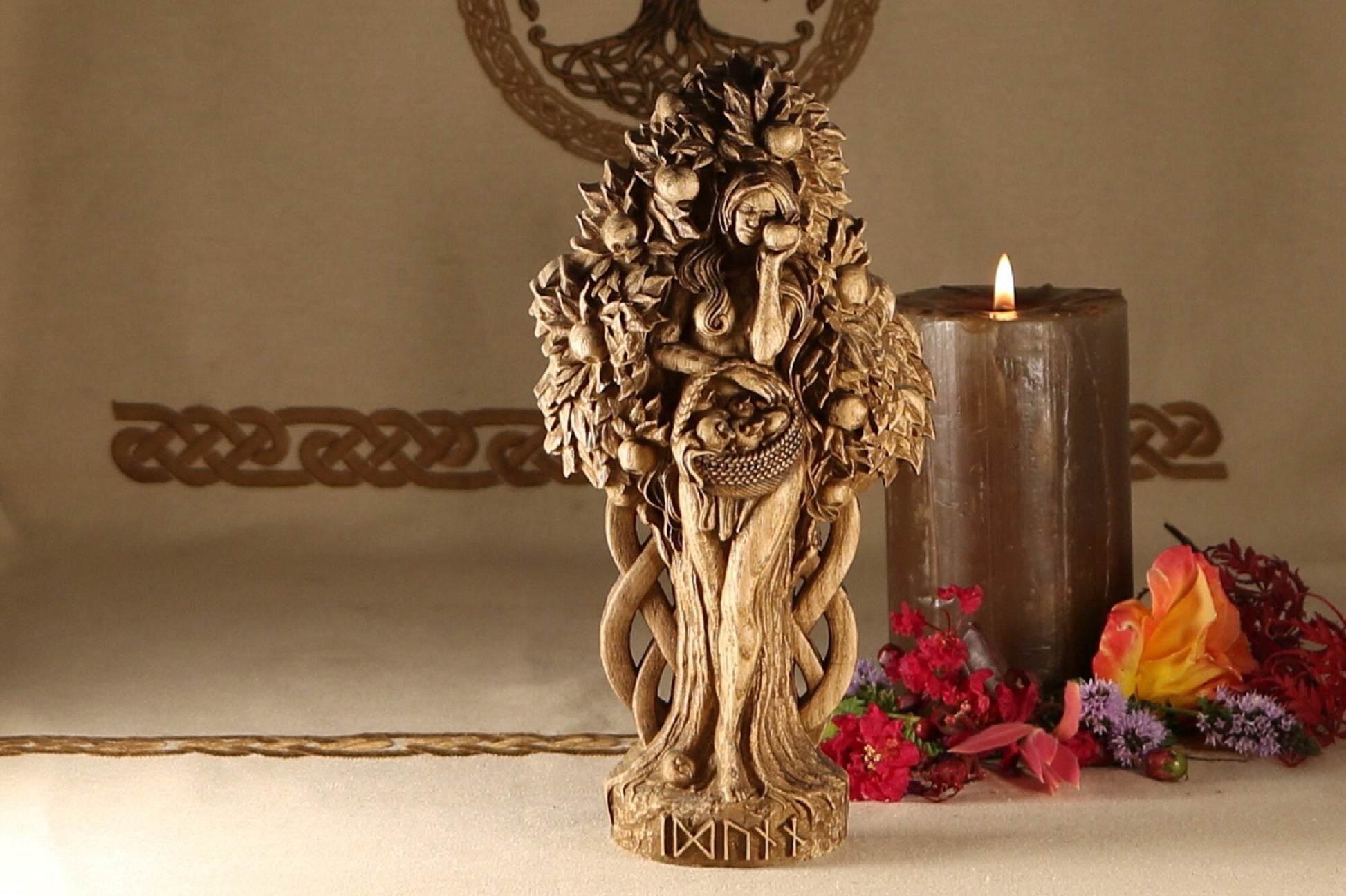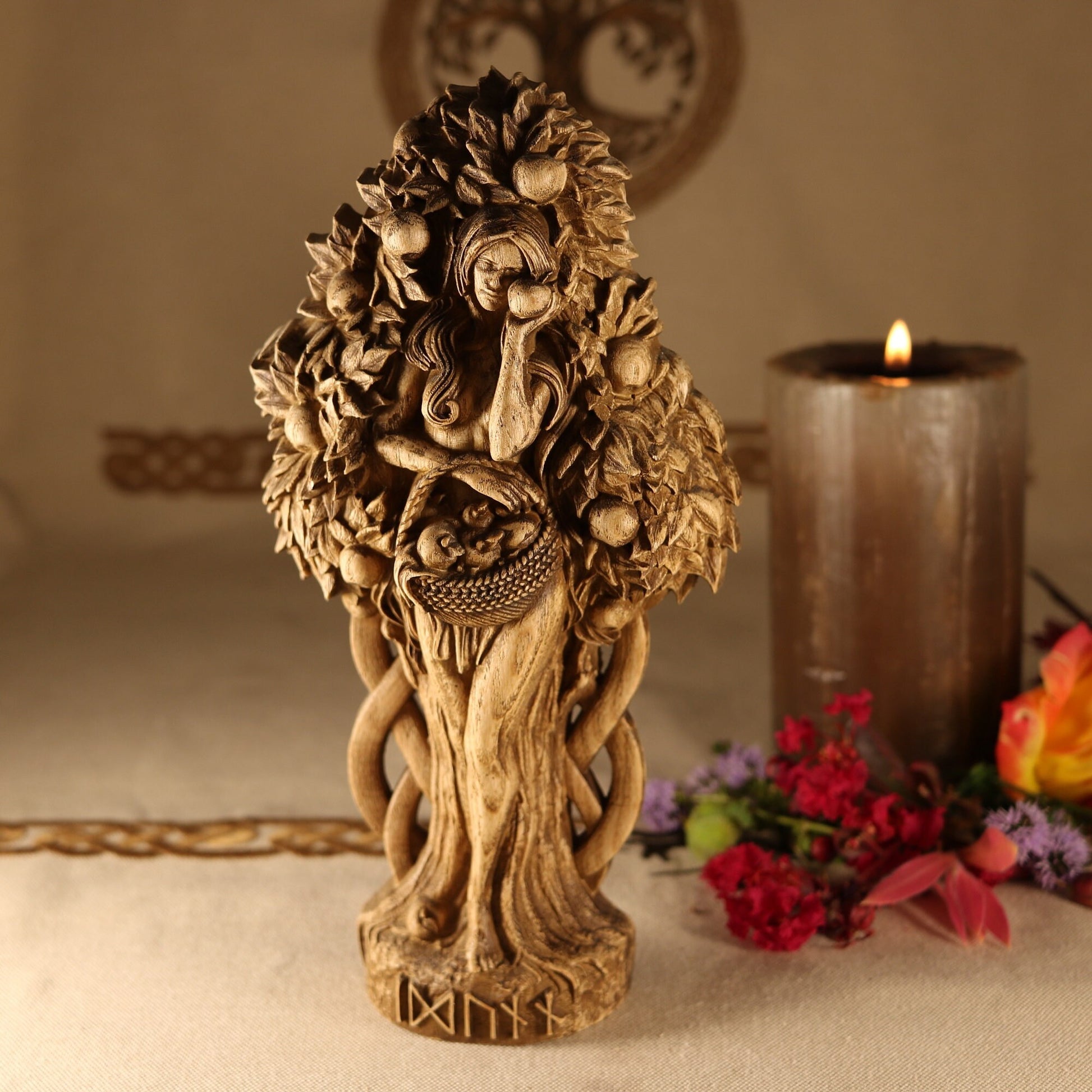 This beautiful hand-carved wooden statue is made from ecological materials and features a varnish finish to protect it from the elements. Idunn is holding a basket of her famous apples, which are said to keep the gods young and immortal.