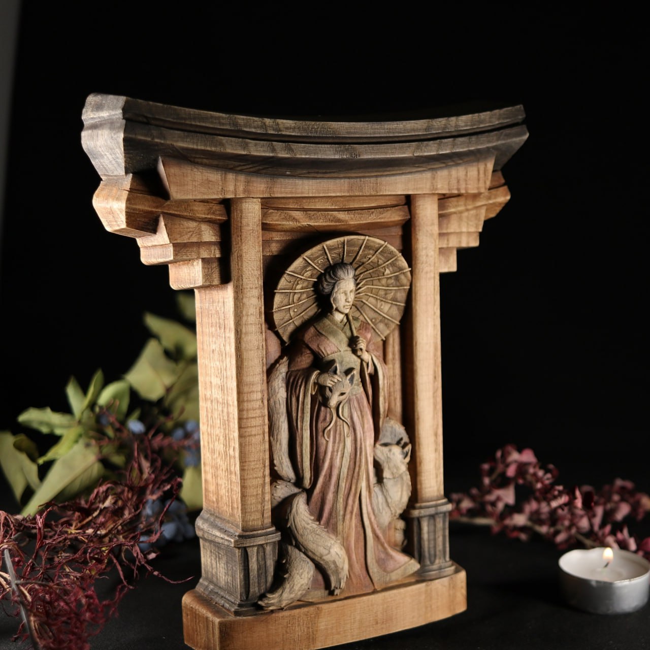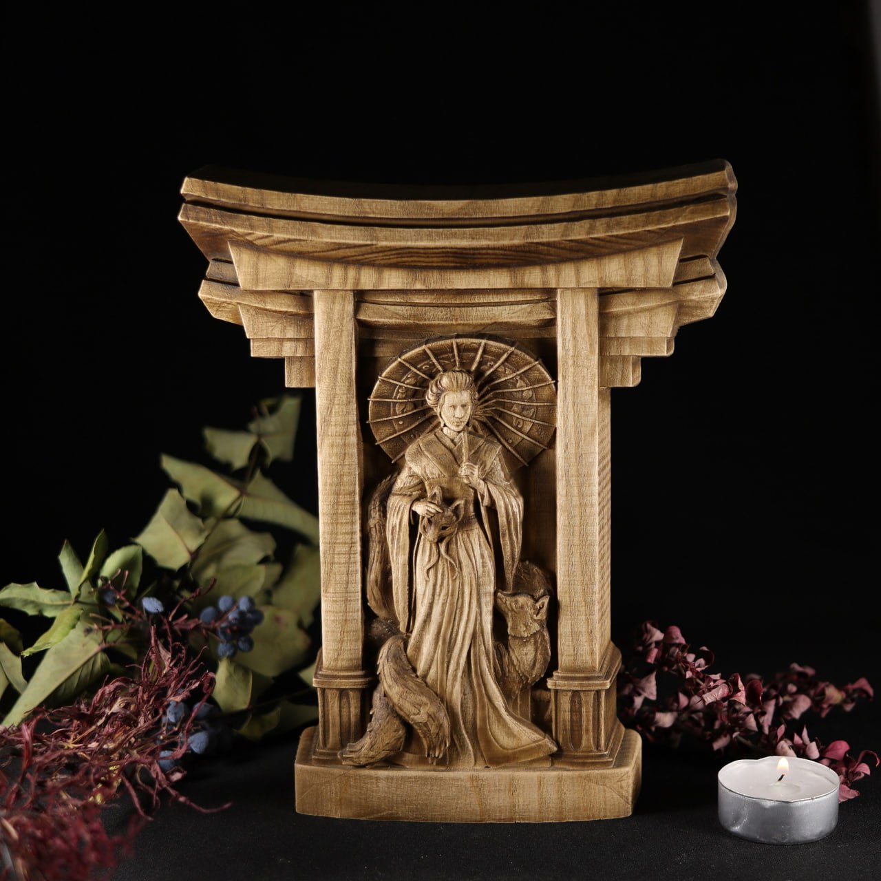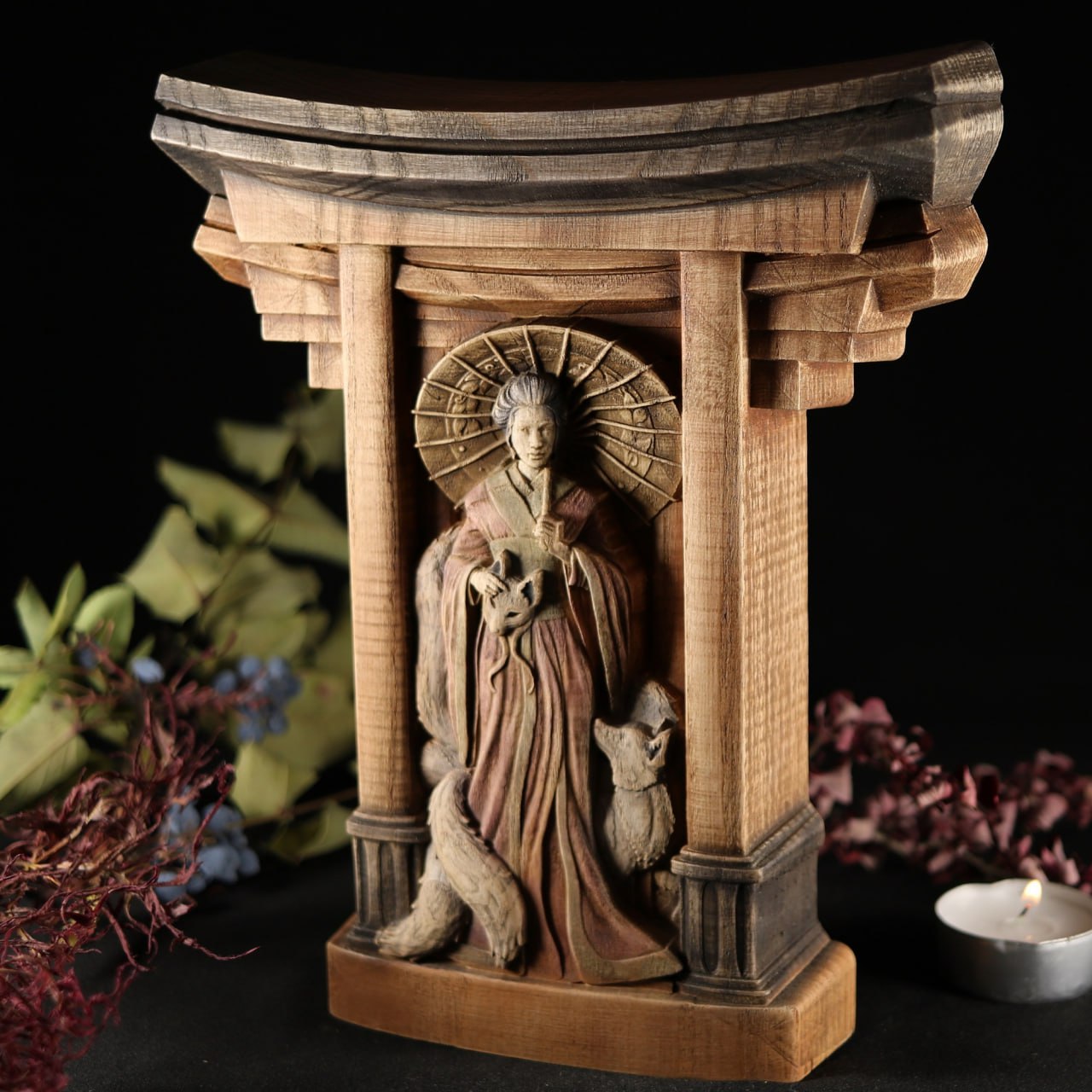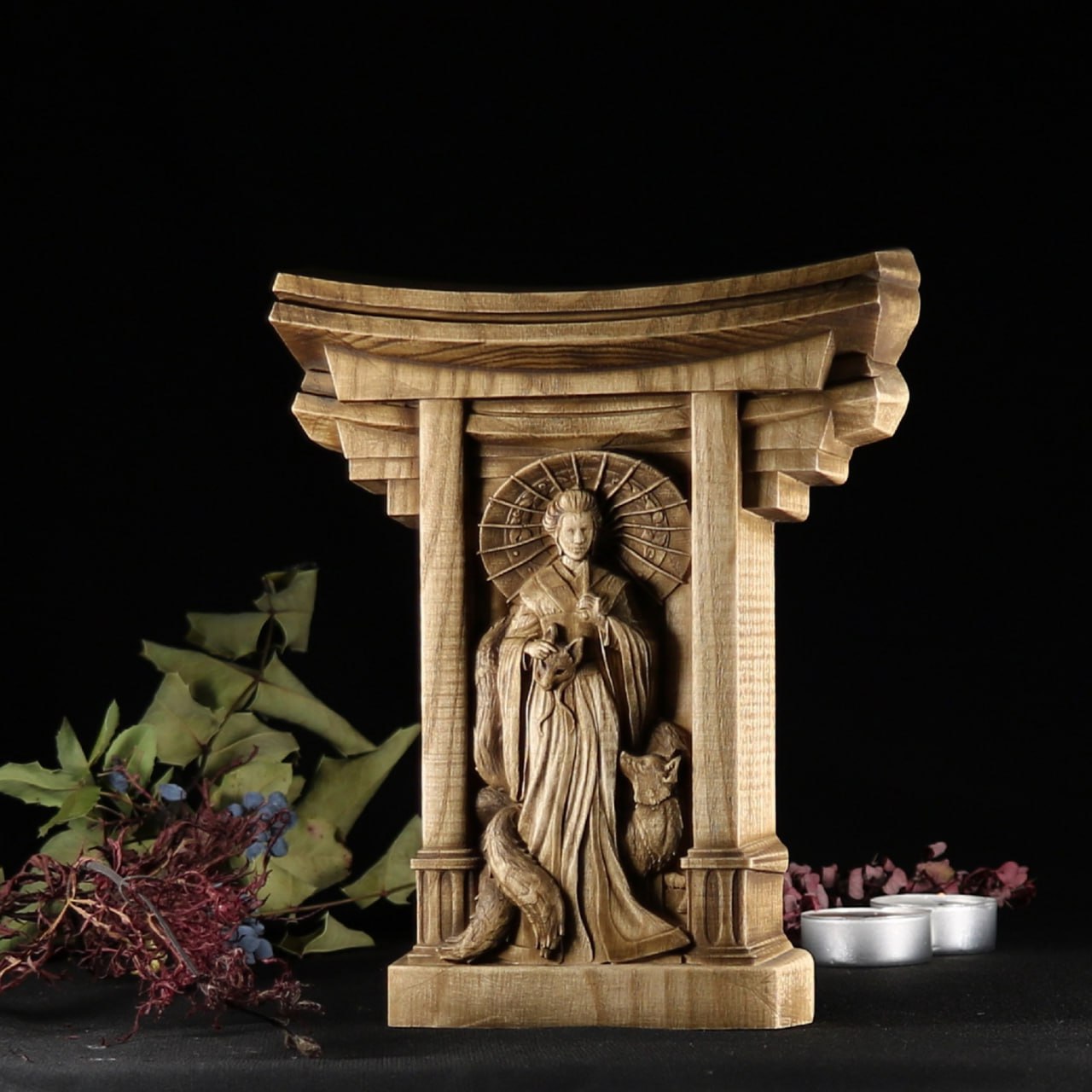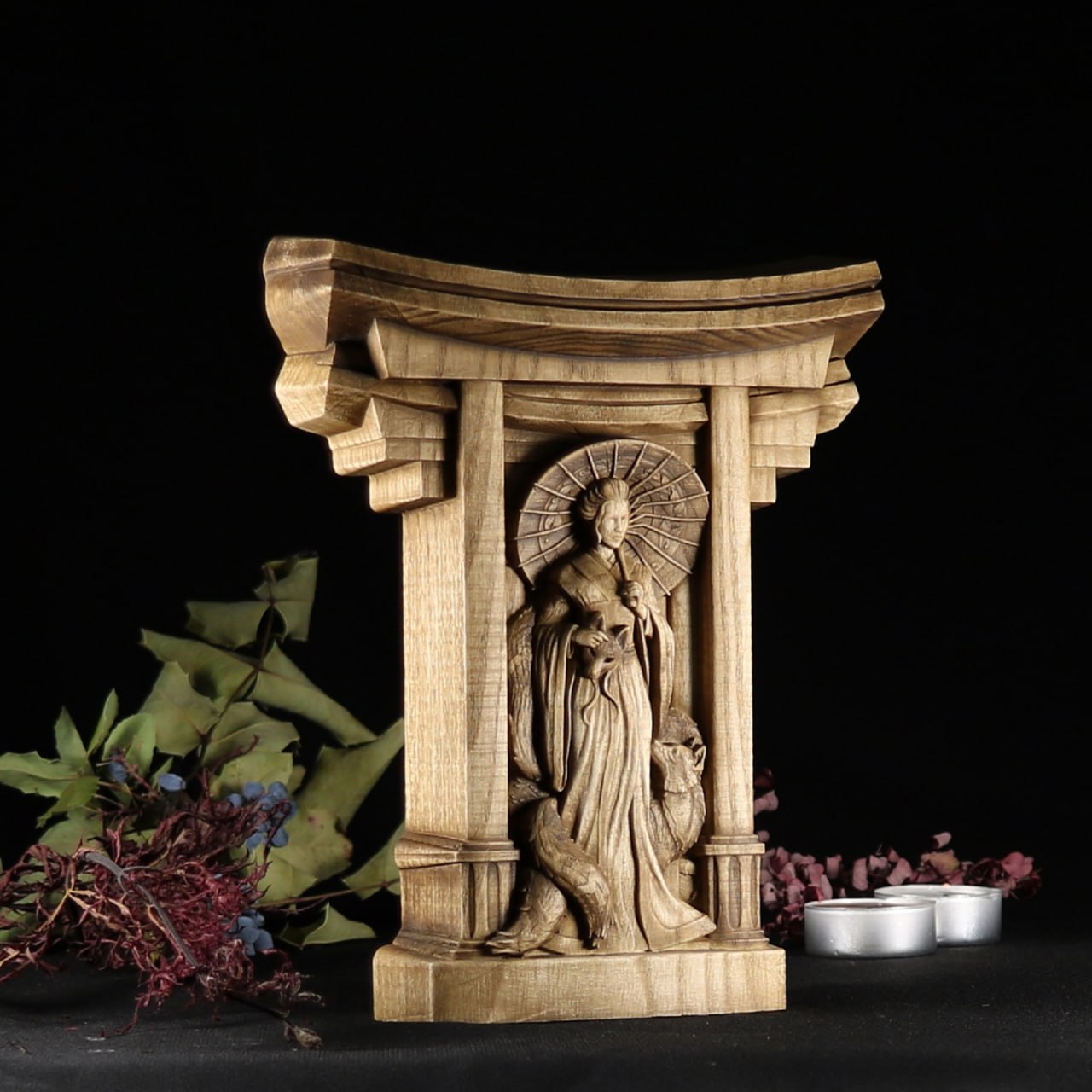This wooden statue embodies the unique energy and grace of Inari Okami. It is expertly crafted from high-quality wood and showcases intricate details that symbolize the divine aspects of Inari Okami. Its powerful stance, expressive face, and symbolic attributes create an impression of wisdom, strength, and abundance.