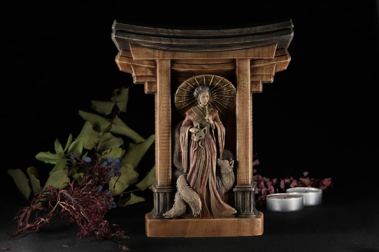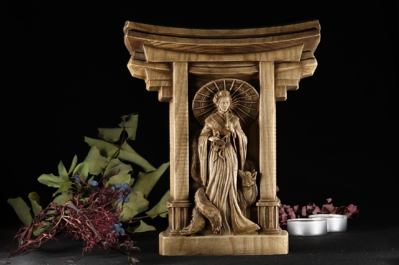 Inari Okami wooden statue a prominent symbol of Japanese mythology and culture.