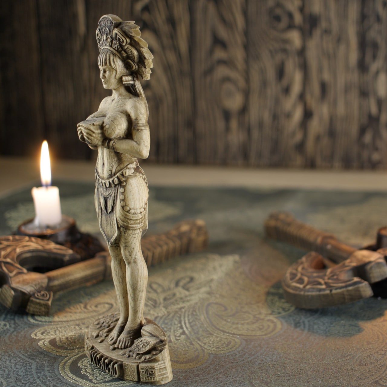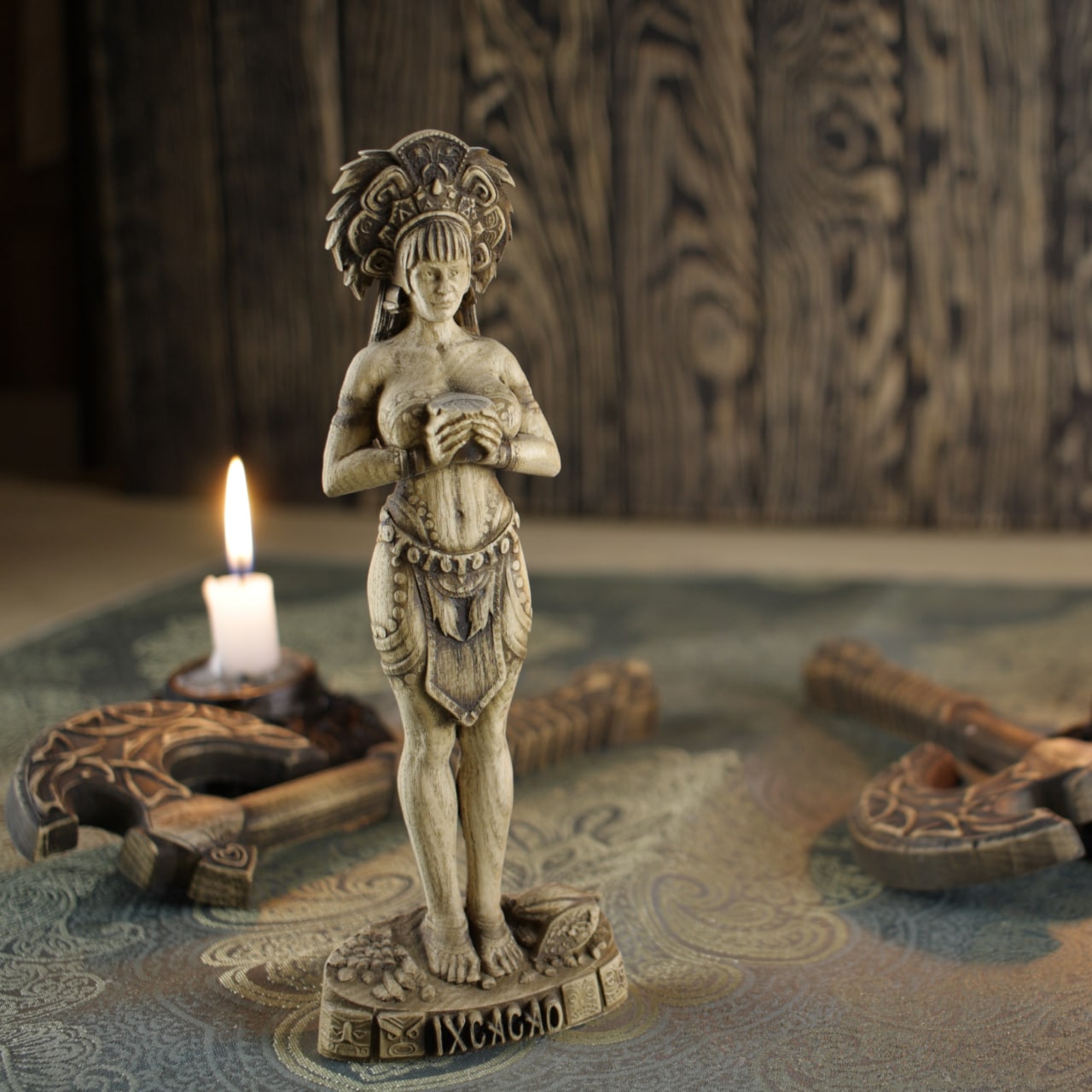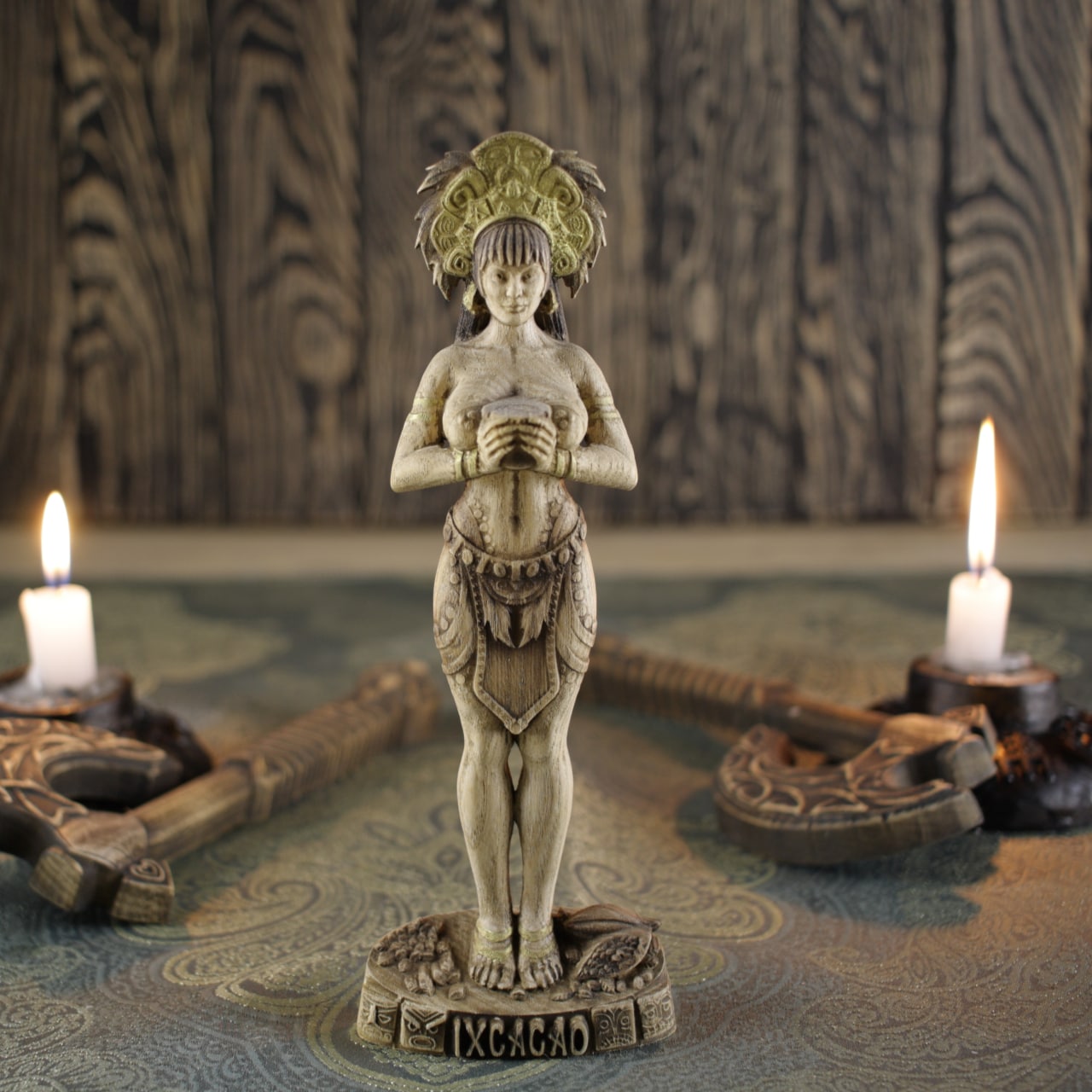 IxCacao is the Mayan Goddess of the cacao tree and was often invoked in prayer along with other agricultural deities' handmade wooden statue carvings, and Aztec statues from ecological material.