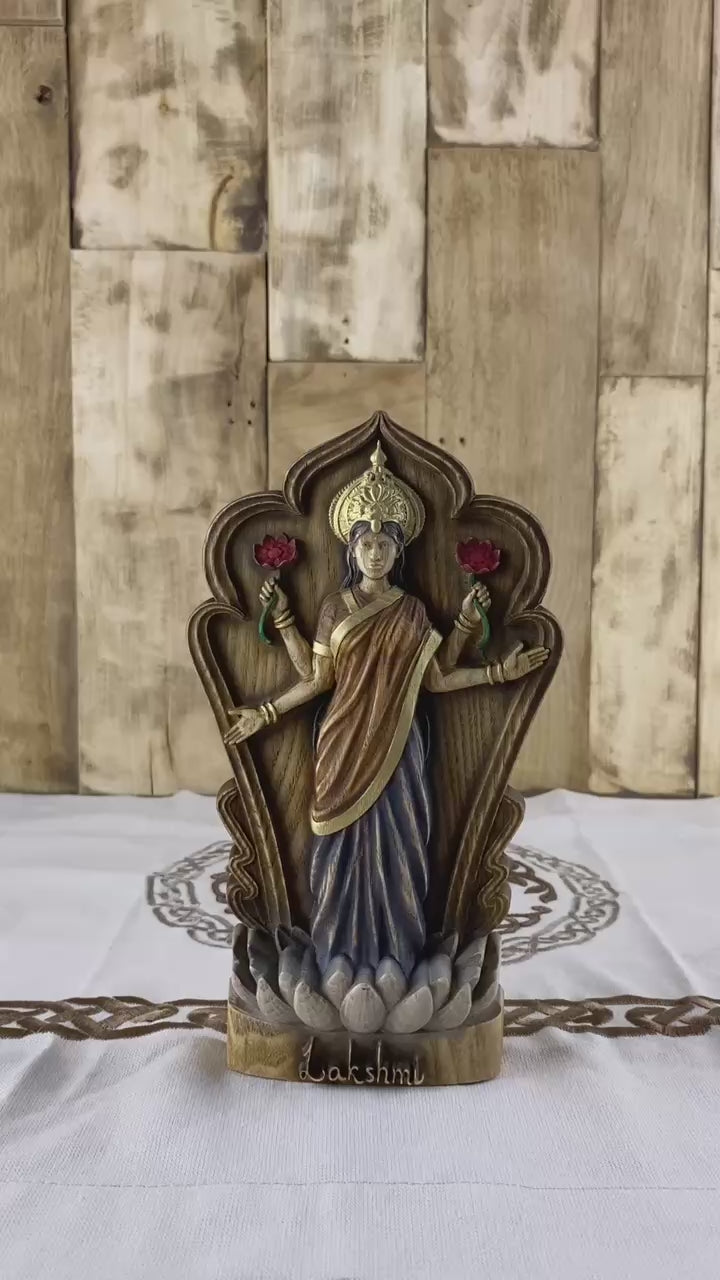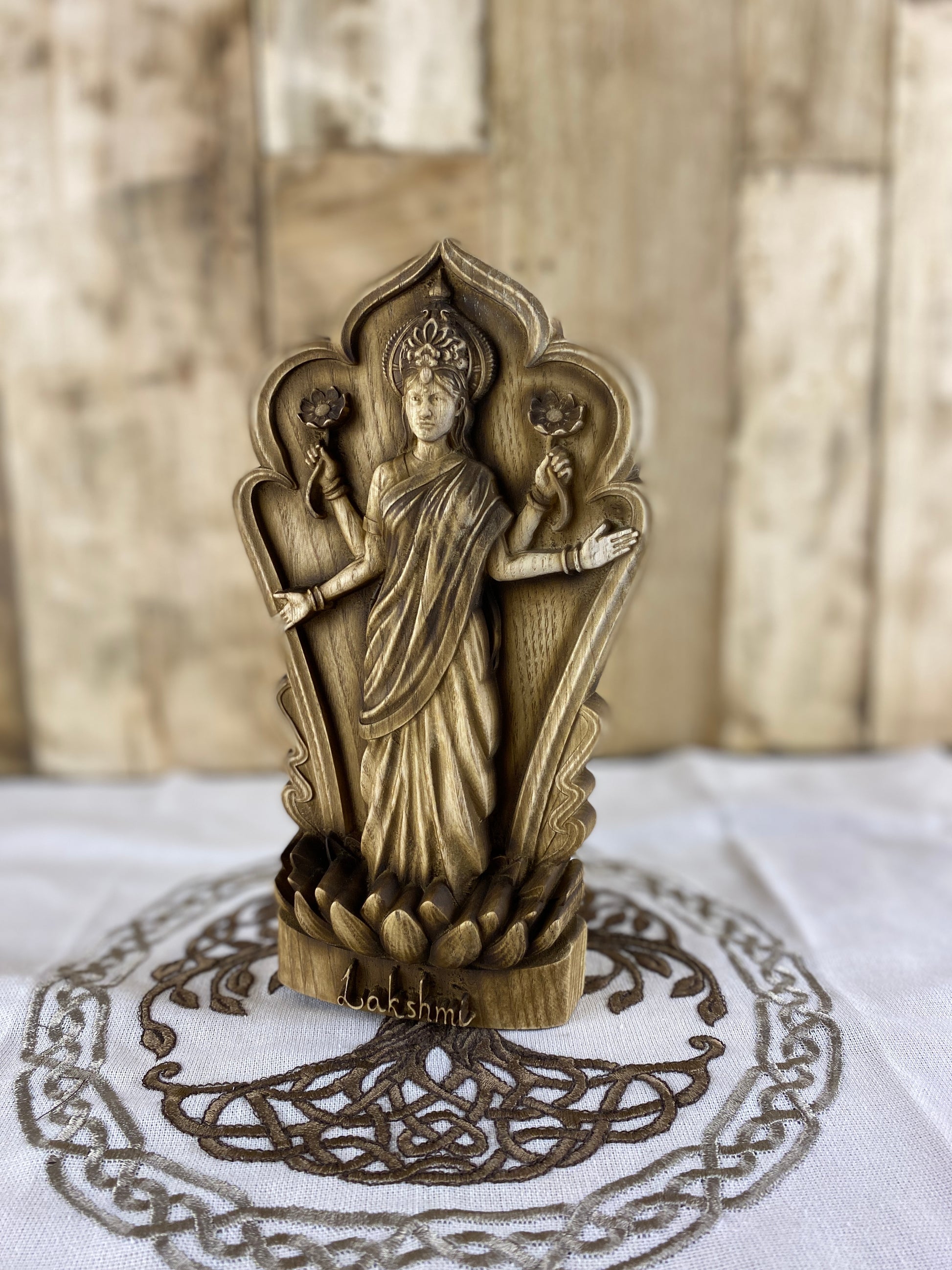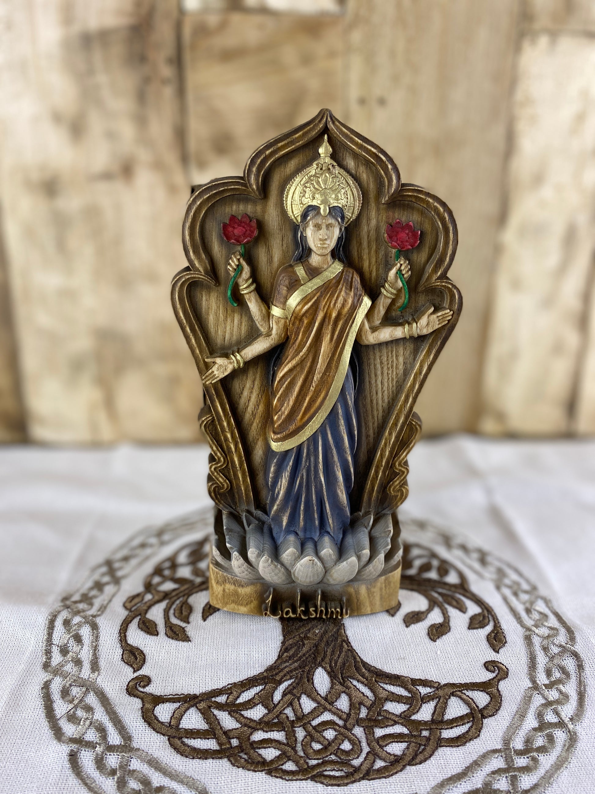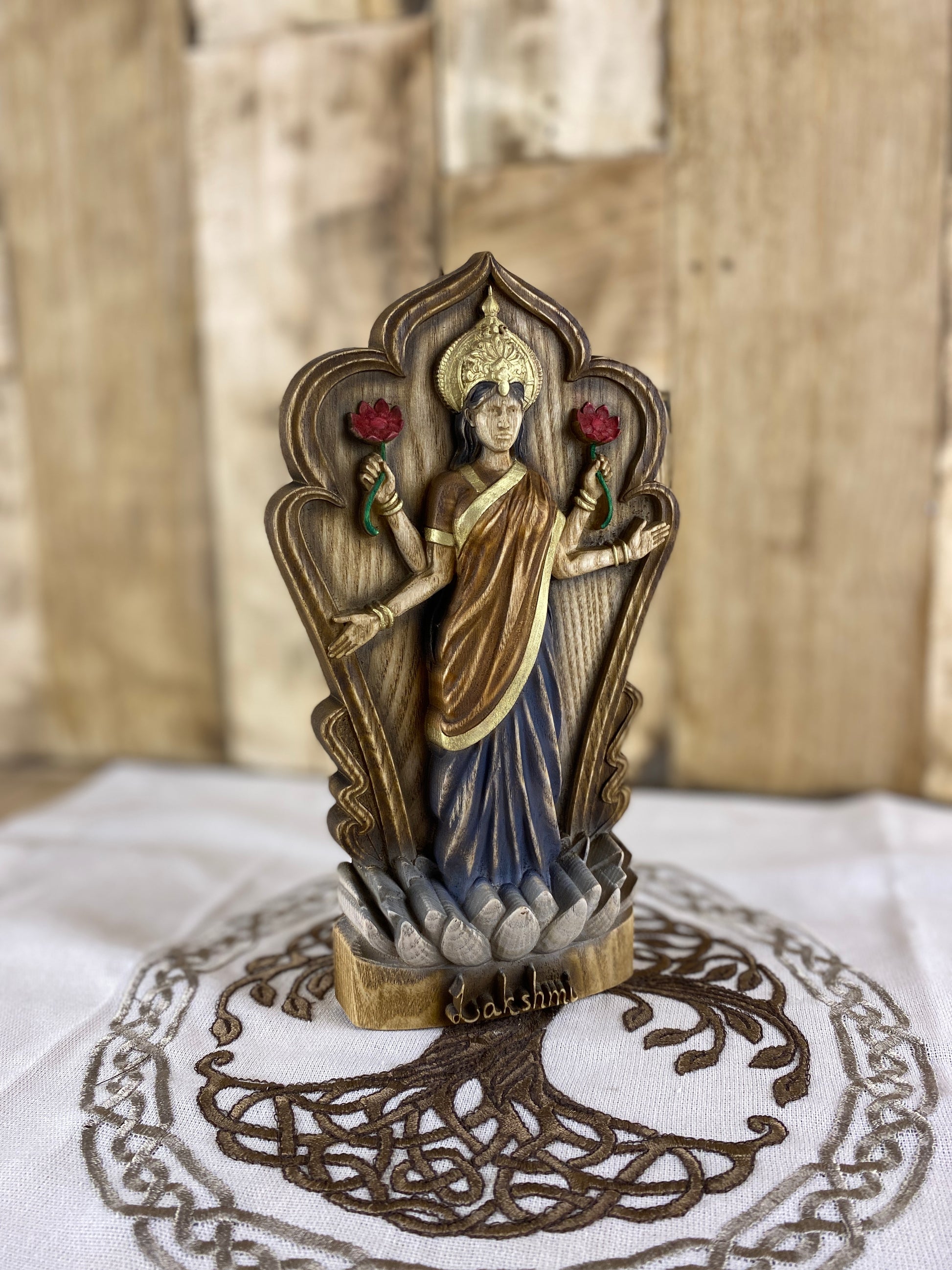 Hand-Carved Wooden Lakshmi Statue – Hindu Goddess of Prosperity and Abundance