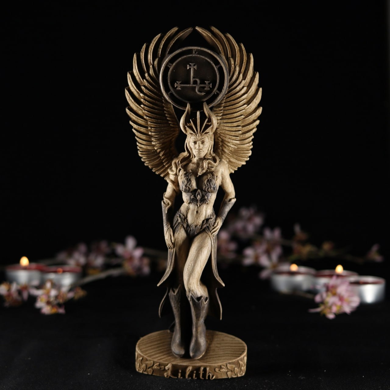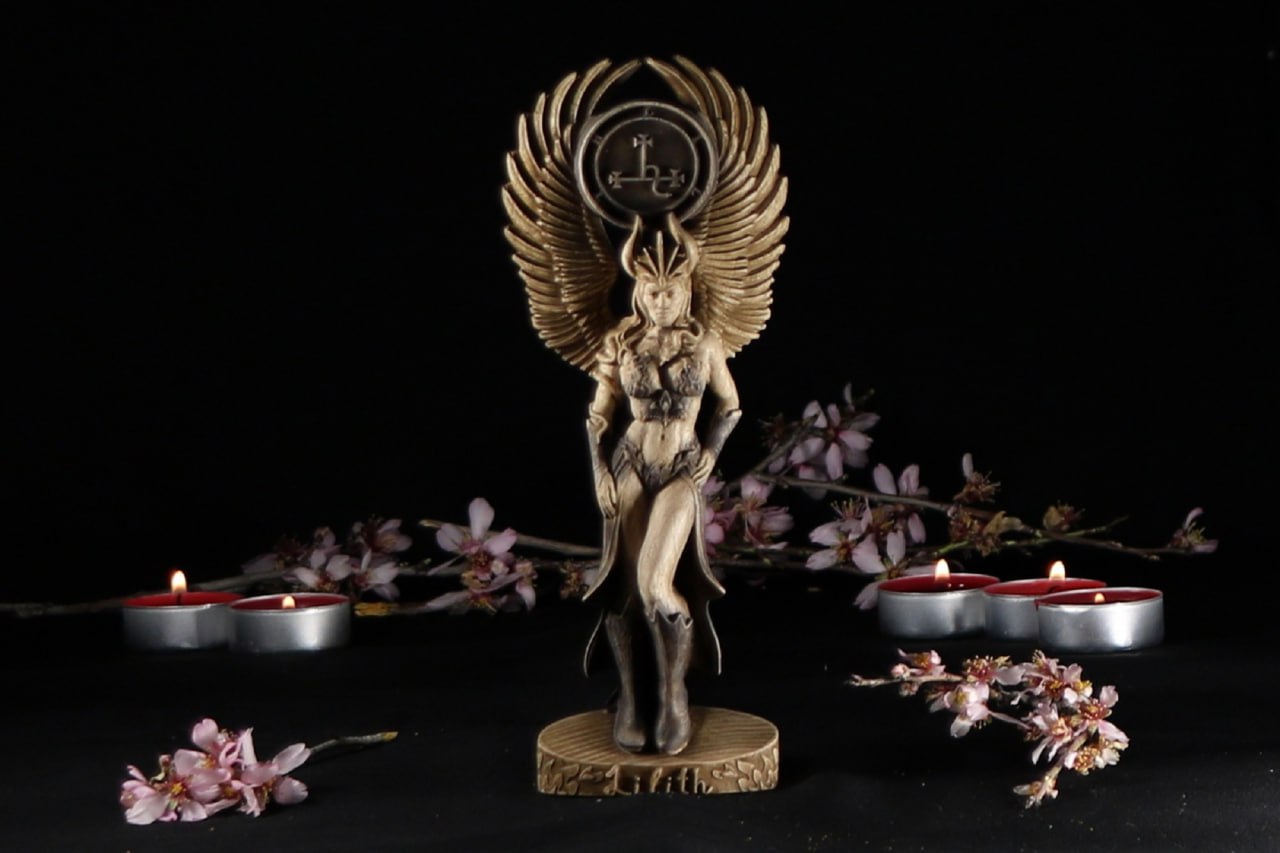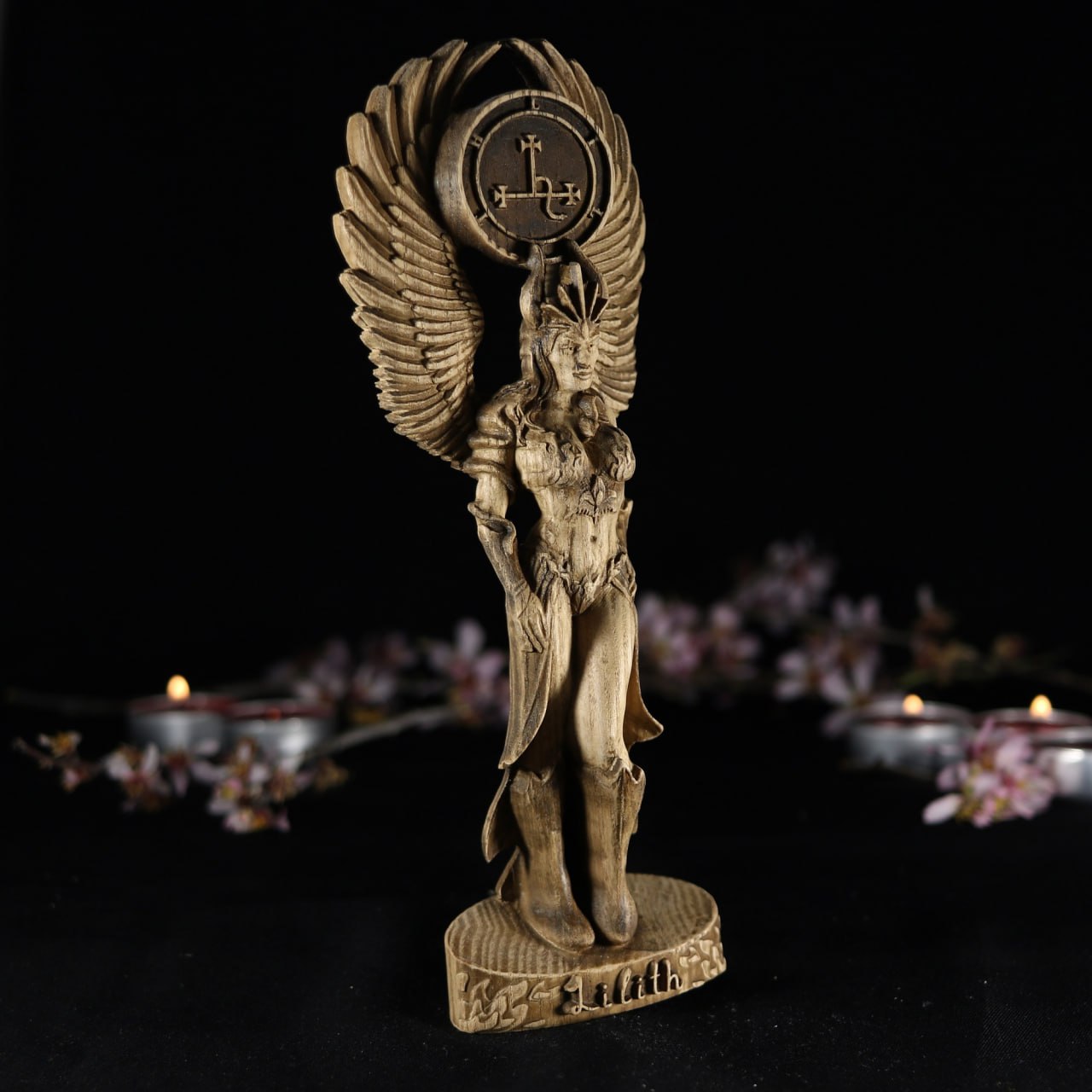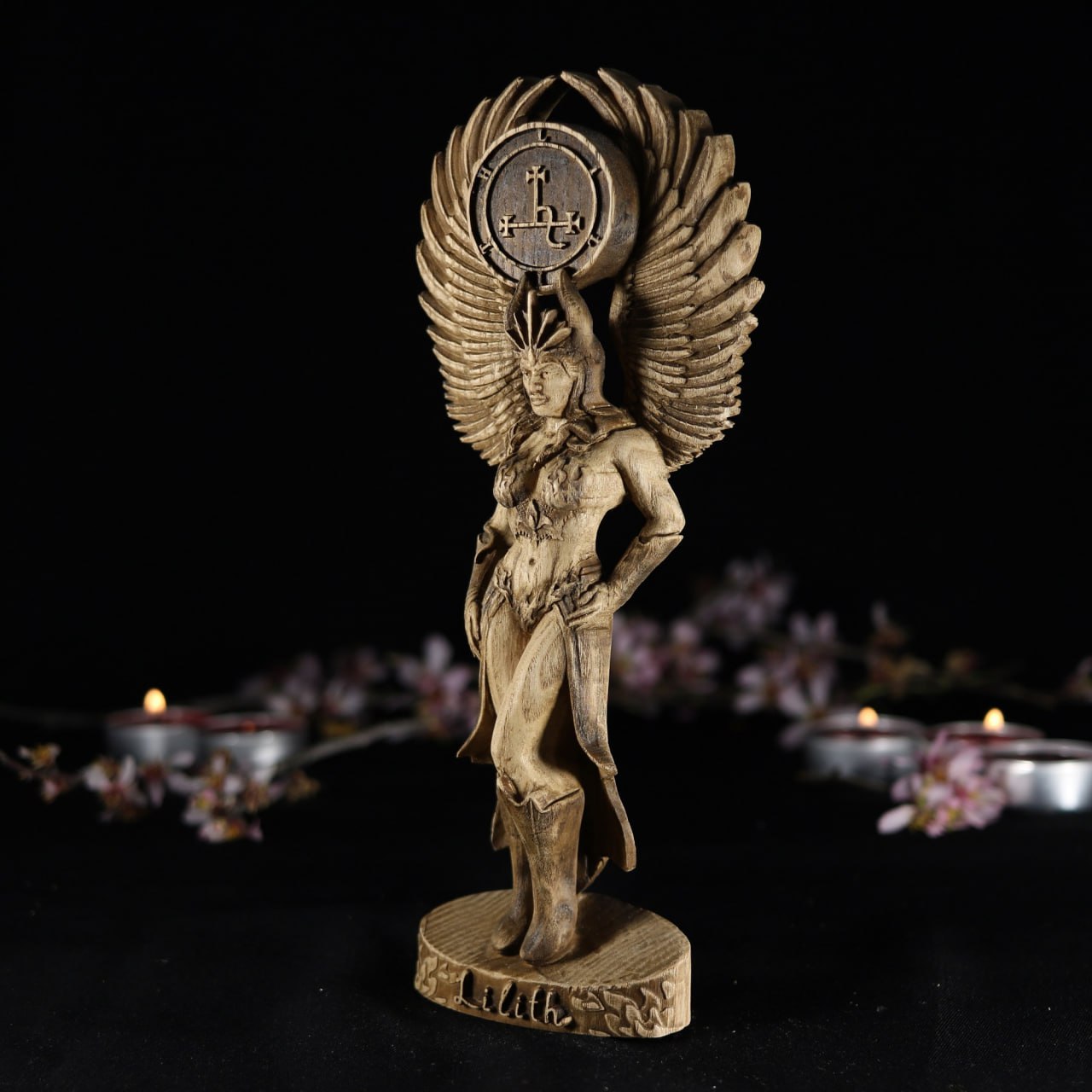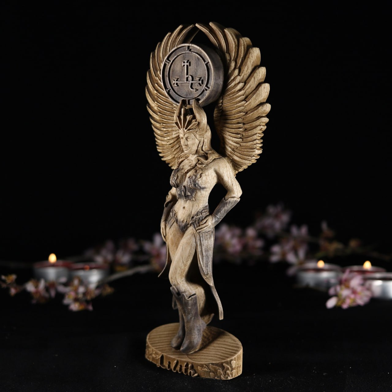 Lilith, the first Adam’s beloved, the demoness in Jewish demonology, the mother of demons, handmade wooden goddess statue from ecological material.