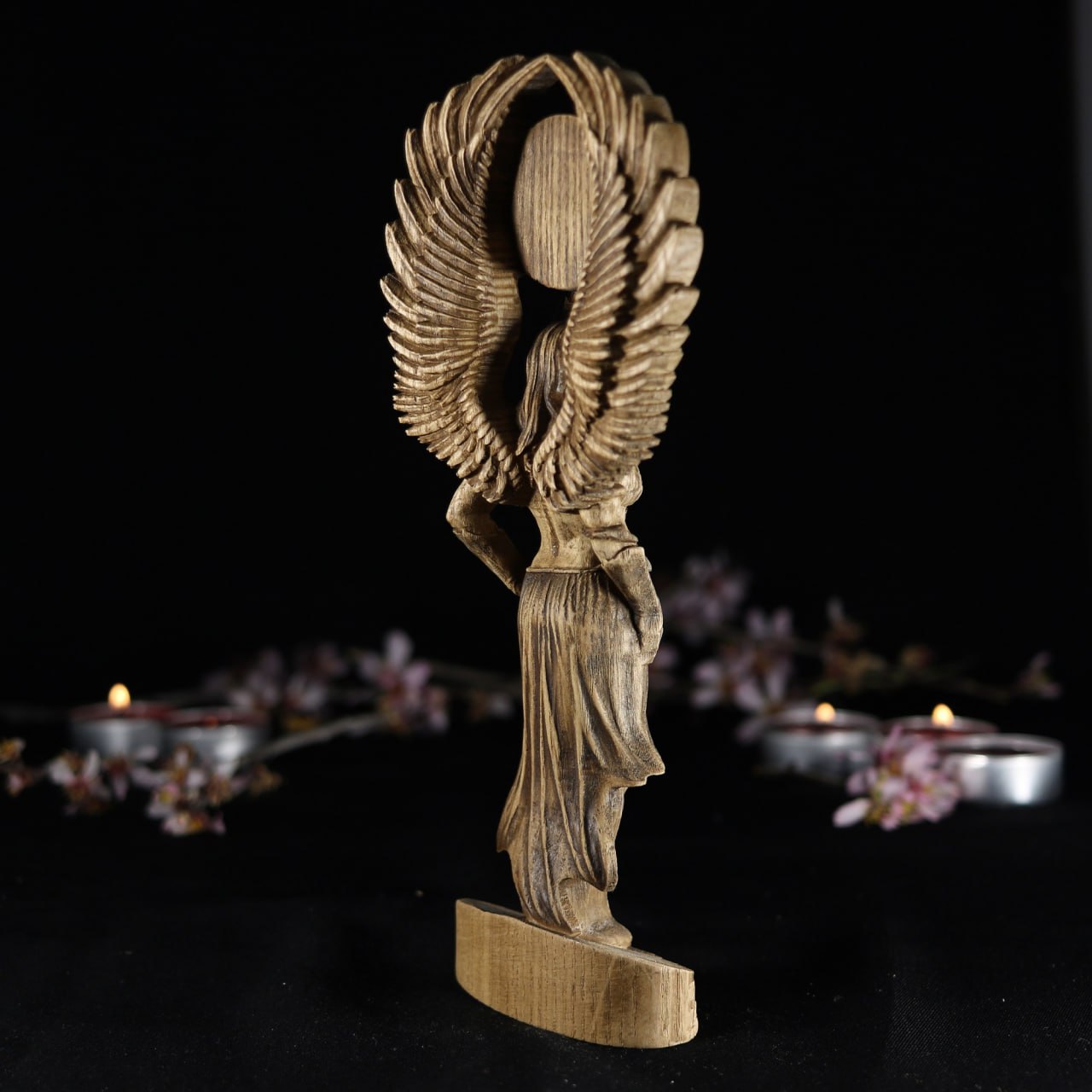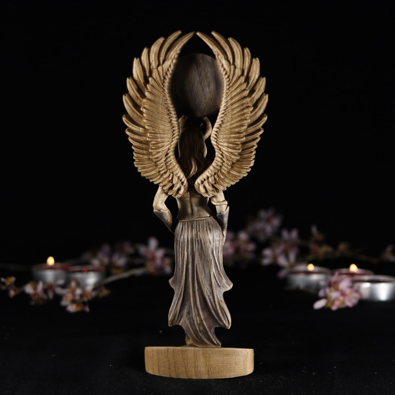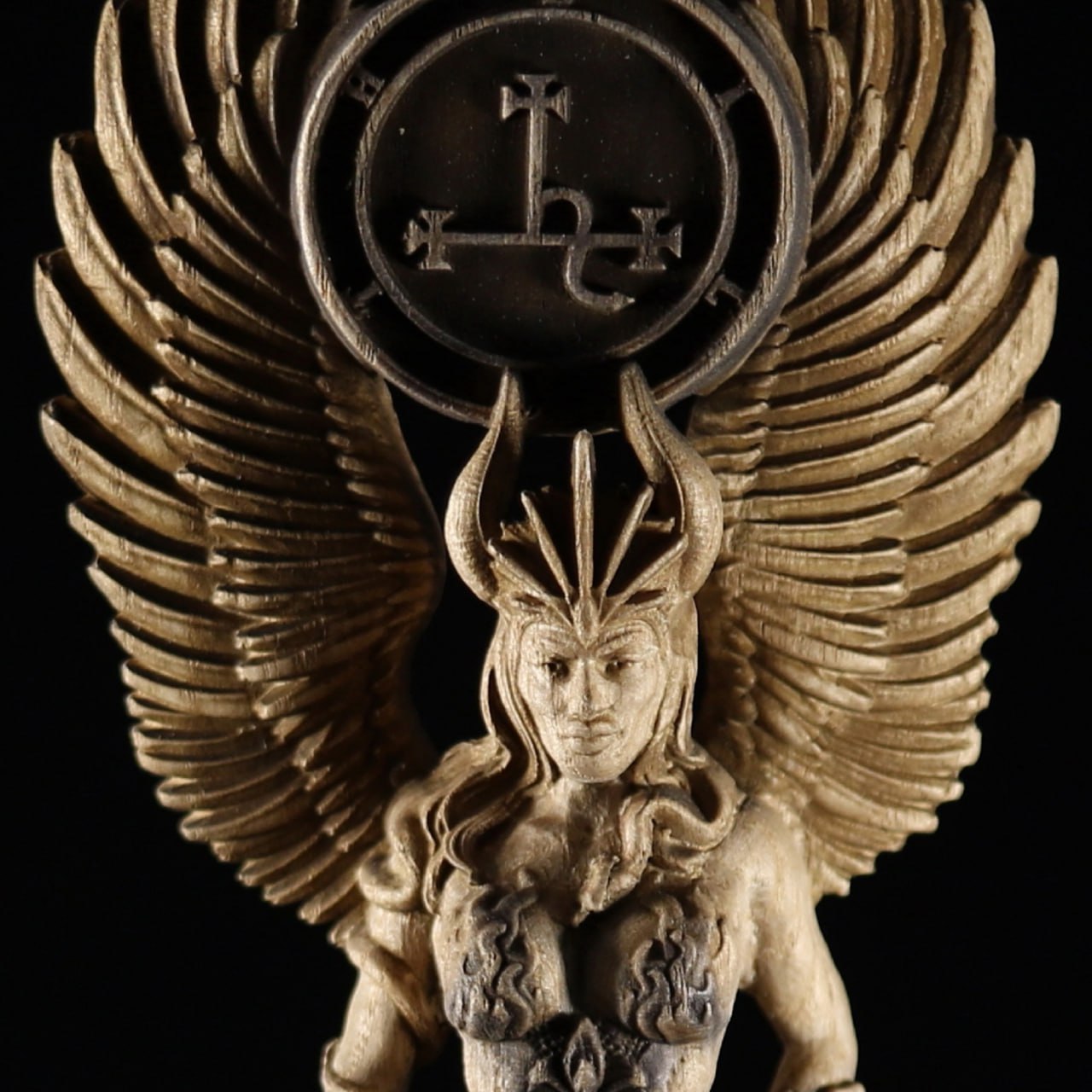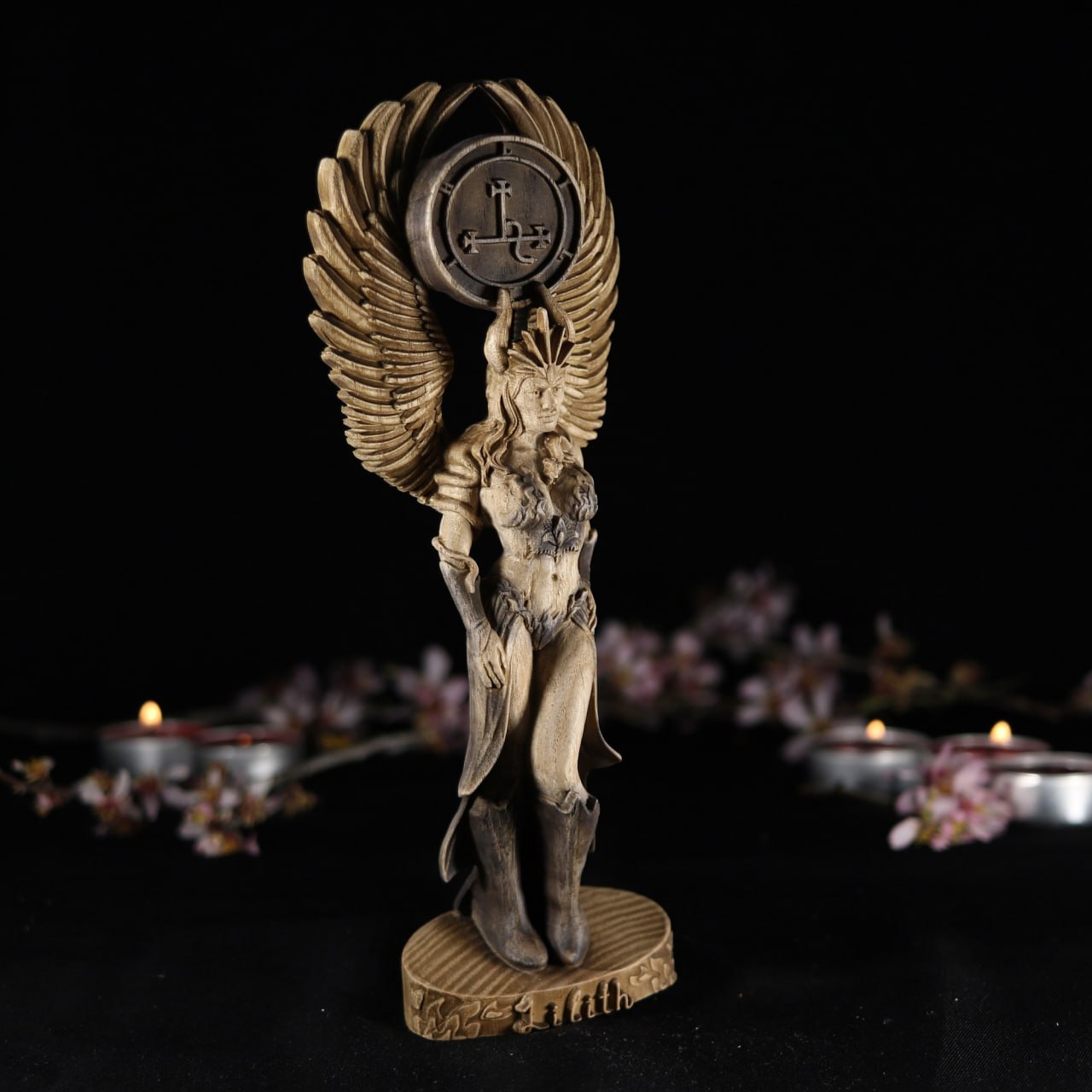 Lilith, the first Adam’s beloved, the demoness in Jewish demonology, the mother of demons, handmade wooden goddess statue from ecological material.