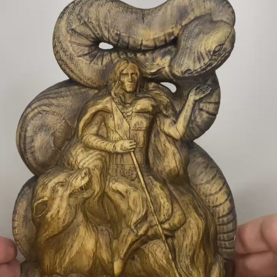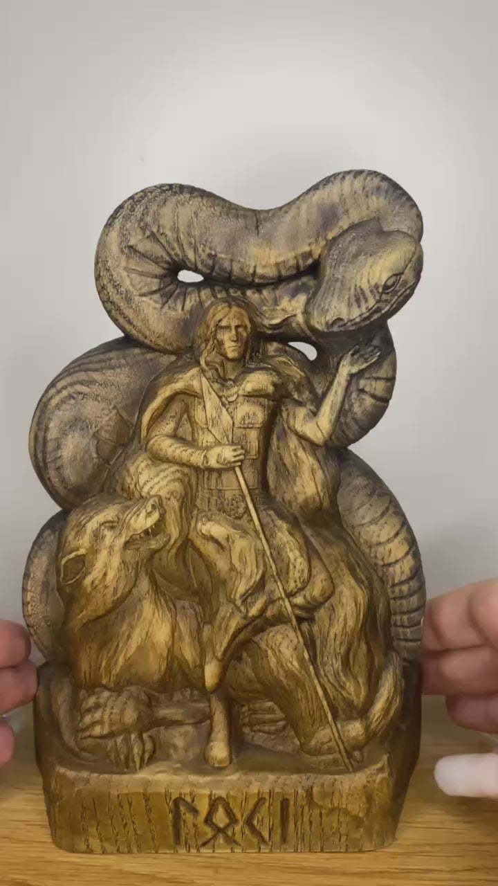 Loki, god of fire and deceit, handmade wooden statue carving from ecological material.