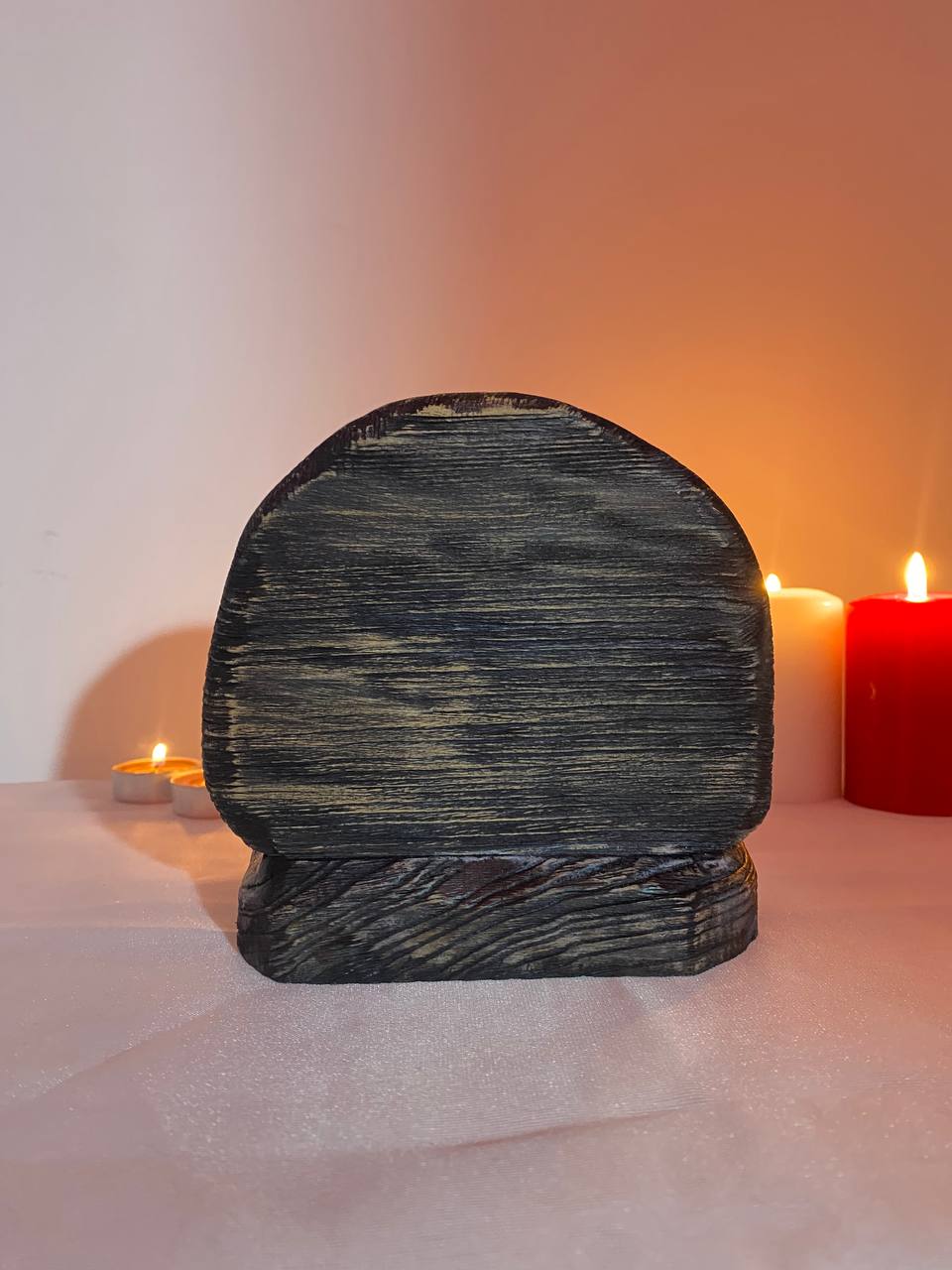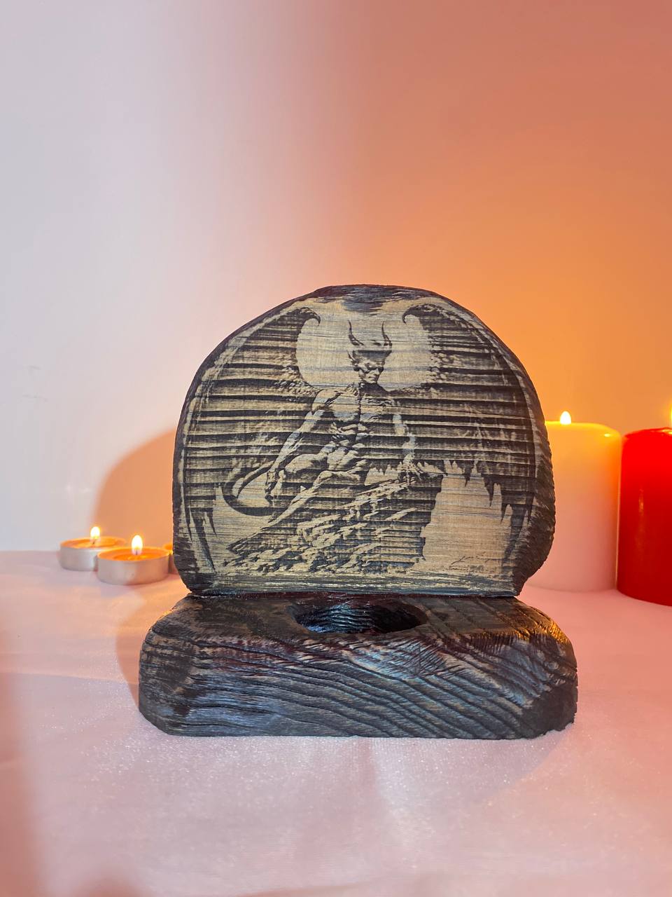 Crafted from natural wood, this candle holder offers durability and a warm, organic aesthetic. The advanced laser engraving technology ensures sharp, contrasting lines that meticulously capture every intricate detail of Lucifer’s form, highlighting his seated position as a representation of authority and power. The finely spread wings and prominent horns solidify his image as the ultimate ruler of darkness.