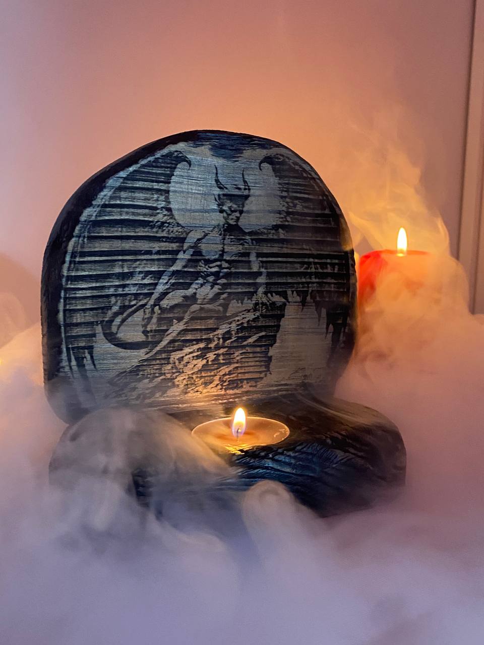 Enhance your home or altar with the exquisitely carved wooden viola candle holder, designed to embody an aura of magic and mysticism. Masterfully crafted with intricate details, this stunning piece showcases the dark elegance of Lucifer in all his formidable glory.