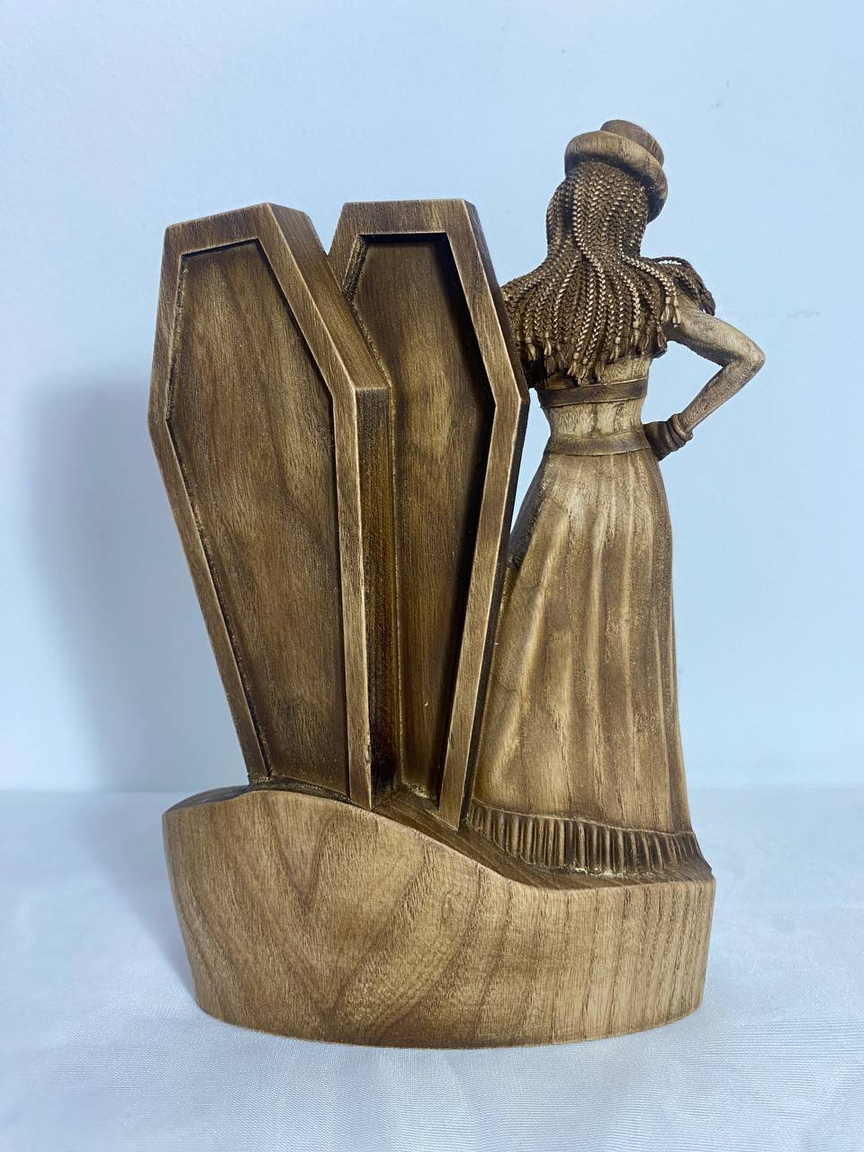 Exclusive Wooden Carved Statuette of Mama Brigitte - Loa of Death and Healing.Introducing a unique wooden carved statuette of Mama Brigitte, the magical loa of death and healing from Haitian voodoo. This graceful work of art will make a wonderful addition to your collection or religious altar.This Mama Brigitte statue is perfect for those who practice voodoo or simply appreciate art and culture. Mama Brigitta is depicted in all her majesty, symbolizing her power, wisdom and ability to heal.This statue is carved from natural wood the statue size is perfect for placing on a dresser or shelf.This statue is perfect for collectors of religious art, those seeking protection and healing, decor for a religious altar or spiritual corner, voodoo decor.