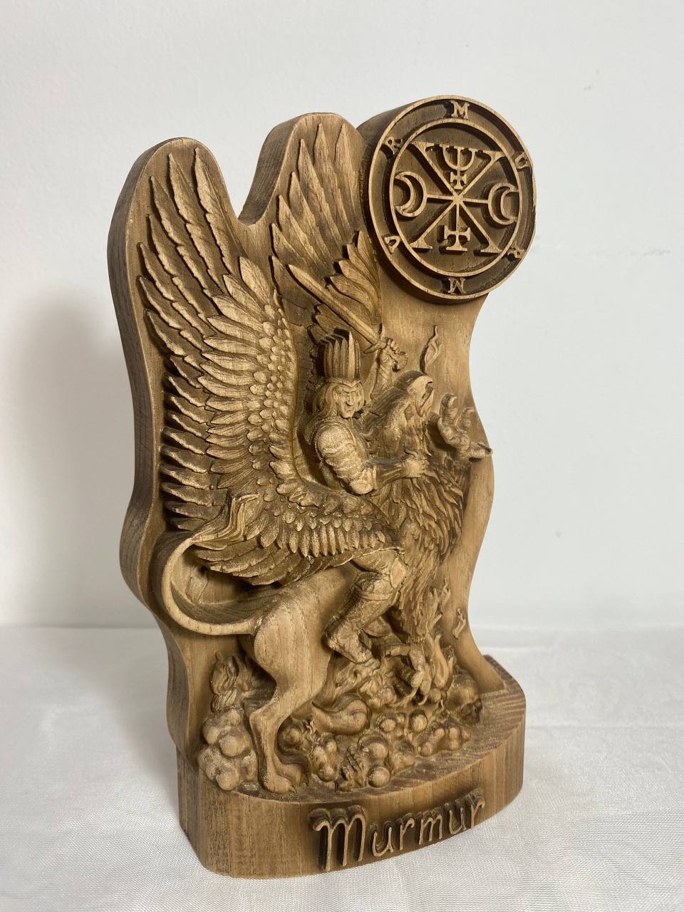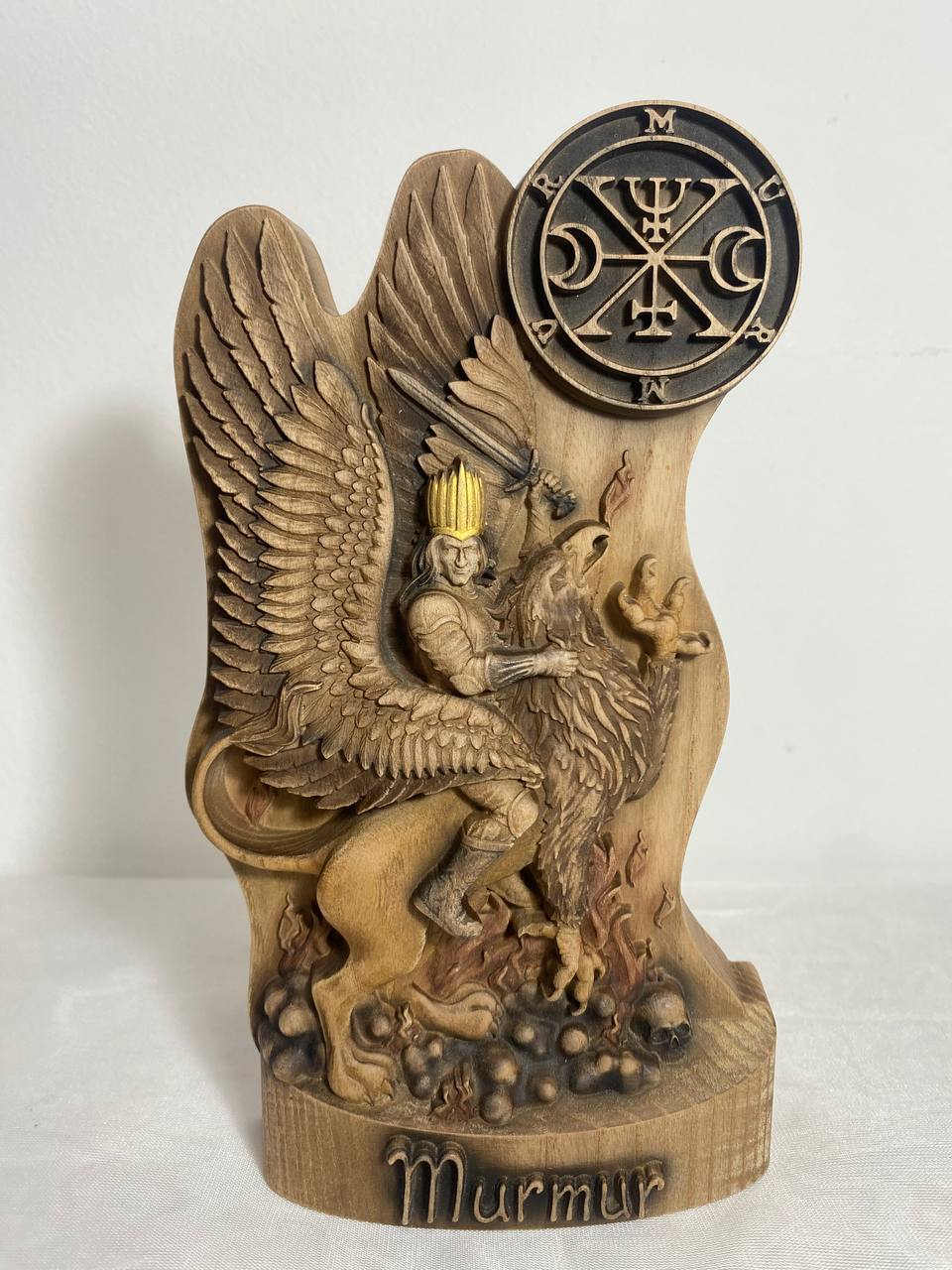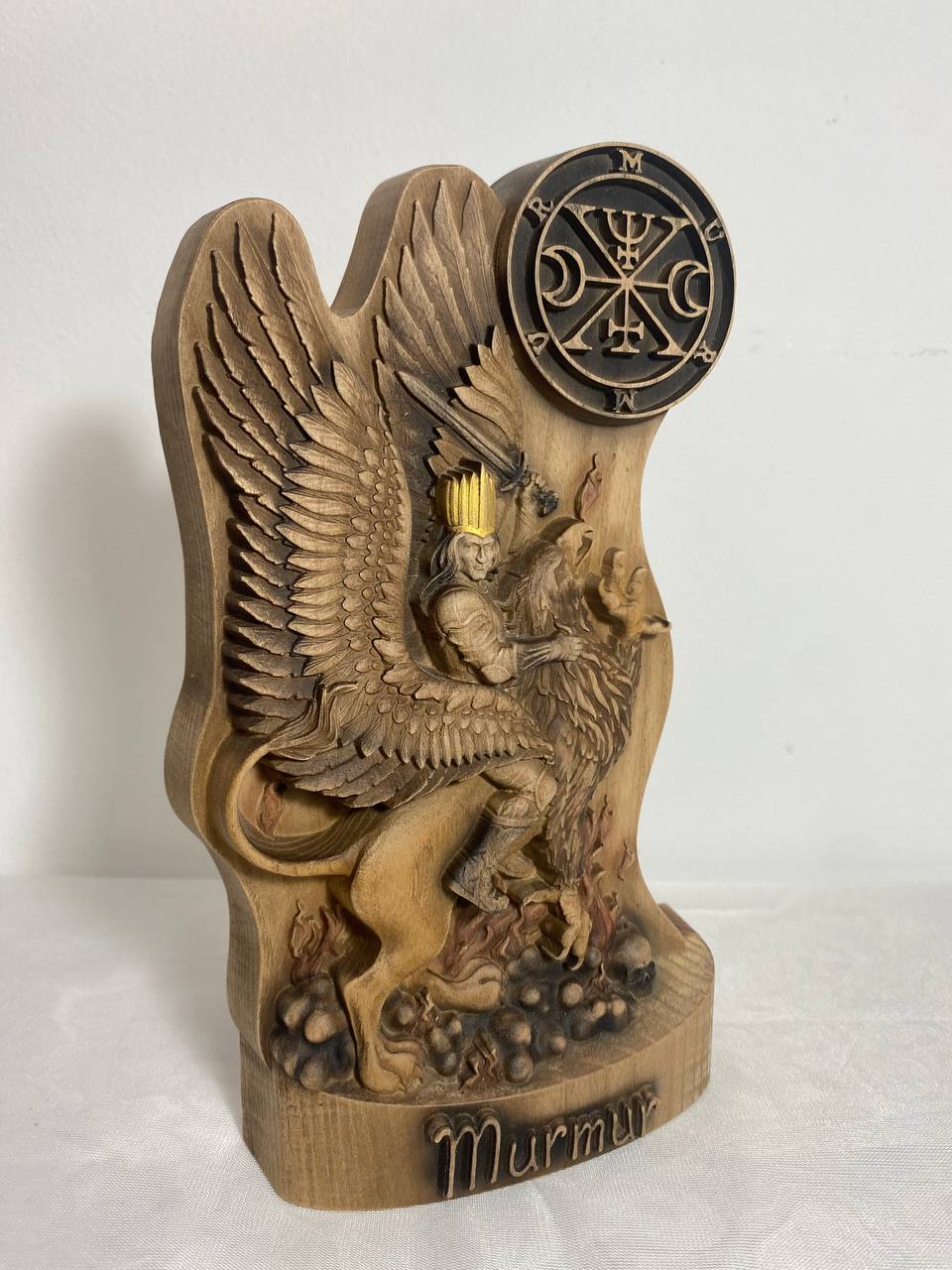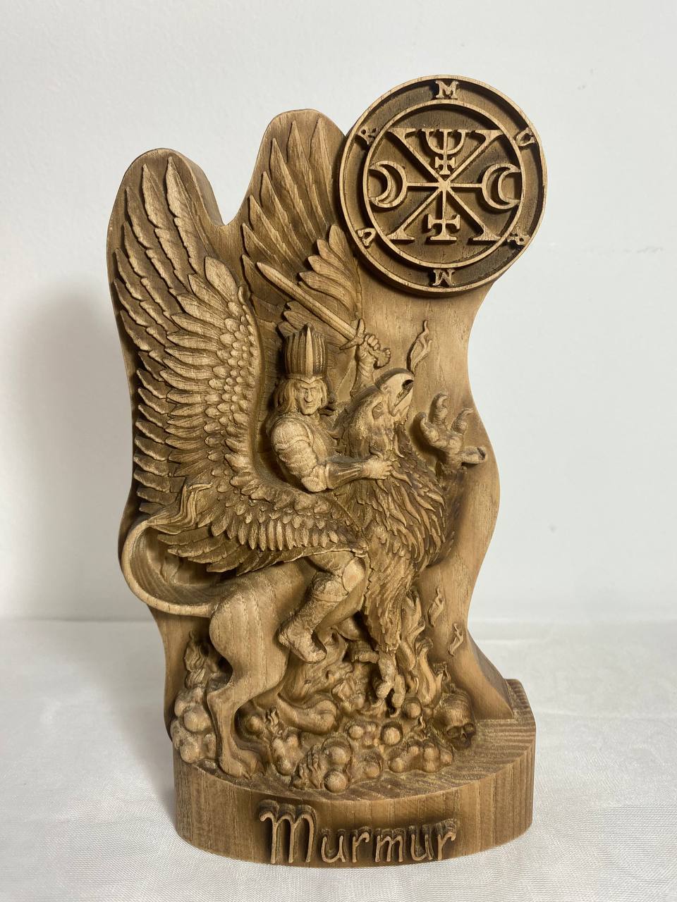 Discover the imposing wooden statue of Murmur, a high-ranking demon from the demonological texts of The Lesser Key of Solomon. This exquisitely carved statue not only showcases intricate artistry but also offers a glimpse into the occult beliefs and magical practices associated with this powerful entity.