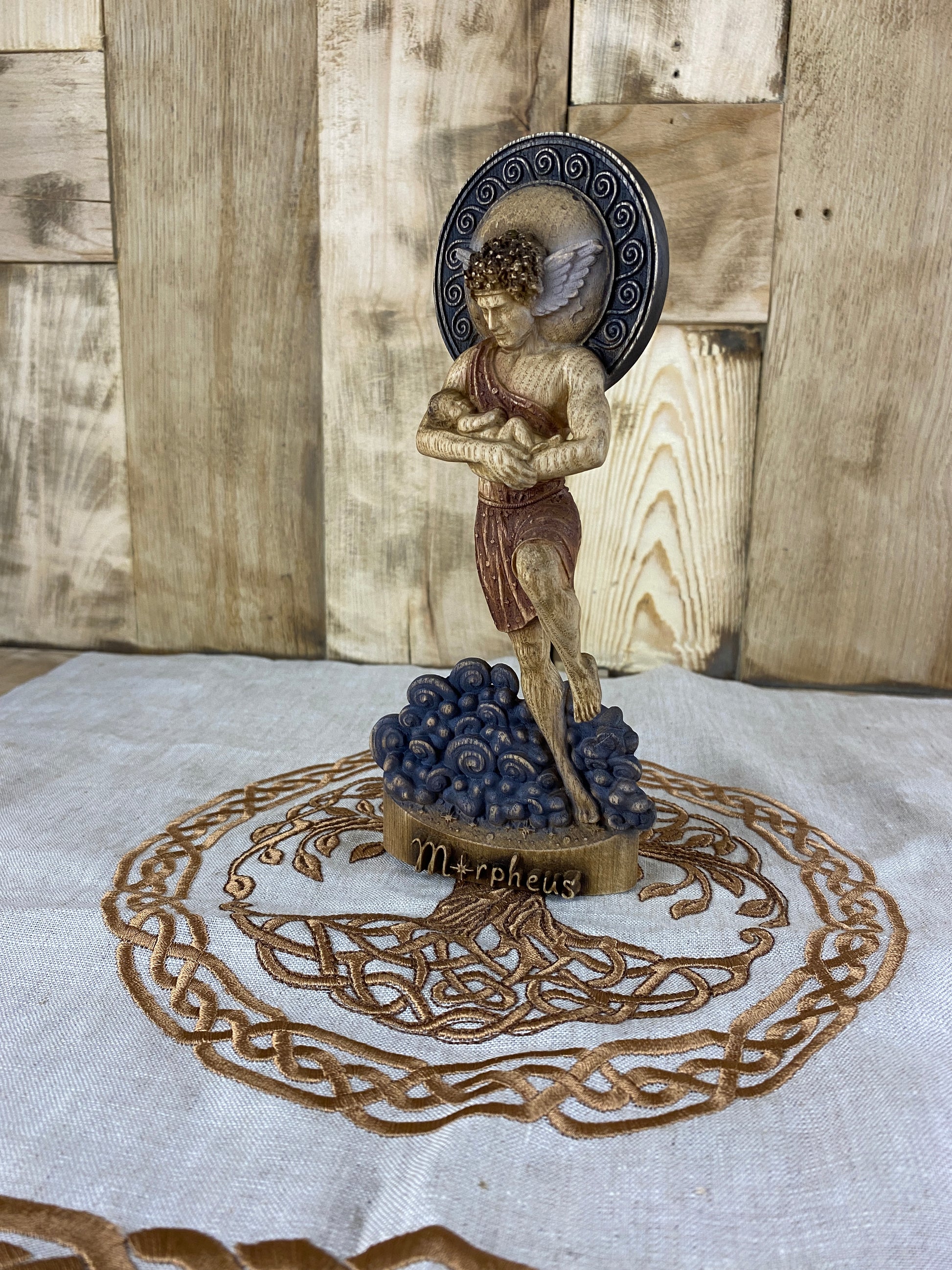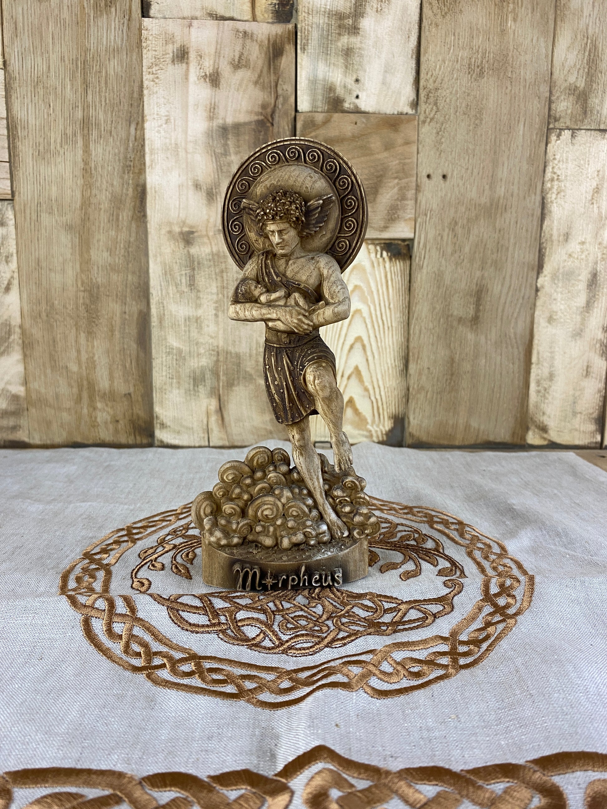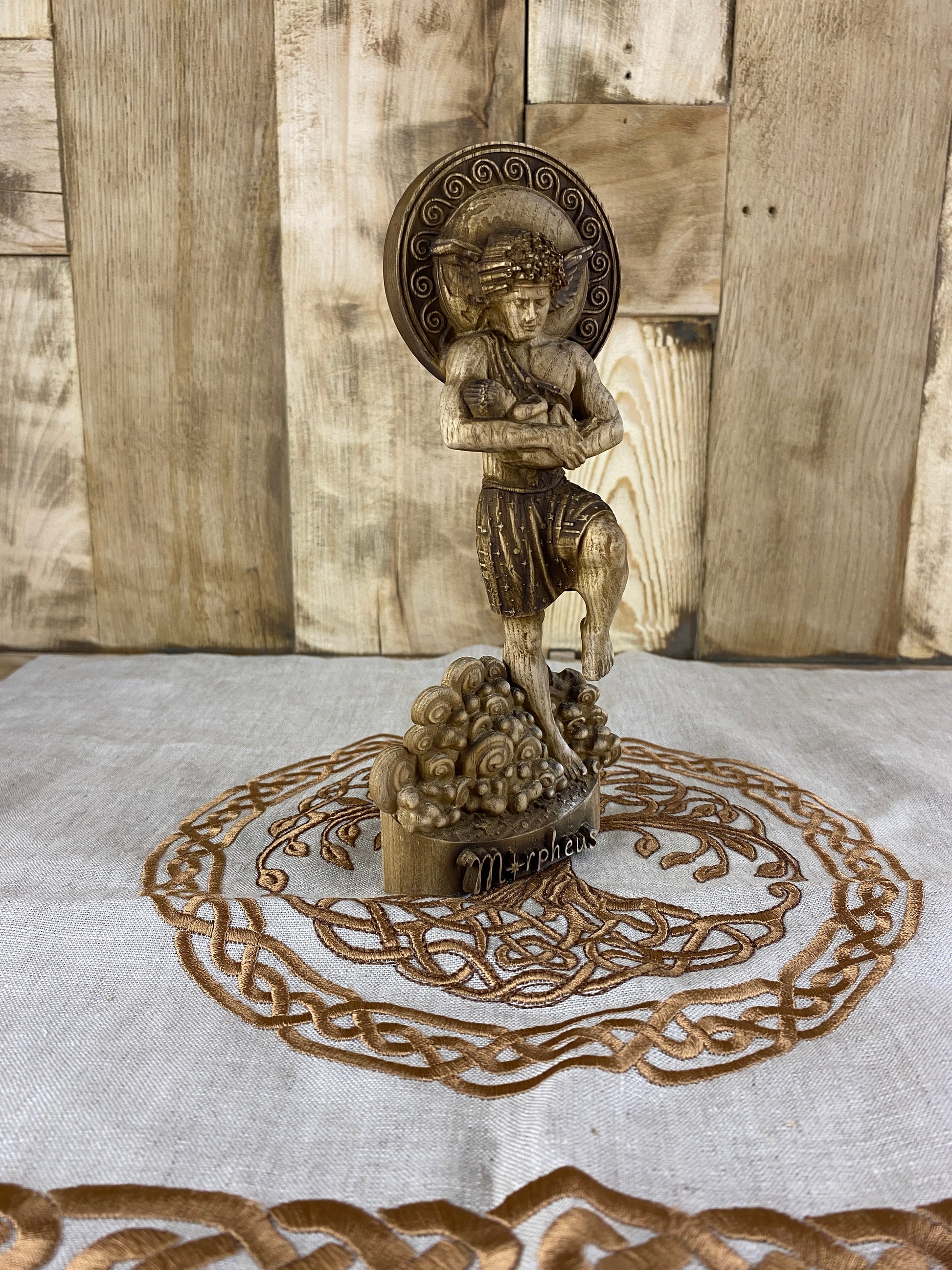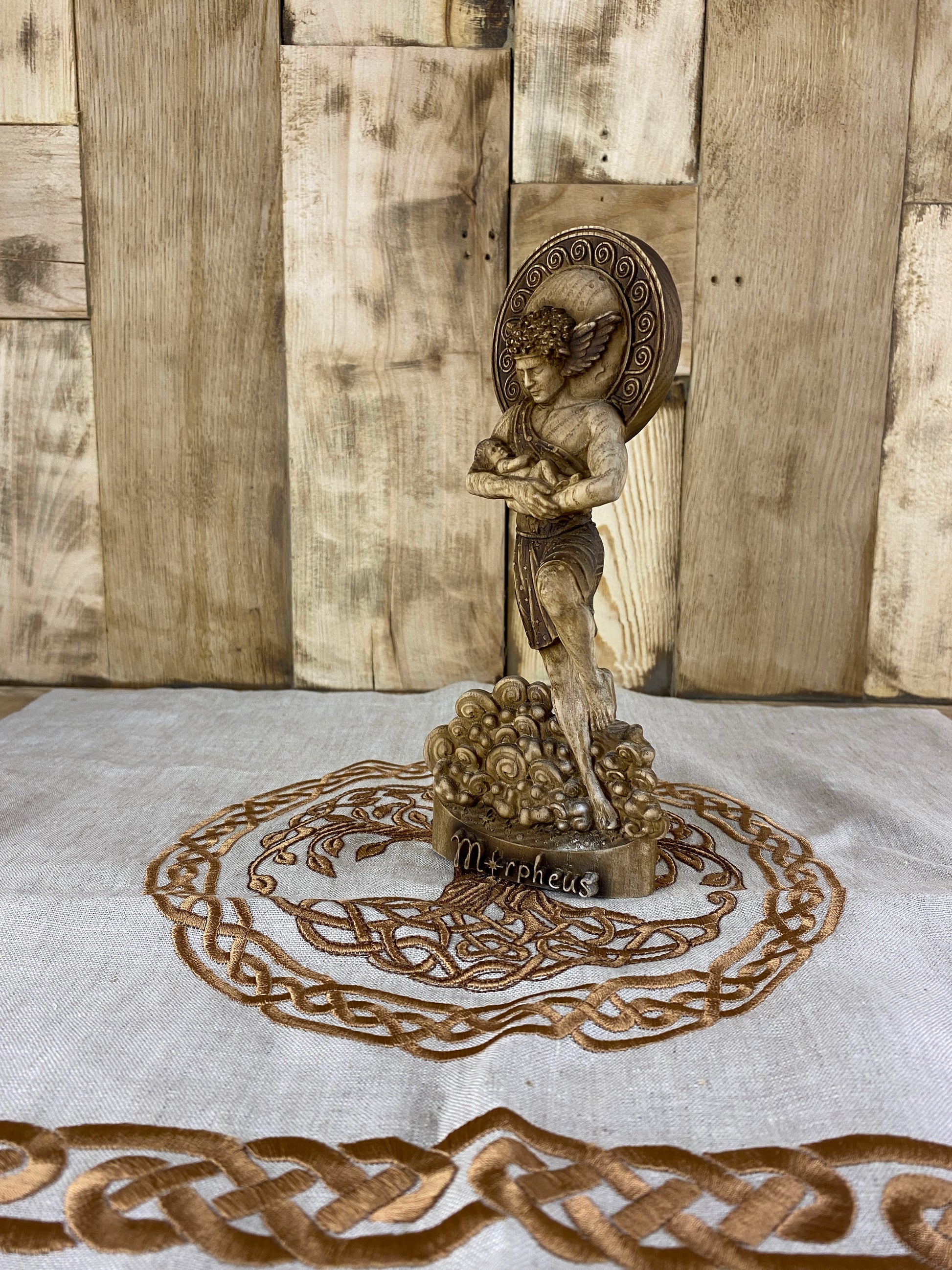 Unique wooden statue of the greek god Morpheus god with a Baby - Patron god of dreams.Introducing an exclusive wooden Morpheus statue - the greek god of dreams, holding a baby in his arms, symbolizing the innocence and purity of sleep. This meticulously carved piece is designed to add ancient greek art and greek mythology to your home greek wood decor or to be a meaningful gift for a special person.Natural wood with deep and warm shades was chosen, which ensures durability and aesthetic appeal. Each detail is carved with extreme attention to convey the gentleness of Morpheus' image and his care for the baby.The greek statue depicts Morpheus as a gentle patron of dreams, and the baby symbolizes a new beginning and the endless possibilities that sleep brings.The greek sculpture of the god Morpheus is a work of art that brings an aura of peace and relaxation to your home. It is ideal for placing in a bedroom or meditation space where every glance at it will remind you of the importance of sleep and rest. It is an excellent choice for collectors of unique interior items, as well as for those who are looking for a special gift with a deep symbolic meaning.