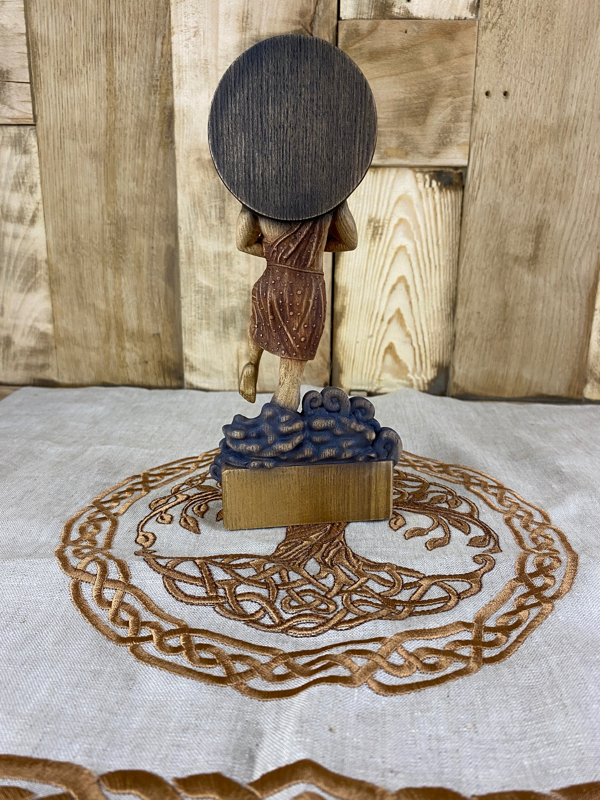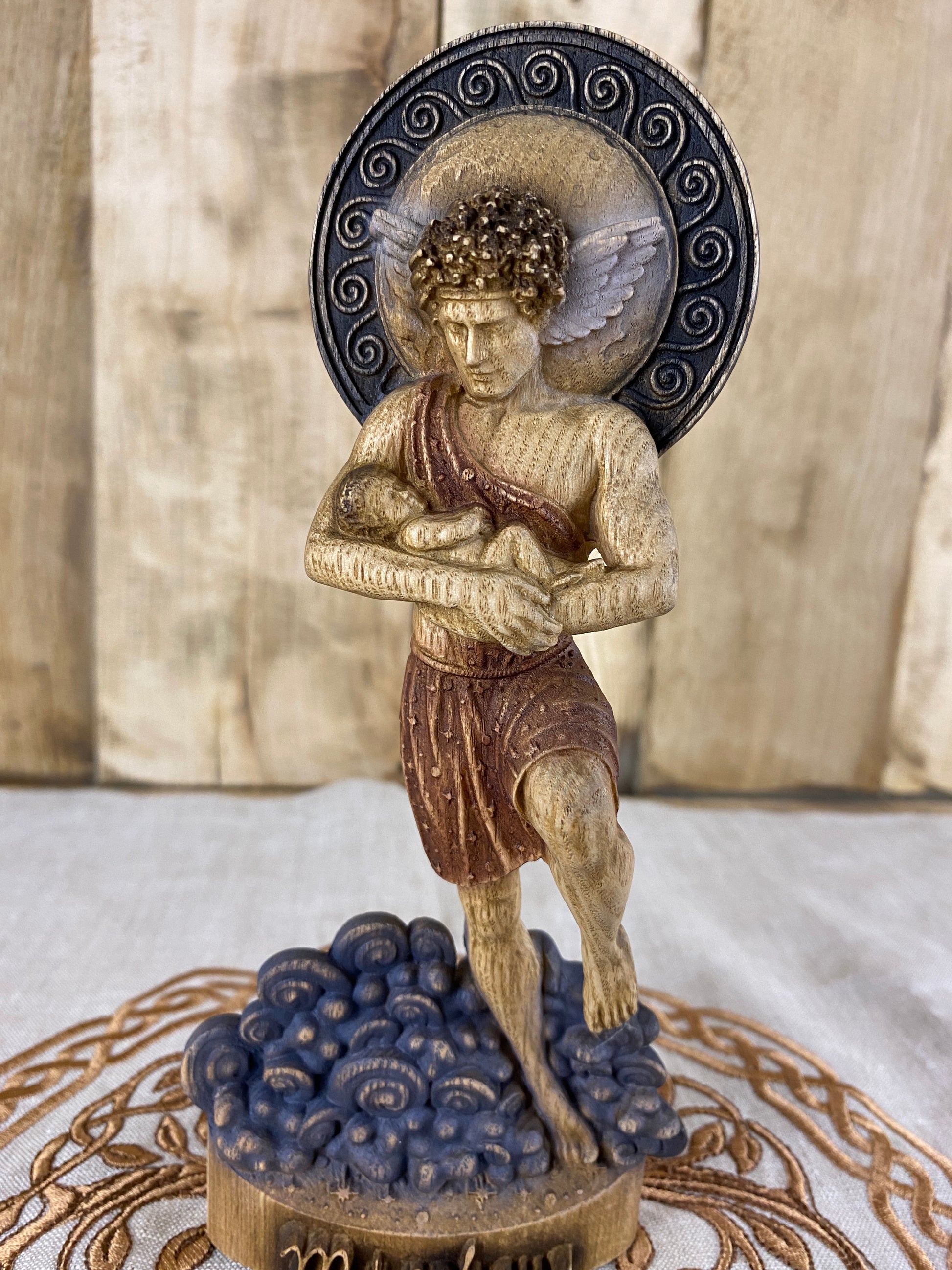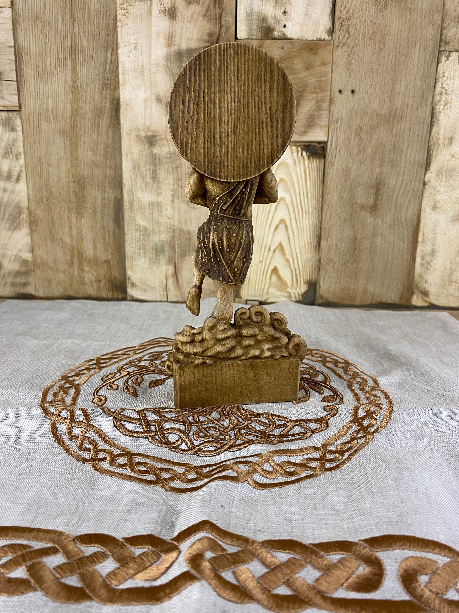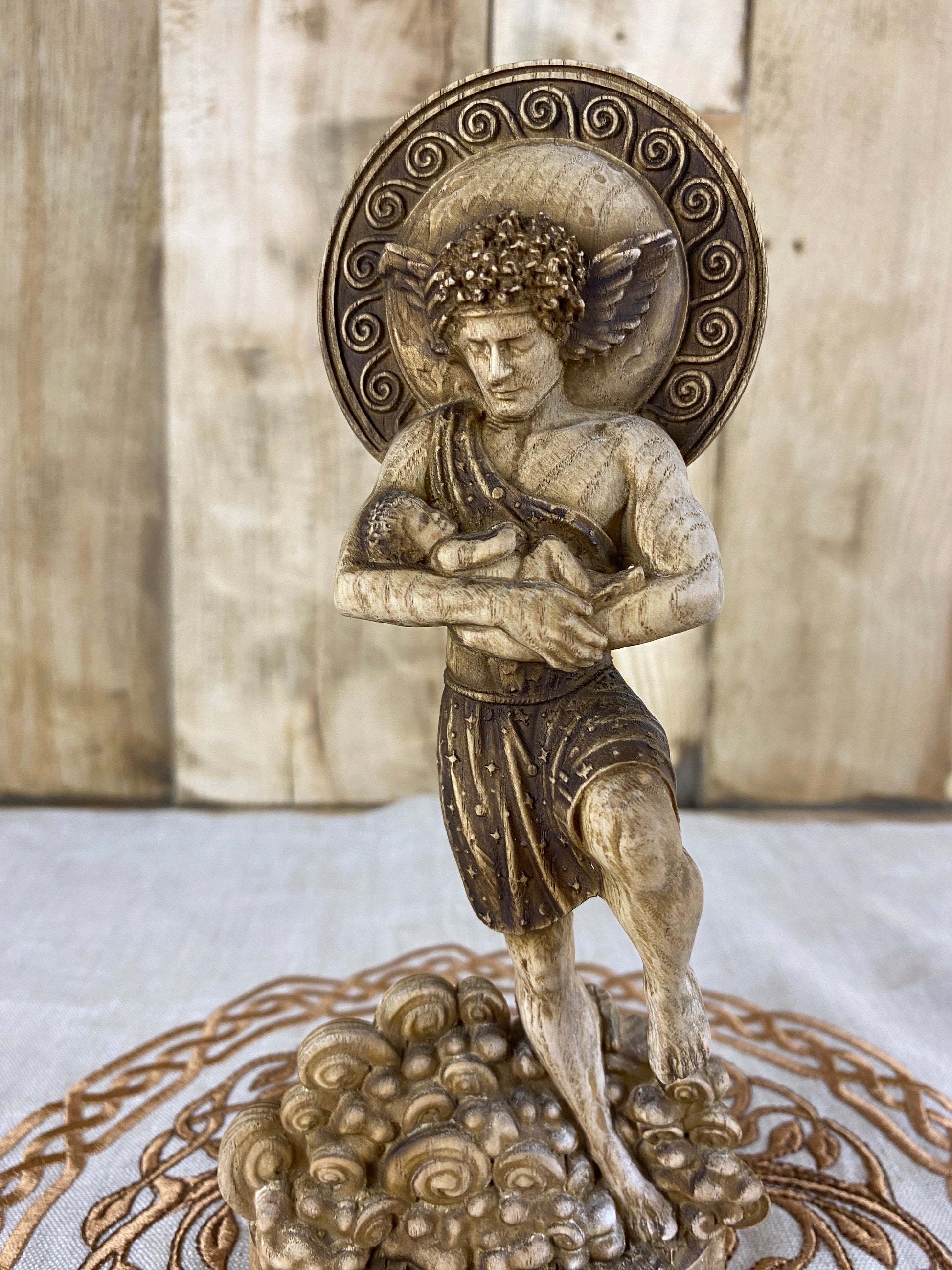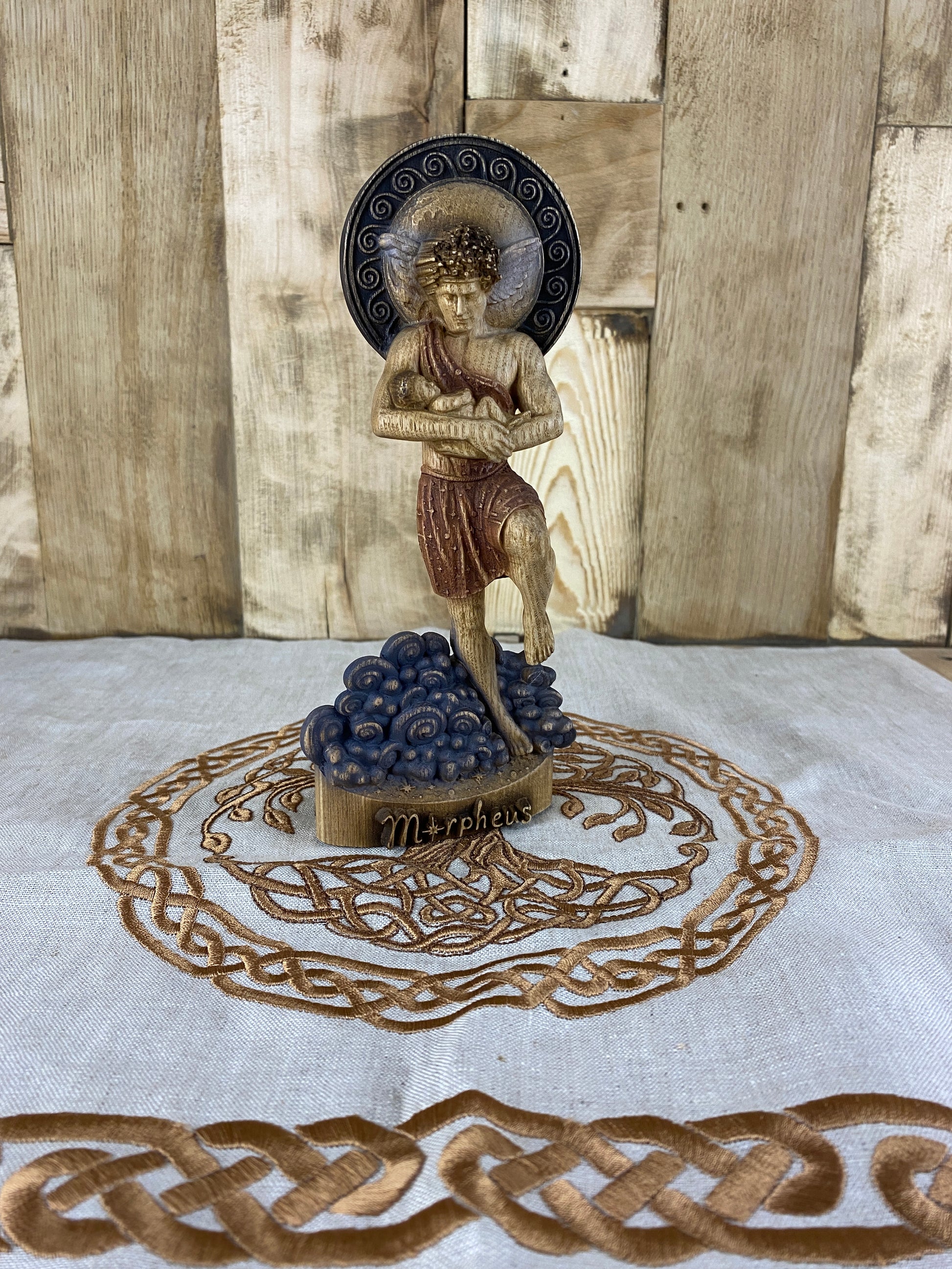 Unique wooden statue of the greek god Morpheus god with a Baby - Patron god of dreams.Introducing an exclusive wooden Morpheus statue - the greek god of dreams, holding a baby in his arms, symbolizing the innocence and purity of sleep. This meticulously carved piece is designed to add ancient greek art and greek mythology to your home greek wood decor or to be a meaningful gift for a special person.Natural wood with deep and warm shades was chosen, which ensures durability and aesthetic appeal. Each detail is carved with extreme attention to convey the gentleness of Morpheus' image and his care for the baby.The greek statue depicts Morpheus as a gentle patron of dreams, and the baby symbolizes a new beginning and the endless possibilities that sleep brings.The greek sculpture of the god Morpheus is a work of art that brings an aura of peace and relaxation to your home. It is ideal for placing in a bedroom or meditation space where every glance at it will remind you of the importance of sleep and rest. It is an excellent choice for collectors of unique interior items, as well as for those who are looking for a special gift with a deep symbolic meaning.