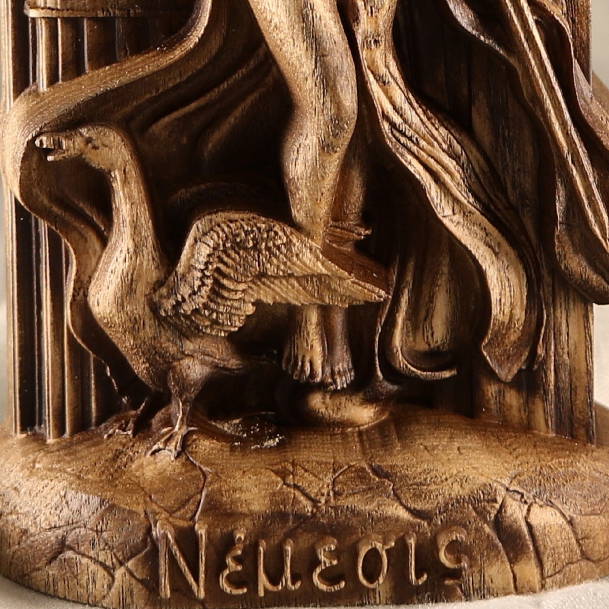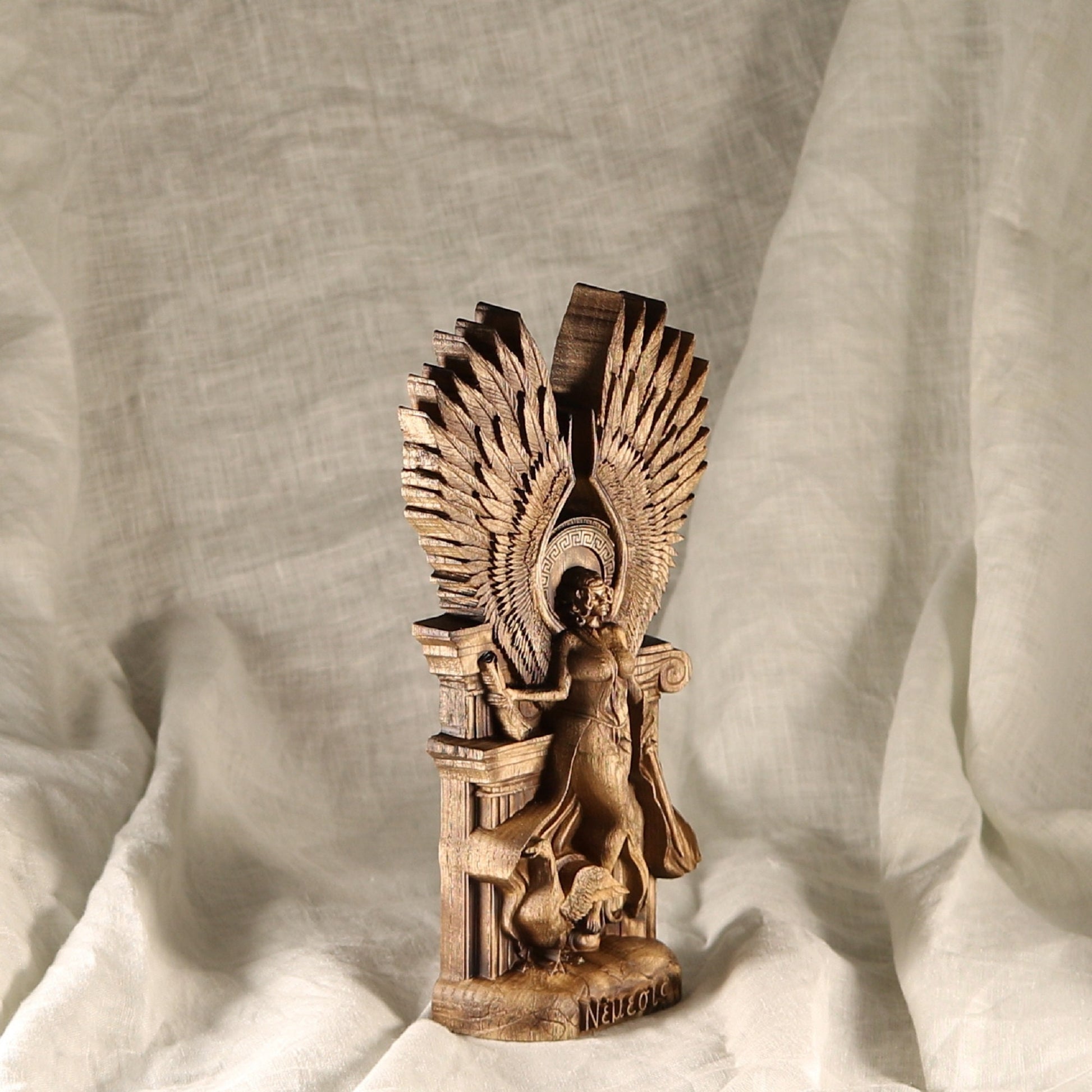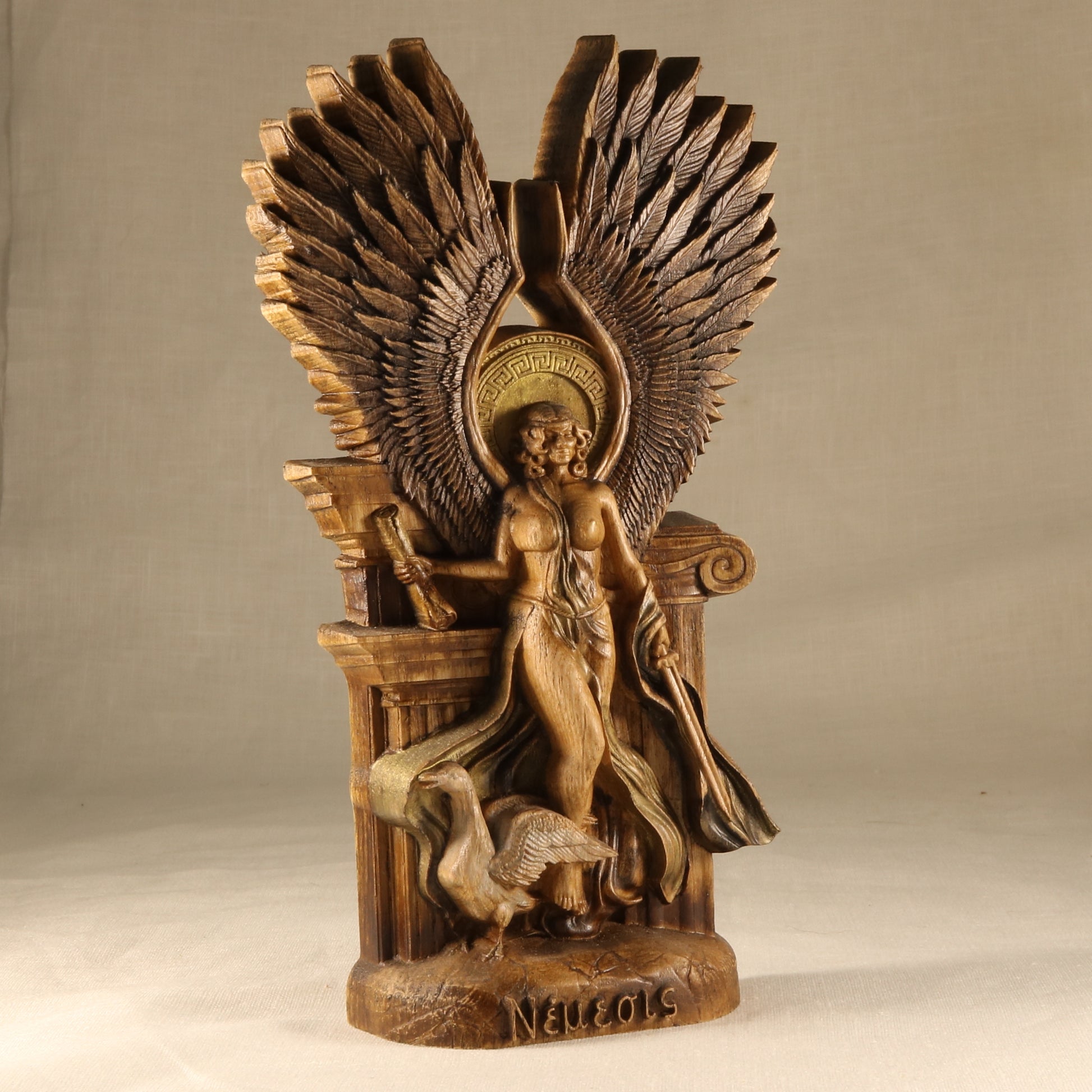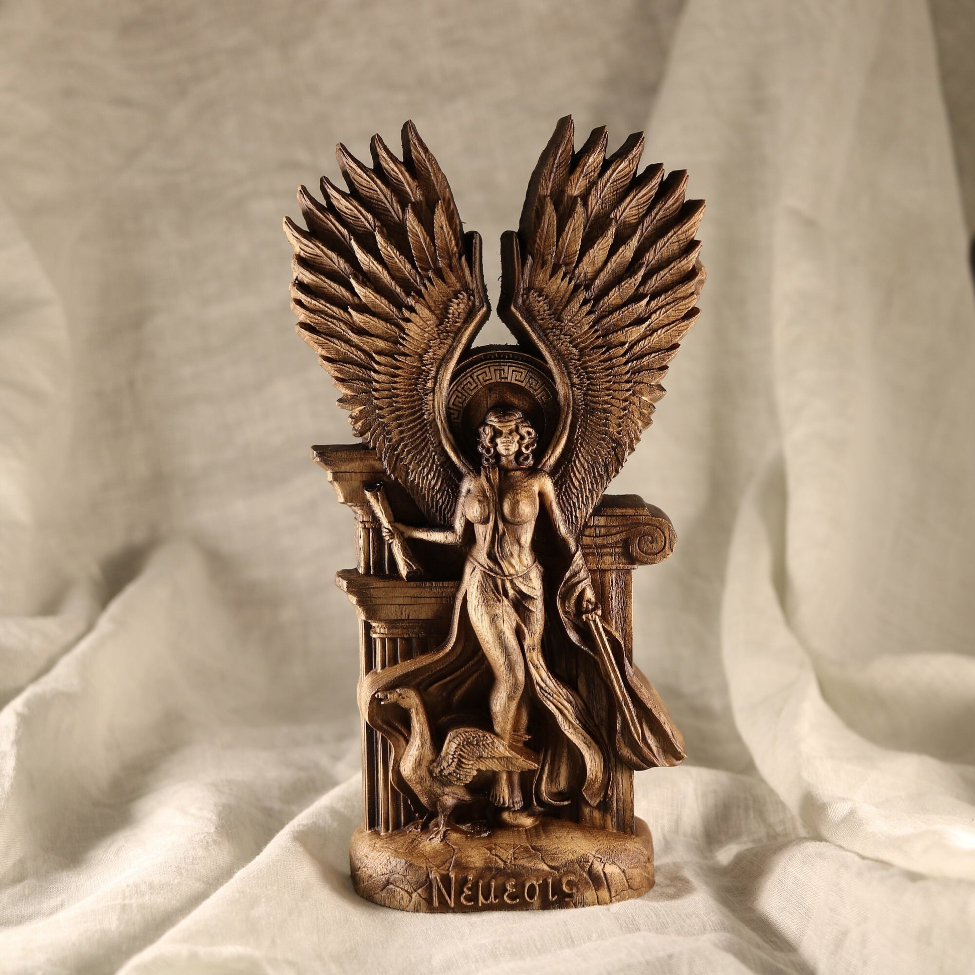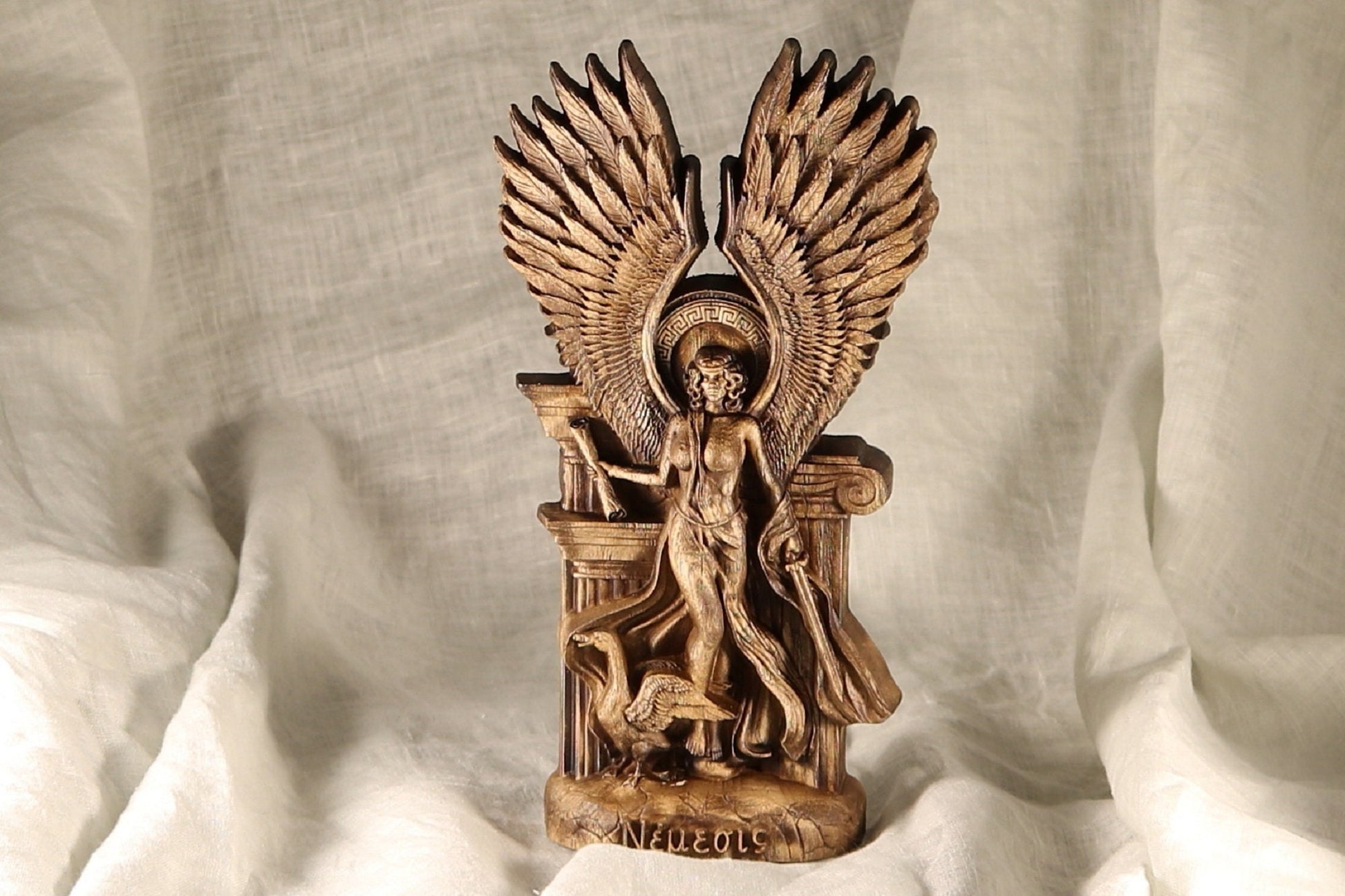 Nemesis, the Greek goddess of vengeance, is now available in statue form! This handmade wooden carving is made from ecological materials and has been varnished for a long-lasting finish. Standing approximately 8 inches tall, this impressive statue is sure to make a statement in any home or office. Nemesis was known for her ability to seek revenge on those who wronged her, so why not add this powerful goddess to your decor and let her work her magic?