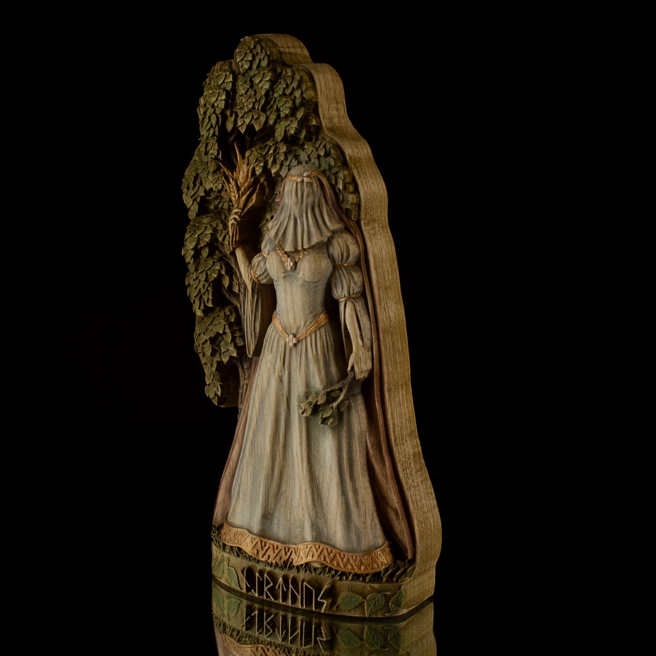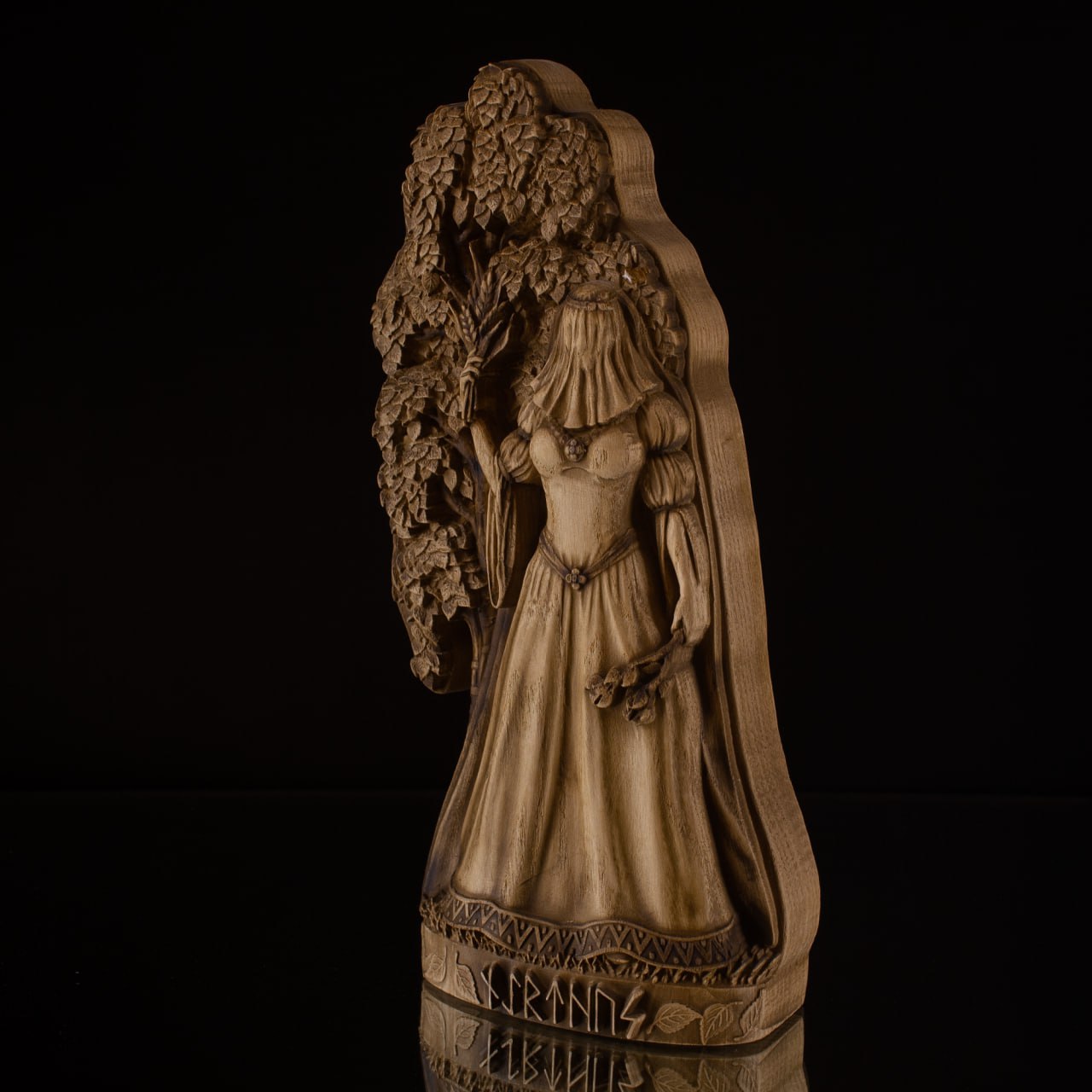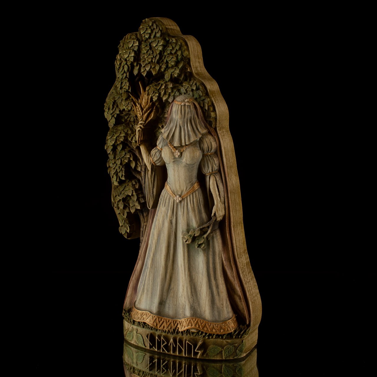 This exquisite wood sculpture is meticulously crafted with attention to detail, showcasing the craftsmanship and artistic skill of the sculptor. Each curve, expression, and embellishment is thoughtfully rendered, capturing the essence of Nerthus' gentle yet powerful presence.