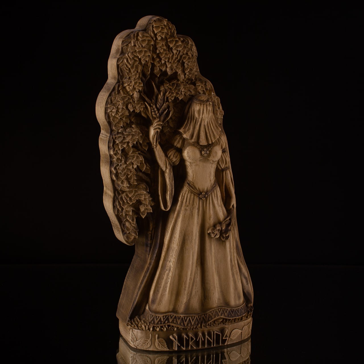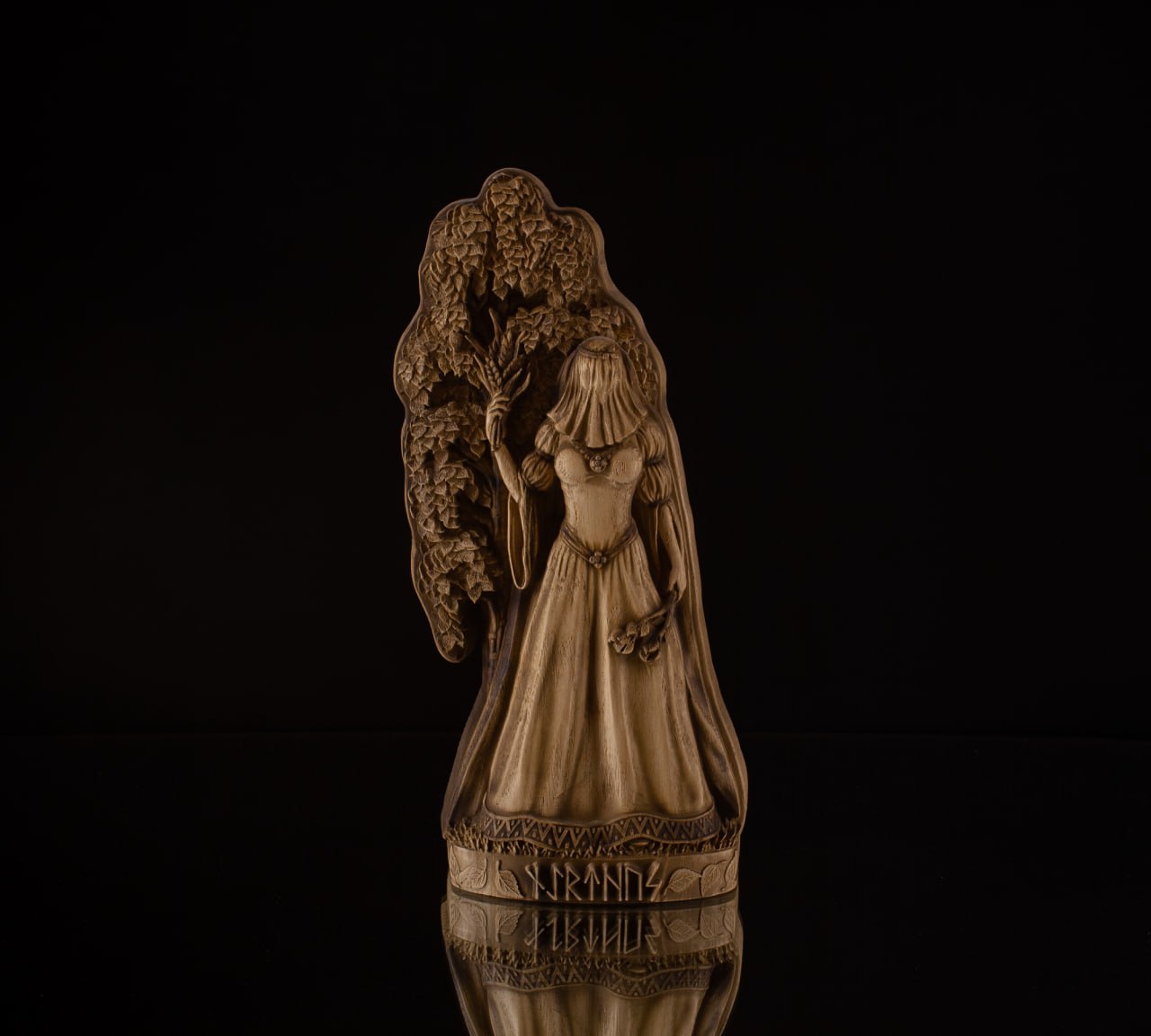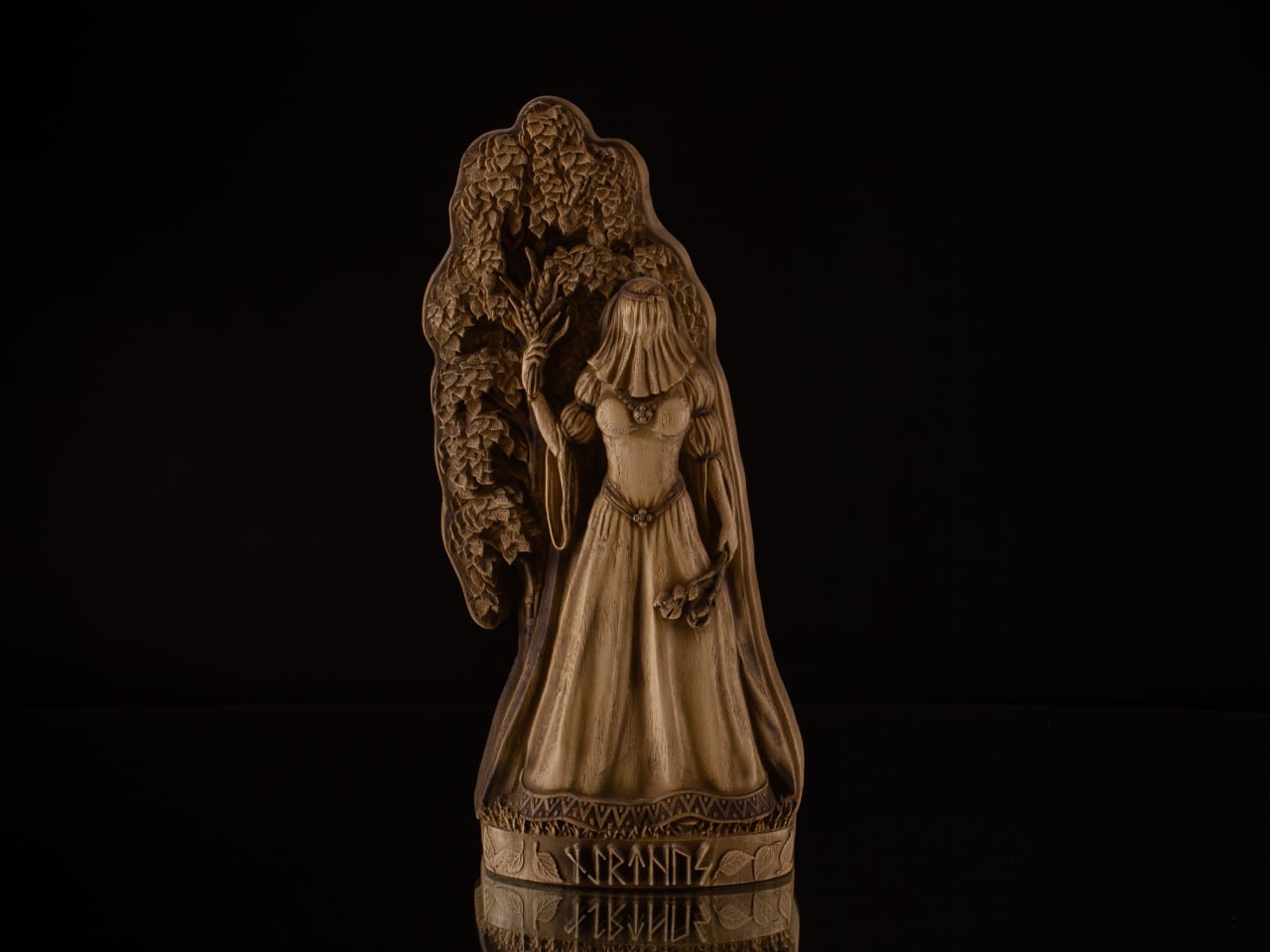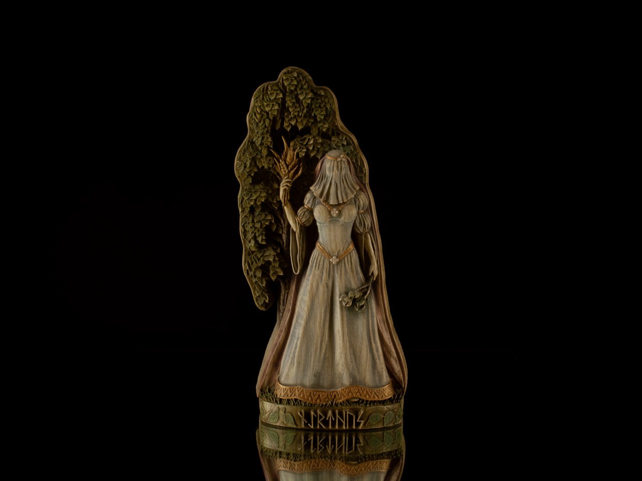 This exquisite wood sculpture is meticulously crafted with attention to detail, showcasing the craftsmanship and artistic skill of the sculptor. Each curve, expression, and embellishment is thoughtfully rendered, capturing the essence of Nerthus' gentle yet powerful presence.