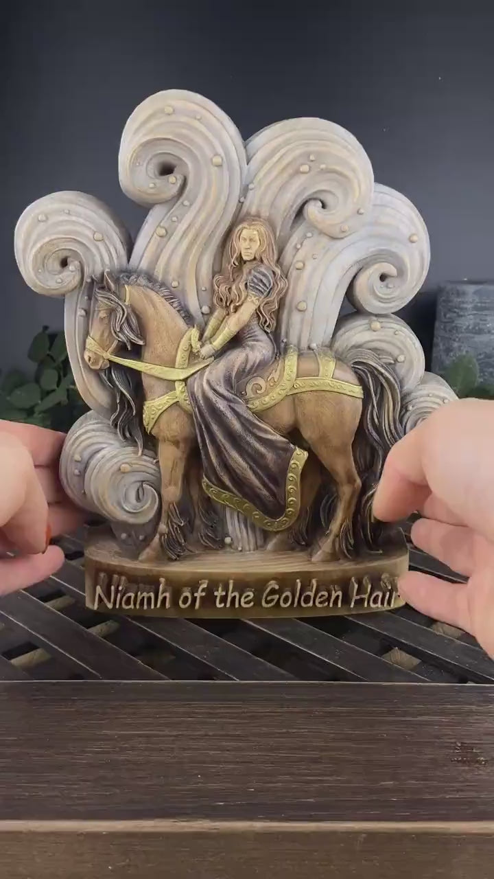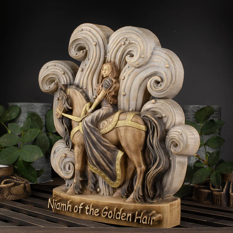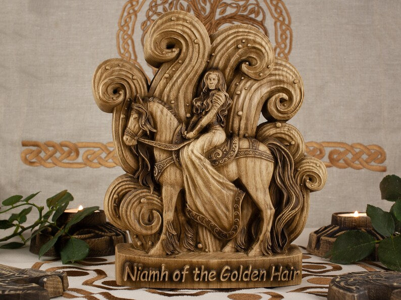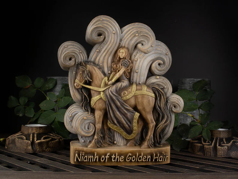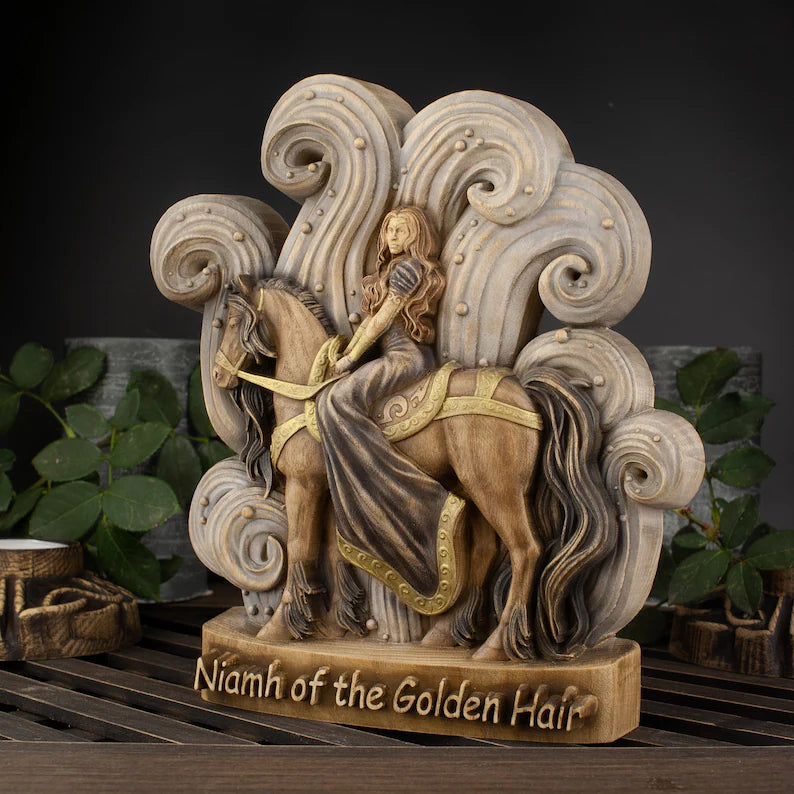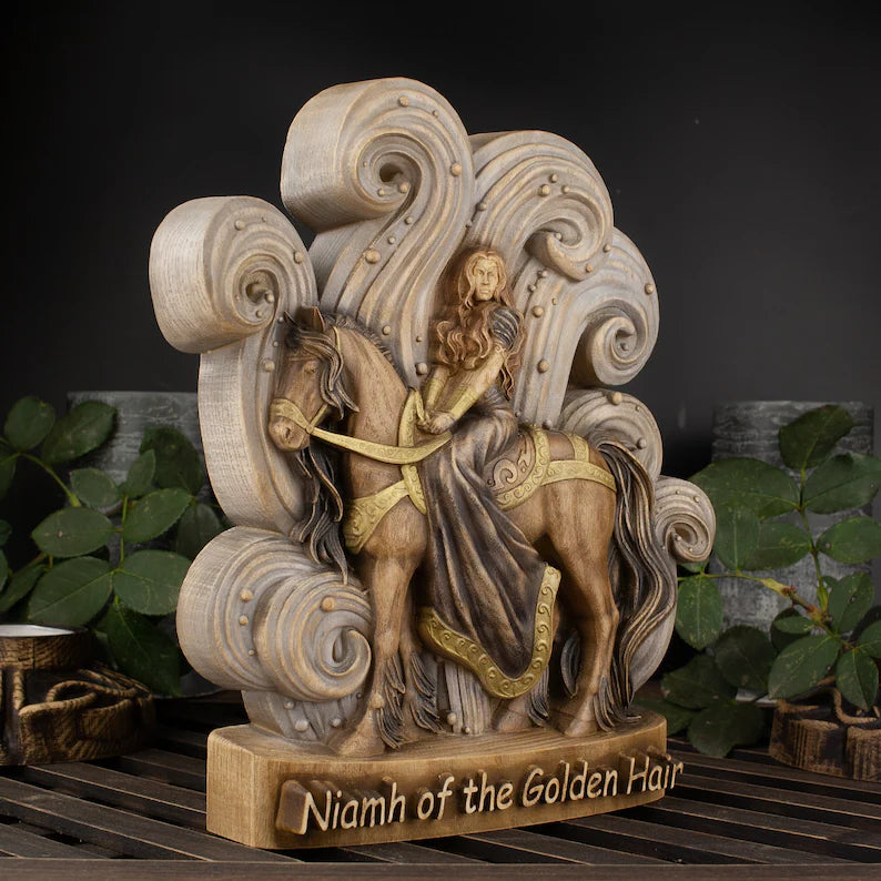 Discover the allure of Irish mythology with our exquisite Niamh of the Golden Hair statue. This 8-inch tall, 7-inch wide, and 1.5-inch deep statuette, crafted from eco-friendly ash wood and finished with a protective varnish, brings to life the enchanting tale of Niamh, a renowned figure from the rich tapestry of Irish folklore. Known for her lustrous golden hair, Niamh symbolizes divinity, nature, and her mystical ties to the sea. This piece, intricately detailed, celebrates her role in the timeless story of love and adventure with Oisín, set in the magical land of Tír na nÓg.