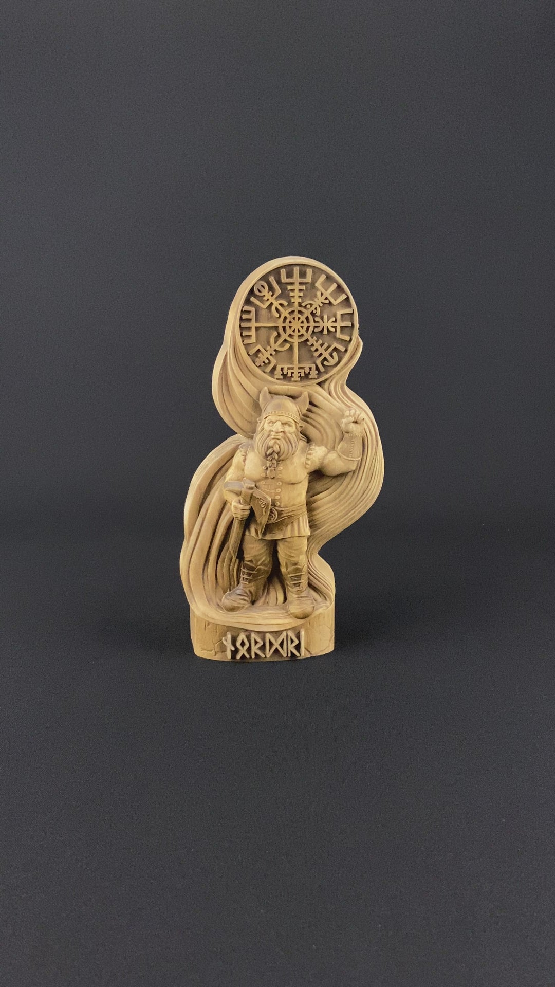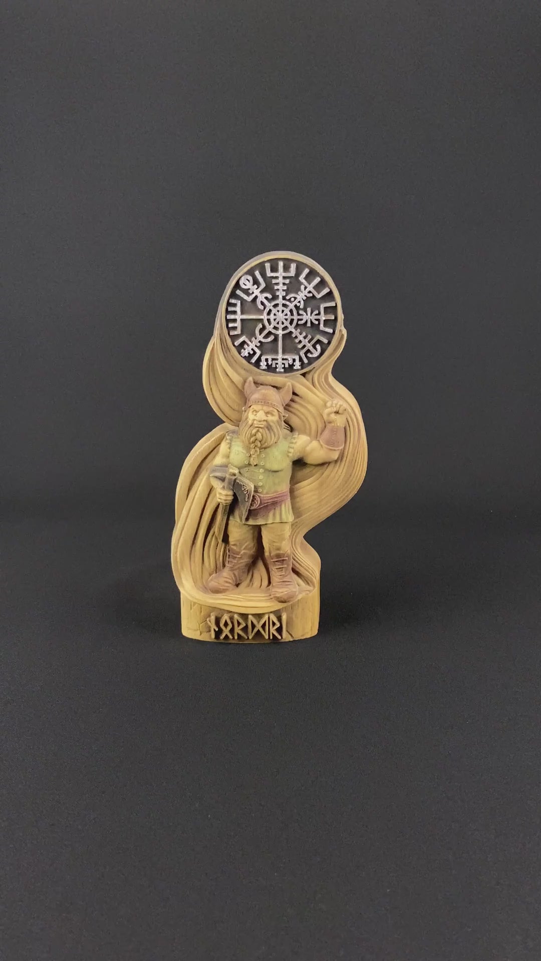 The 'Nordri' statuette features delicate details and a unique character, capturing the magic and mythical allure of gnomes from Scandinavian legends. Each instance of this statuette is unique, with distinct wood textures and tones.