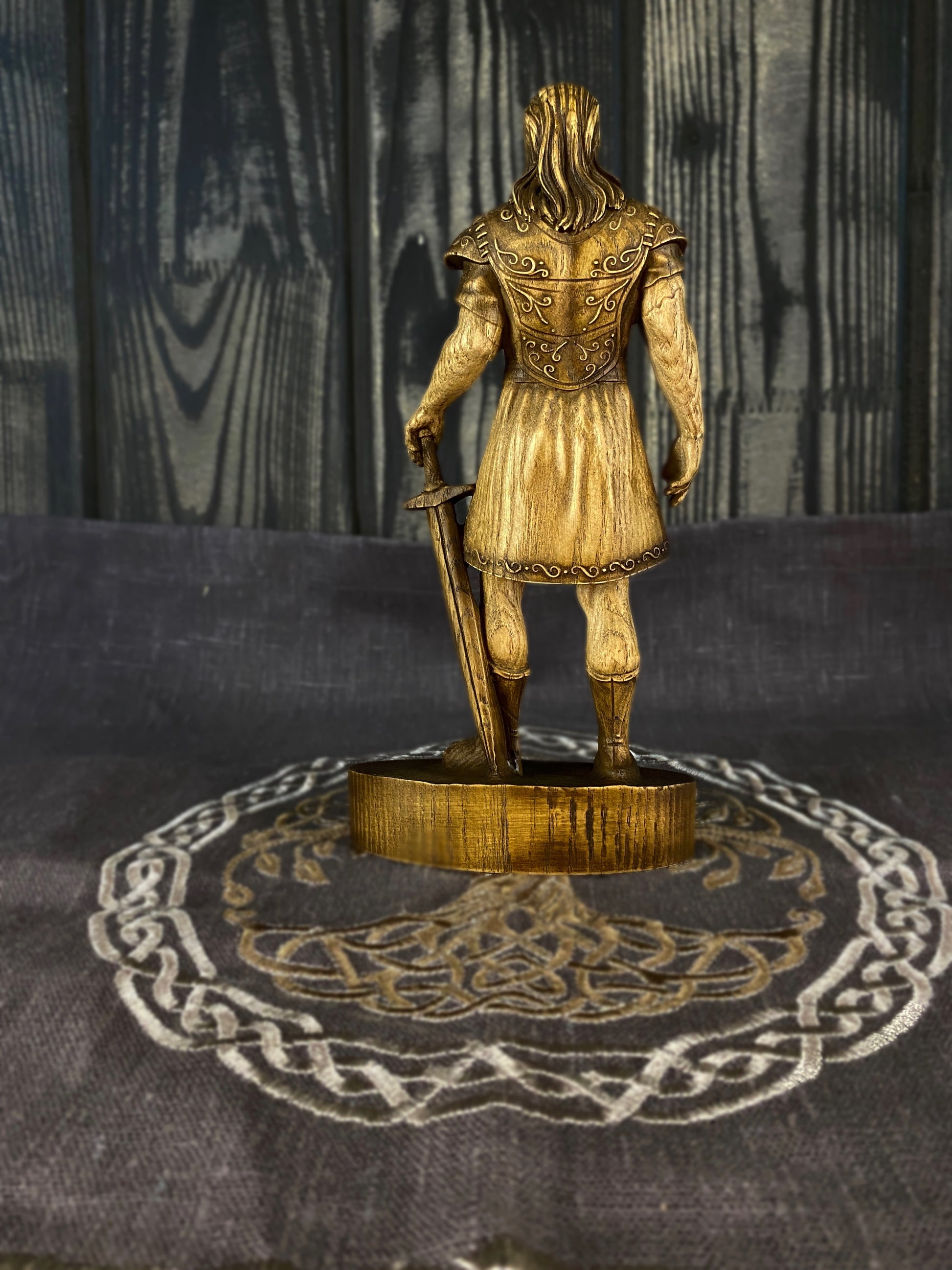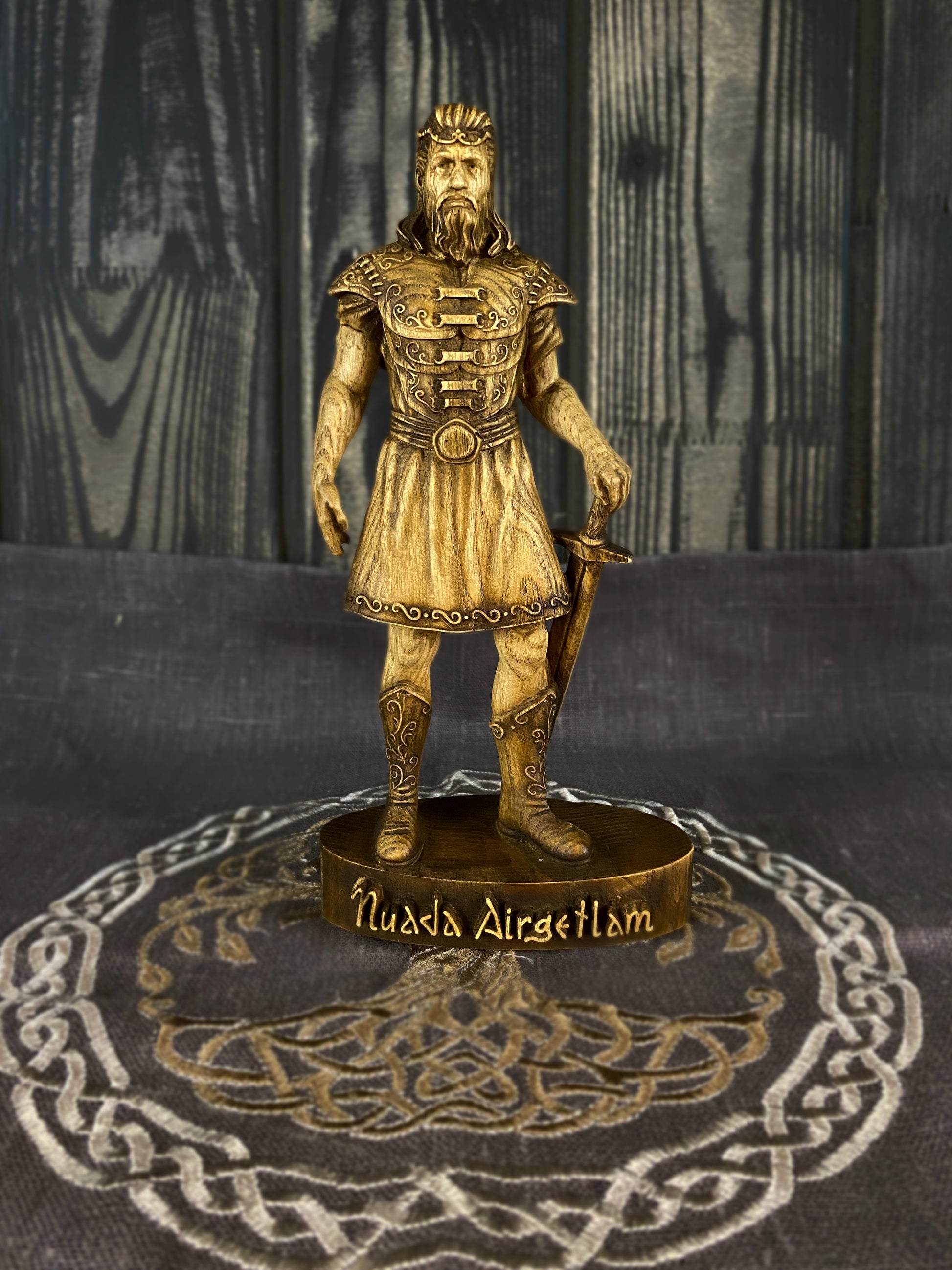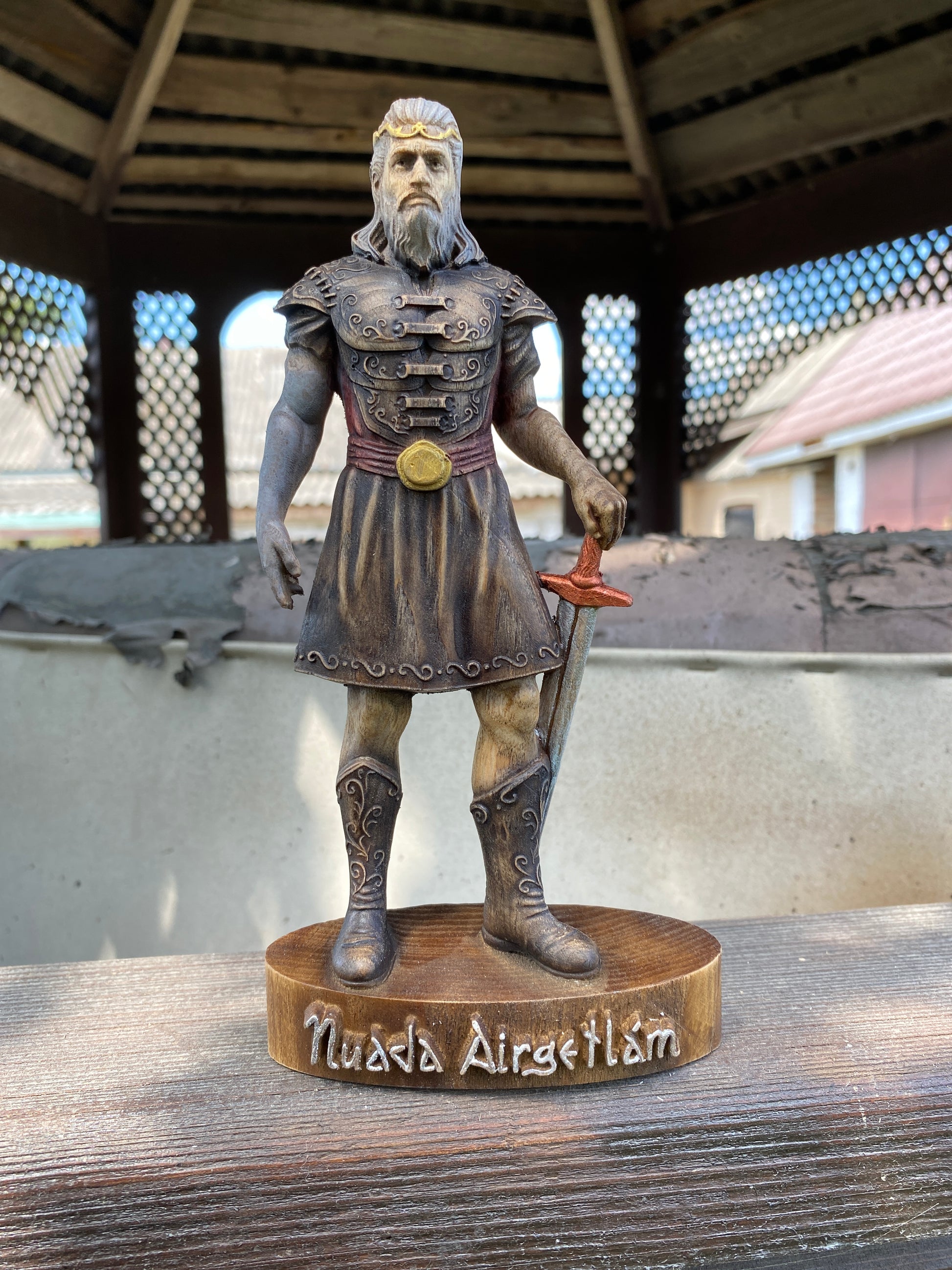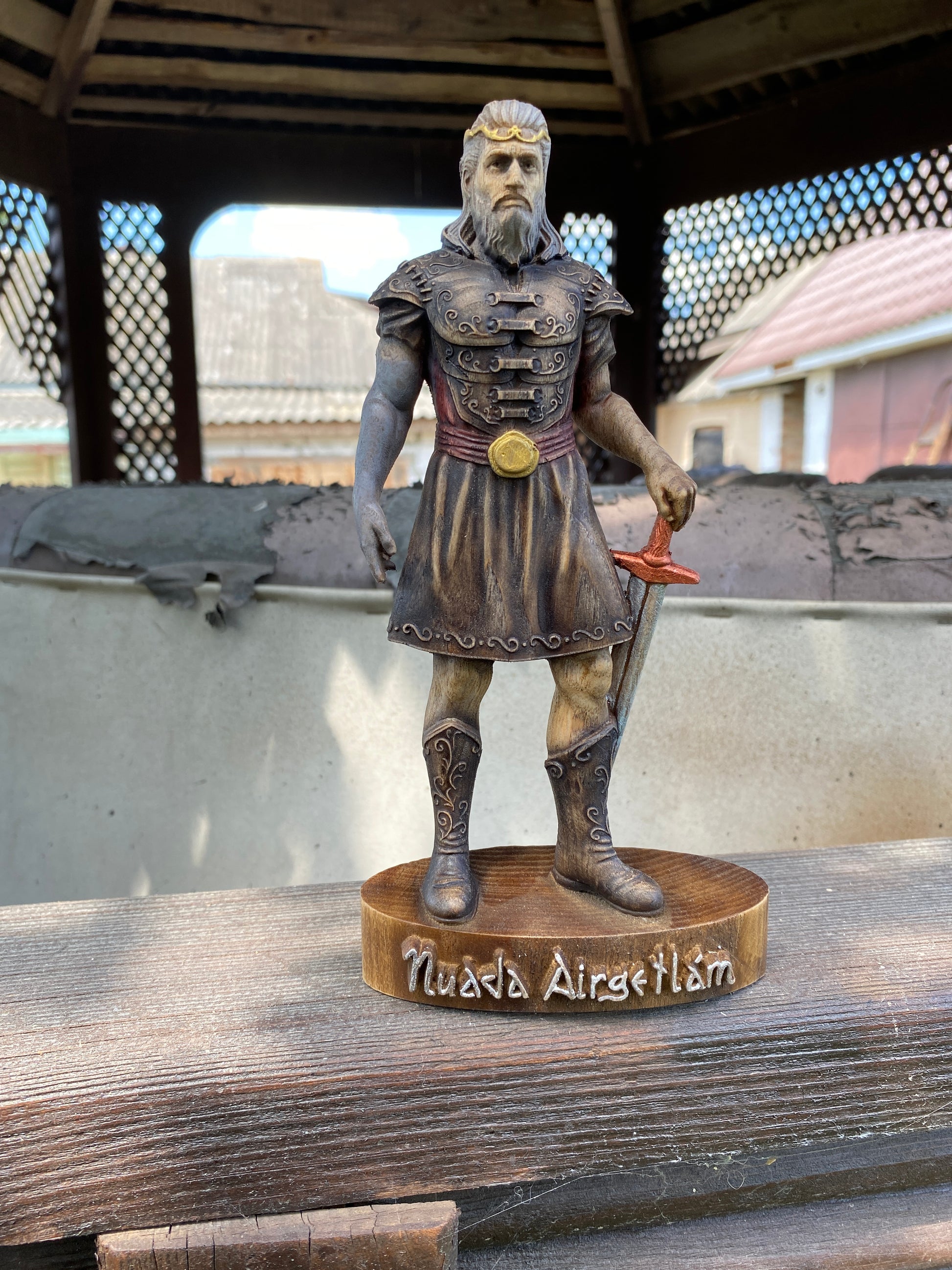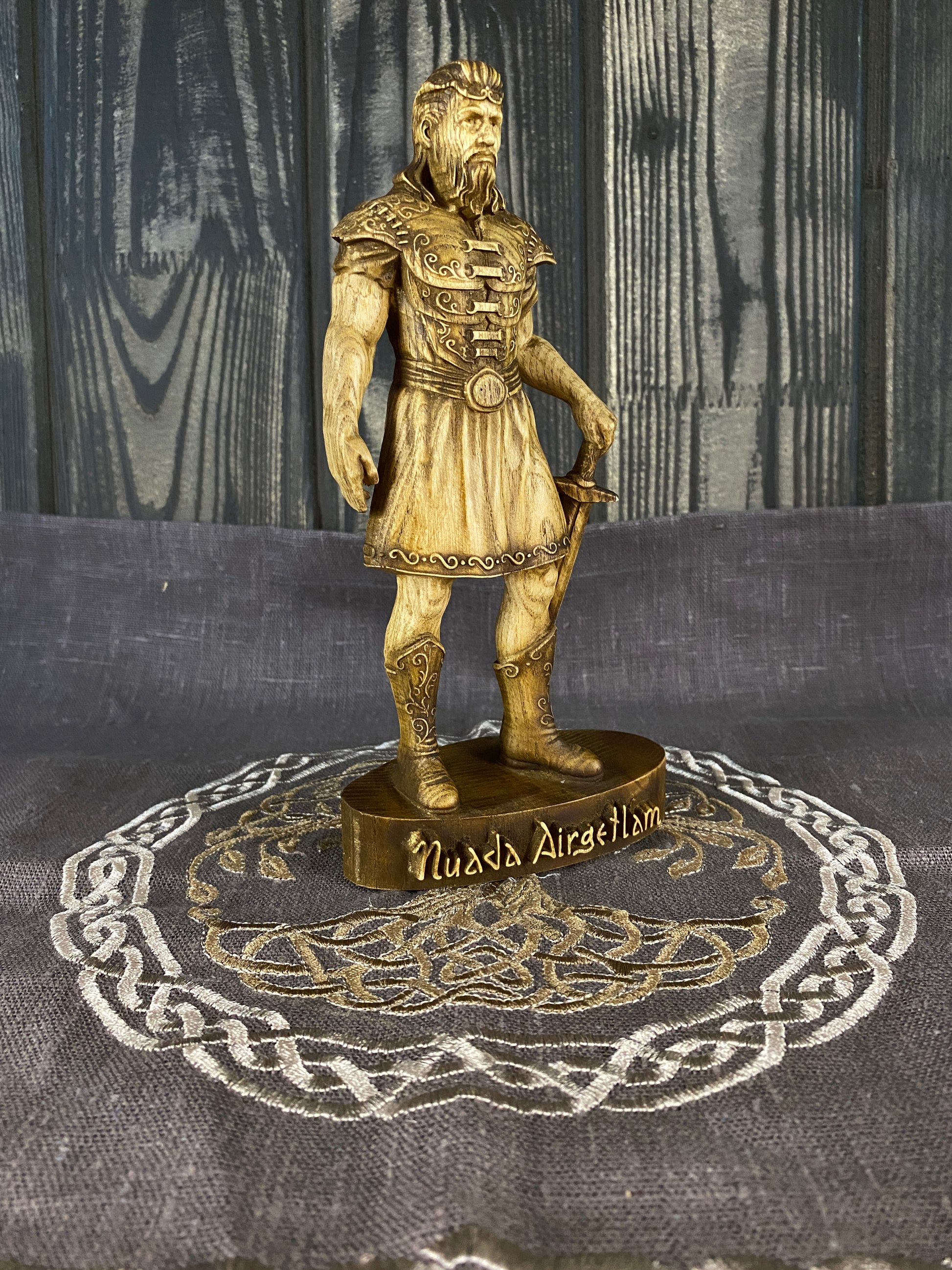 Wooden carved statue of the Irish god hellboy Nuada - a symbol of wisdom and power! This fascinating carved statue depicts god nuada, the great god of irish mythology. It is made of natural wood and embodies the symbolism of wisdom, justice and military skill. Every detail of this pagan gods statue is carefully crafted by the hands of a master craftsman, giving it a special uniqueness and artistry.This celtic gods nuada statue has a unique design and details that give it an elegant and mystical look. It depicts pagan statue nuada with a silver prosthetic hand symbolizing his wisdom and magical power. Every part of the irish gods statue is carefully crafted with love for detail.The goddess figurine is made of natural wood, which gives it a natural warmth and organic look. The wooden material gives the wood carved statue special stability and durability. The nuada statue is carved by hand by a professional craftsman, which guarantees high quality and uniqueness of each work. Every detail of the statuette offers exquisite carving and expresses the craftsmanship of the artwork.